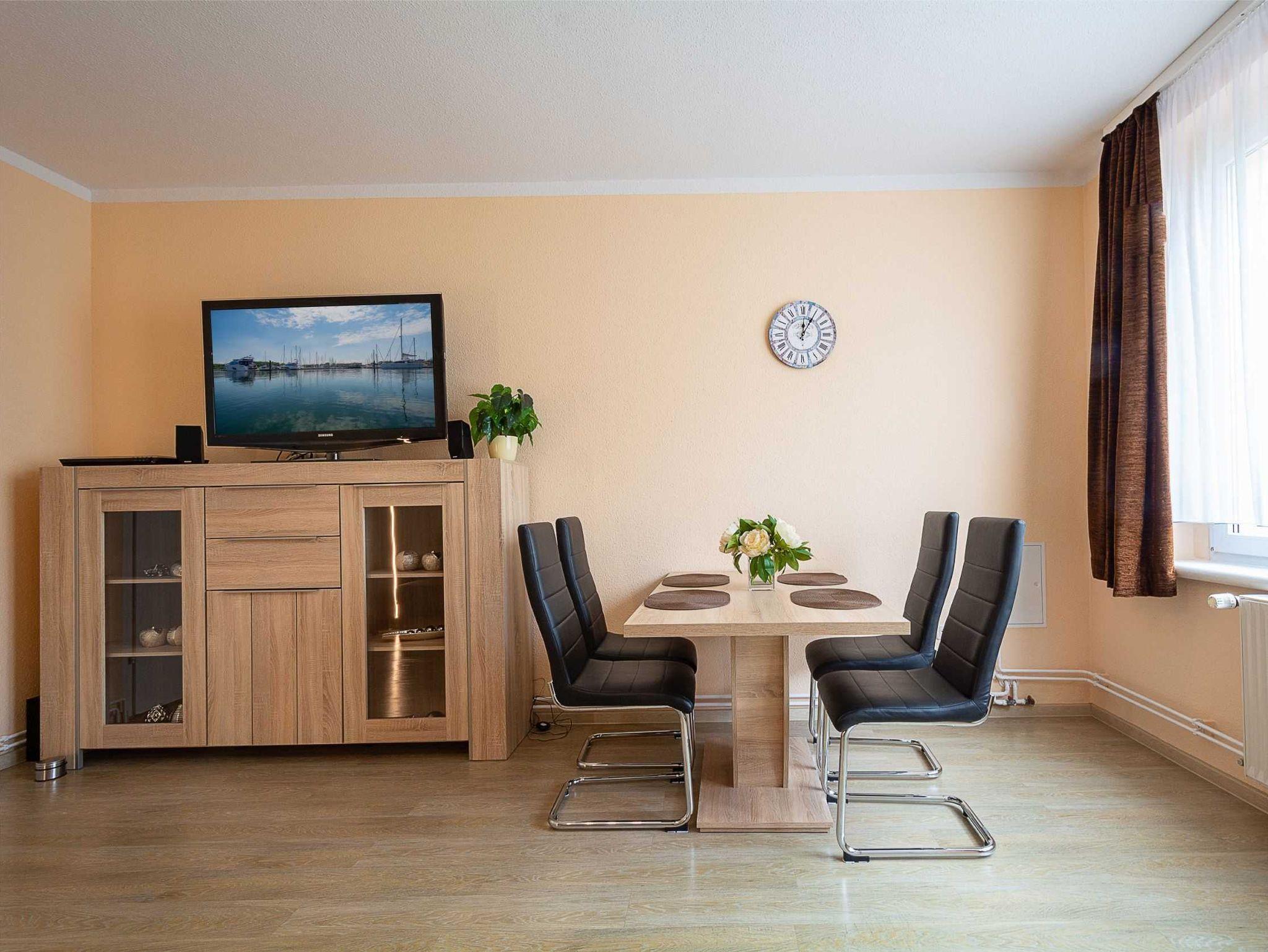 Die liebevoll eingerichtete 2-Raum-Ferienwohnung ist 60qm groß, bietet Platz für bis zu 2 Personen und befindet sich im Erdgeschoss eines Mehrfamilienhauses im Ostseebad Kühlungsborn. Die helle freundliche Wohnung verfügt über ein Wohnzimmer mit gemütlicher Couchgarnitur, einer Essecke sowie einem 43-Zoll-Flachbild-TV und Blueray-Player. Die separate Küche ist ausgestattet mit allen wichtigen Küchengeräten und Utensilien, die Sie für Ihren Urlaub benötigen, wie bspw. Herd mit Backofen und Dunstabzugshaube, Geschirrspüler, Kühlschrank, Wasserkocher, Kaffeemaschine und Toaster. Das gemütliche Schlafzimmer mit Doppelbett (180 cm x 200 cm) und großem Kleiderschrank sowie das moderne Bad mit Dusche und WC runden das Gesamtbild dieser Wohnung ab.