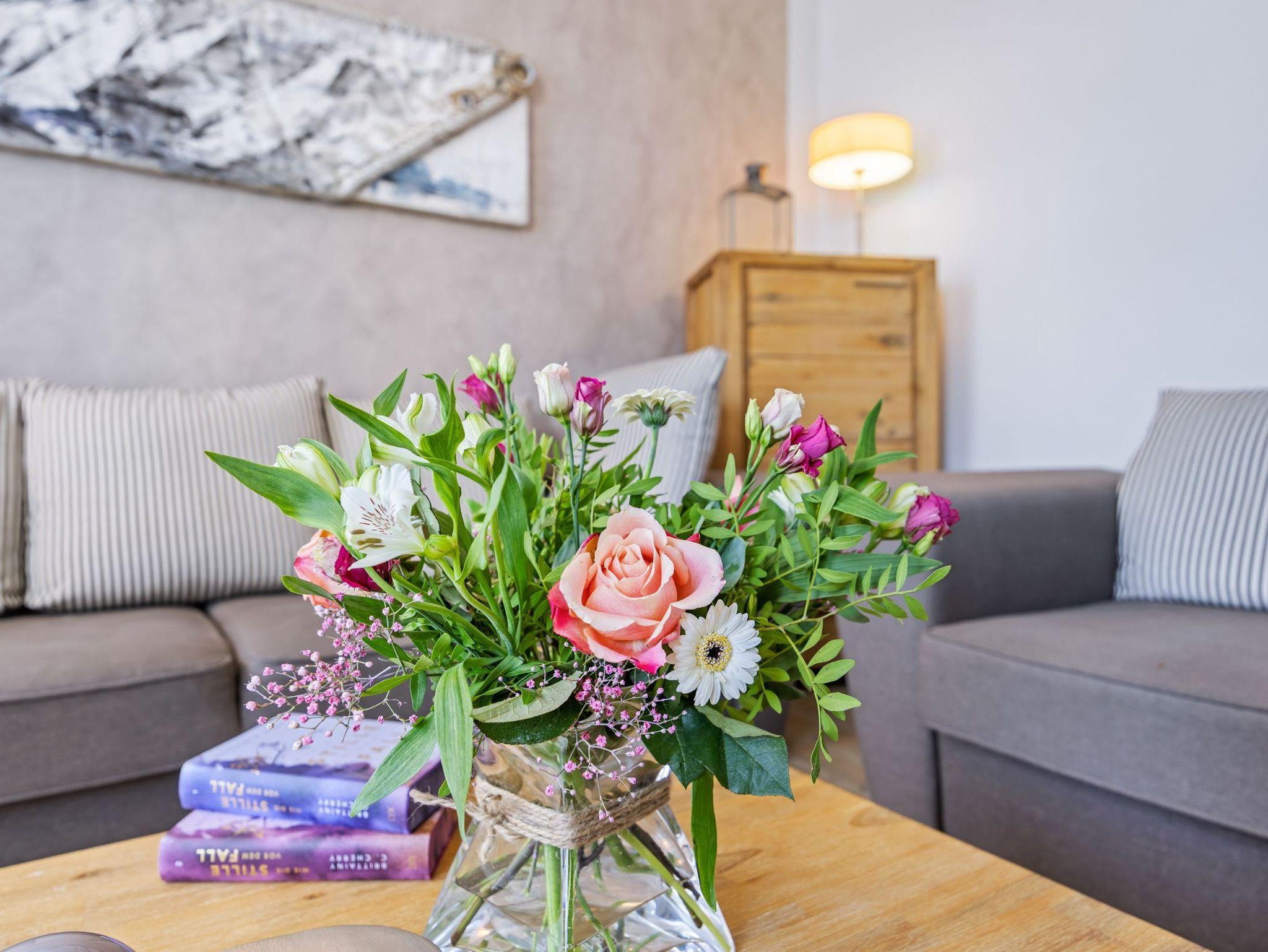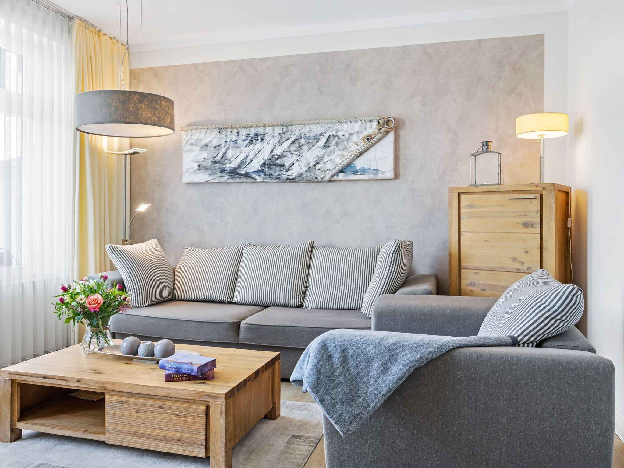 Das Wohnzimmer mit gemütlicher Sitzecke und TV lädt zum Entspannen und gemütlichen Beisammensein ein. Ein Schlafzimmer mit Doppelbett, Kleiderschrank und Zugang zum möblierten Balkon. Ein weiteres Schlafzimmer mit Einzelbett und Kleiderkommode. Die Schlafzimmer sind ruhig, klar und hochwertig eingerichtet. Bad mit ebenerdiger Dusche und WC.
