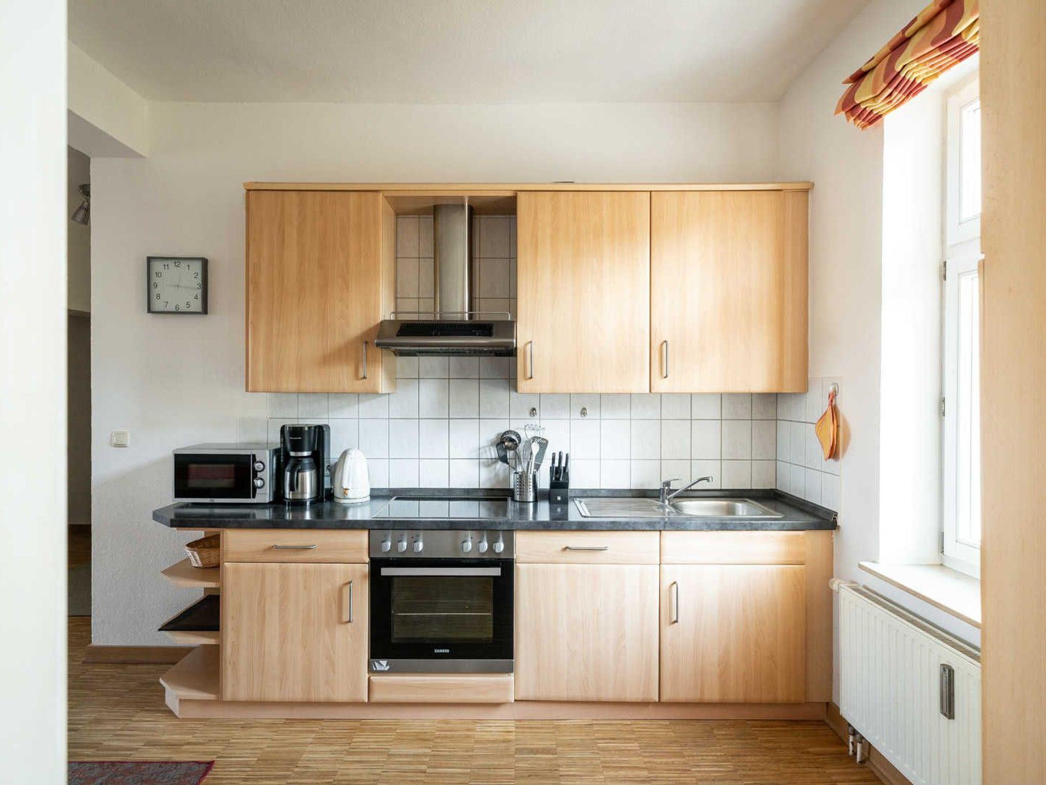 Die sonnendurchflutete Wohnung mit großer, offener Küche mit Spülmaschine, Kühlschrank, Backofen, Herd, Mikrowelle, Kaffeemaschine, Toaster und Wasserkocher hat einen wunderschönen überdachten Balkon, auf dem man sich bis in die späten Abendstunden von der Ostseesonne verwöhnen lassen kann.