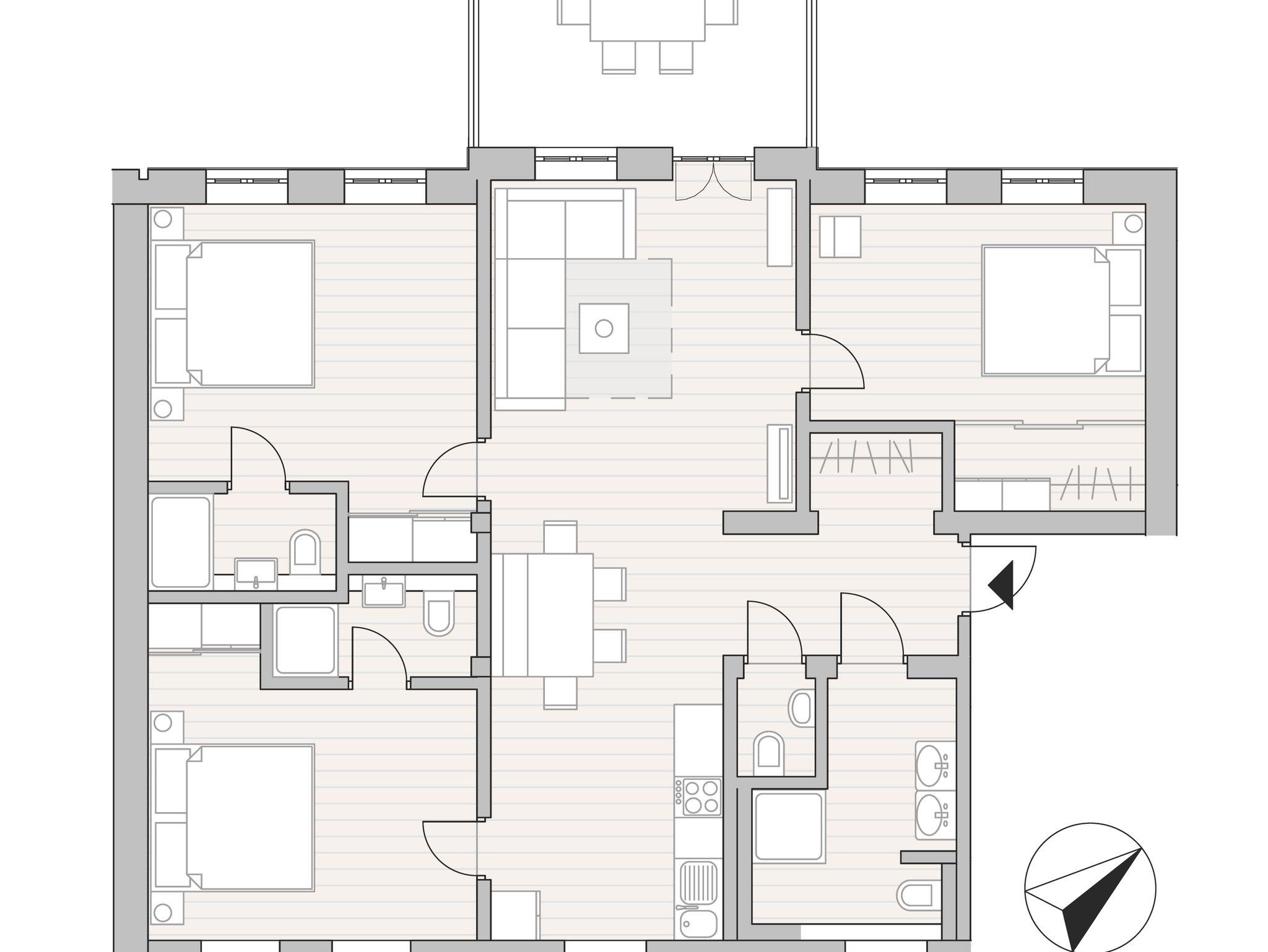 Ferienwohnung mit großem Wohn-/ Essraum mit Doppelbett-Schlafsofa und 3 separaten Schlafzimmenn mit Doppelbett. Bad, separates WC und großer Balkon im 1. OG. Aufzug und Tiefgaragenstellplätze vorhanden.