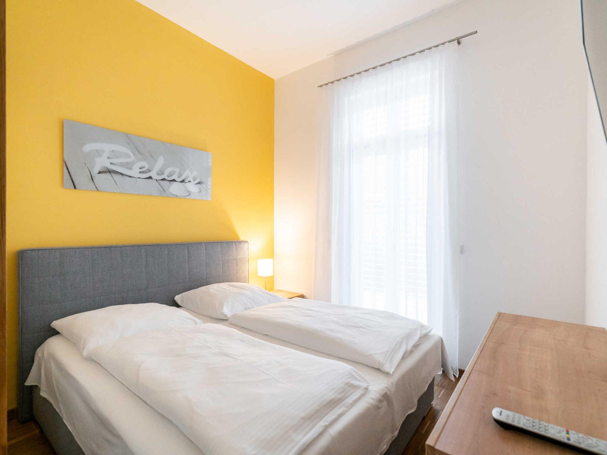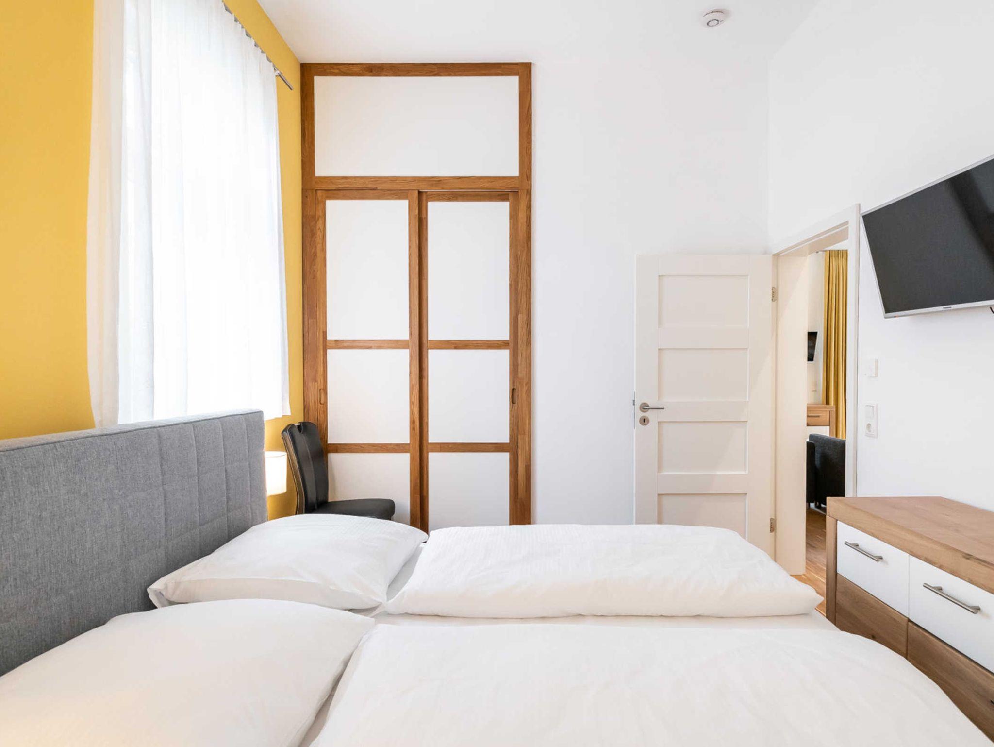 Ferienwohnung mit Wohn-/ Essraum mit Doppelbett-Schlafsofa und 2 separaten Schlafzimmenn mit Doppelbett. 2 Bäder und große Terrasse im Erdgeschoß. Tiefgaragenstellplatz vorhanden.
