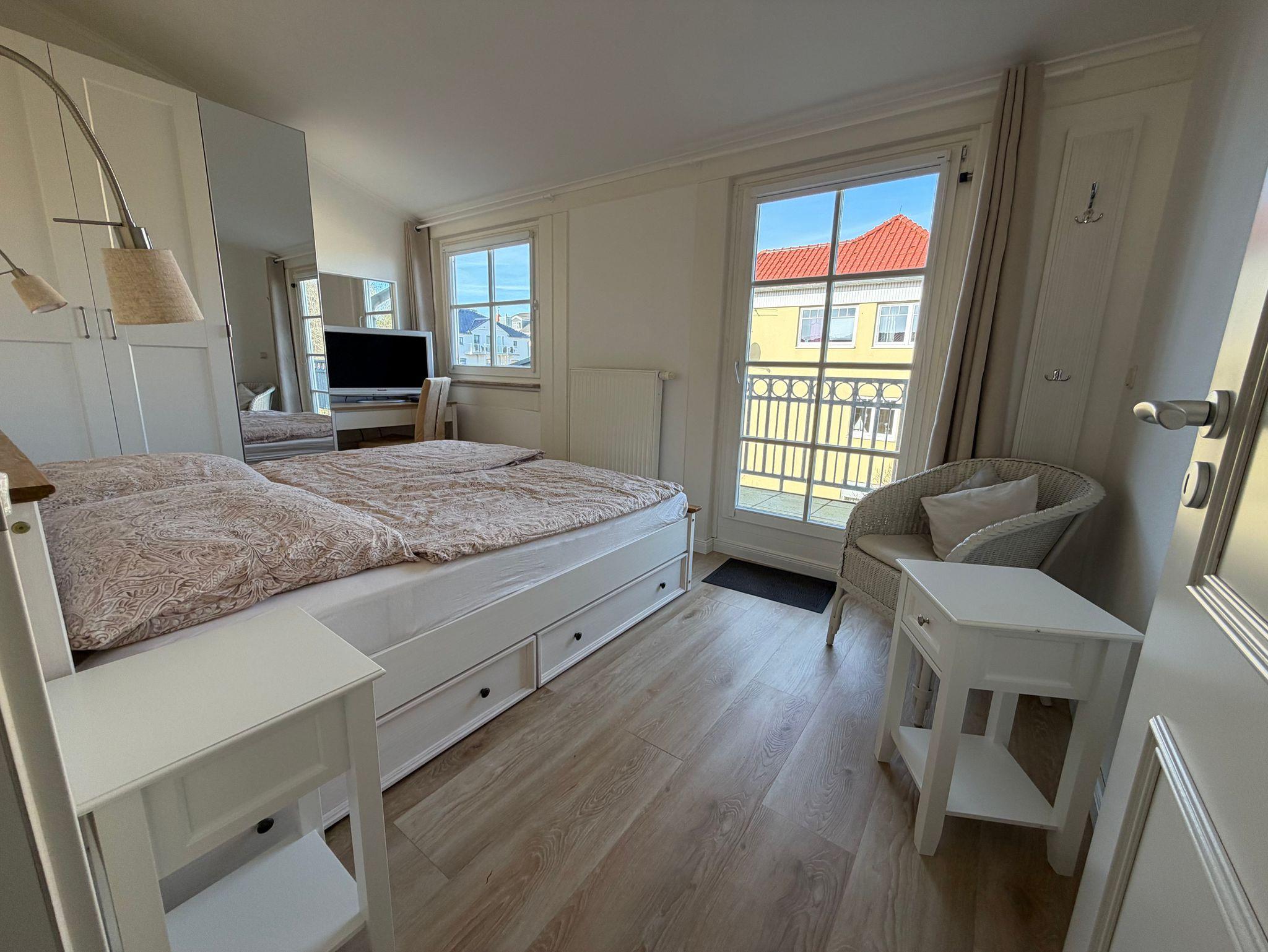 In den beiden Schlafzimmern laden Sie jeweils Sie ein komfortables Doppelbett (2 x 90cm x 200 cm) zur Nachtruhe ein. Die geräumigen Kleiderschränke bieten genügend Platz für Ihre Urlaubsgarderobe. Von beiden Schlafzimmern können Sie die großen langgezogen Rundum-Balkon betreten, der von der gesamten Nordseite bis auf die halbe Ostseite reicht. Von hier können Sie den Tag zum Frühstück in der Morgensonne starten.