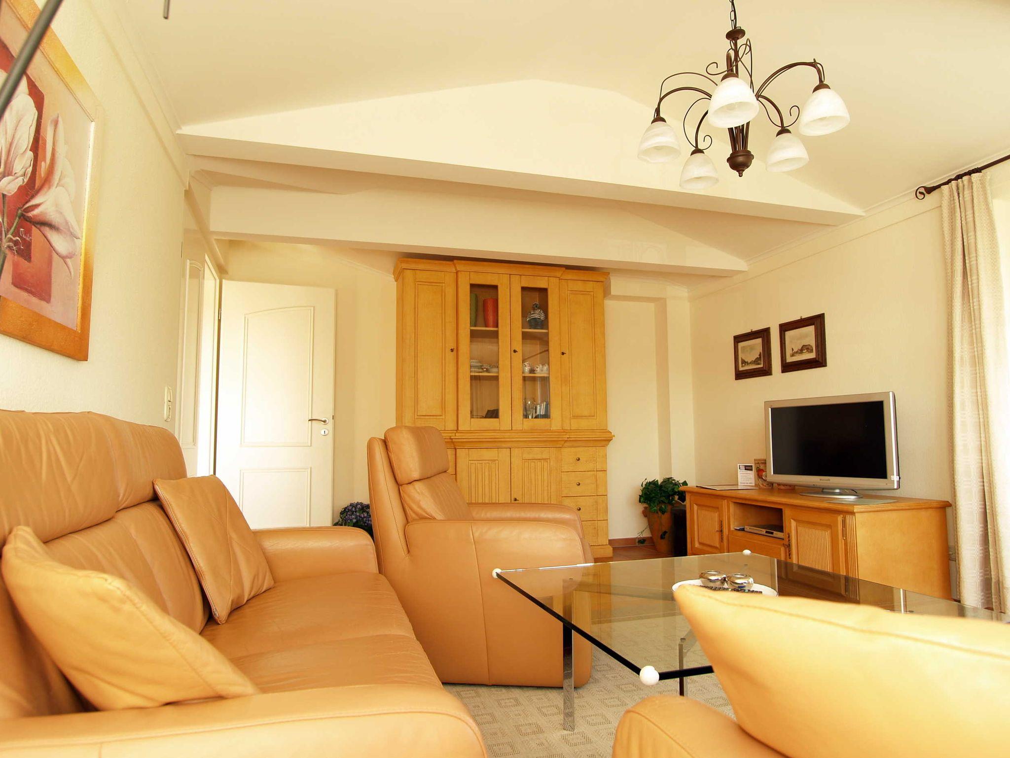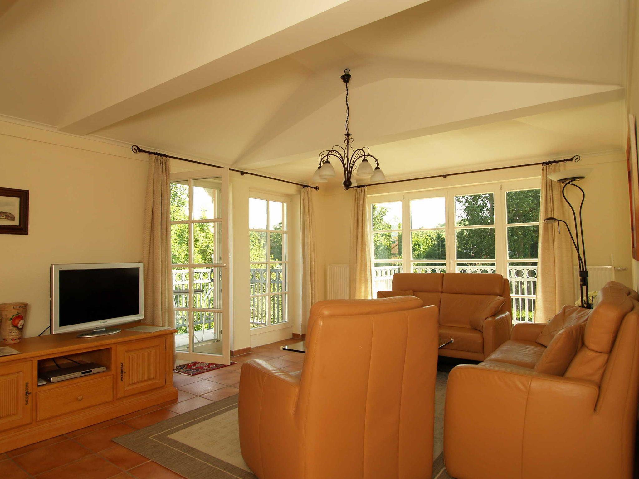 Der gemütliche Wohnbereich ist mit einer hochwertigen Ledercouch-Garnitur, eine Stereoanlage sowie ein 32-Zoll-Flatscreen-TV. Von hier betreten Sie den kleinen Ost-Balkon und den Süd-Balkon.