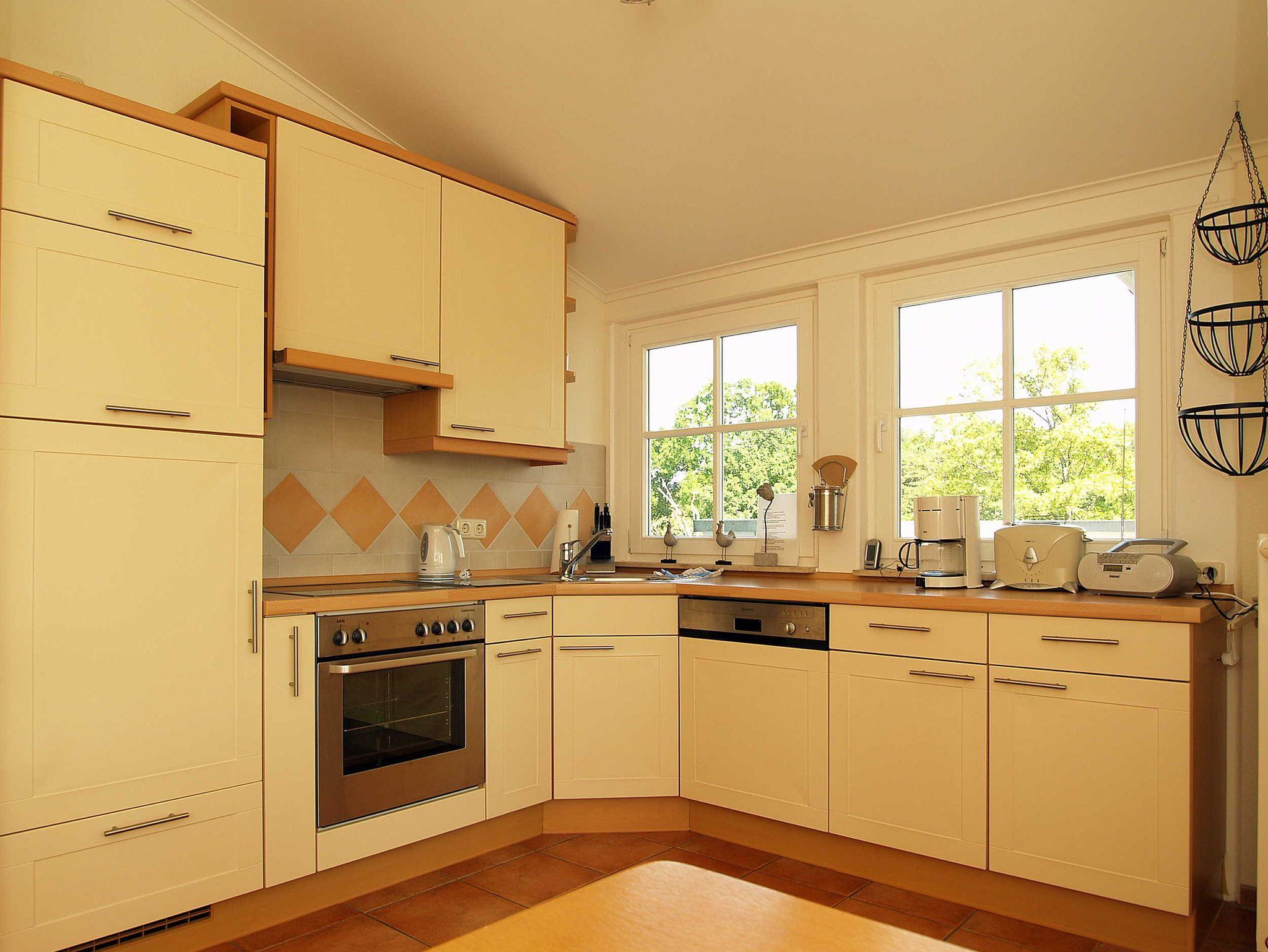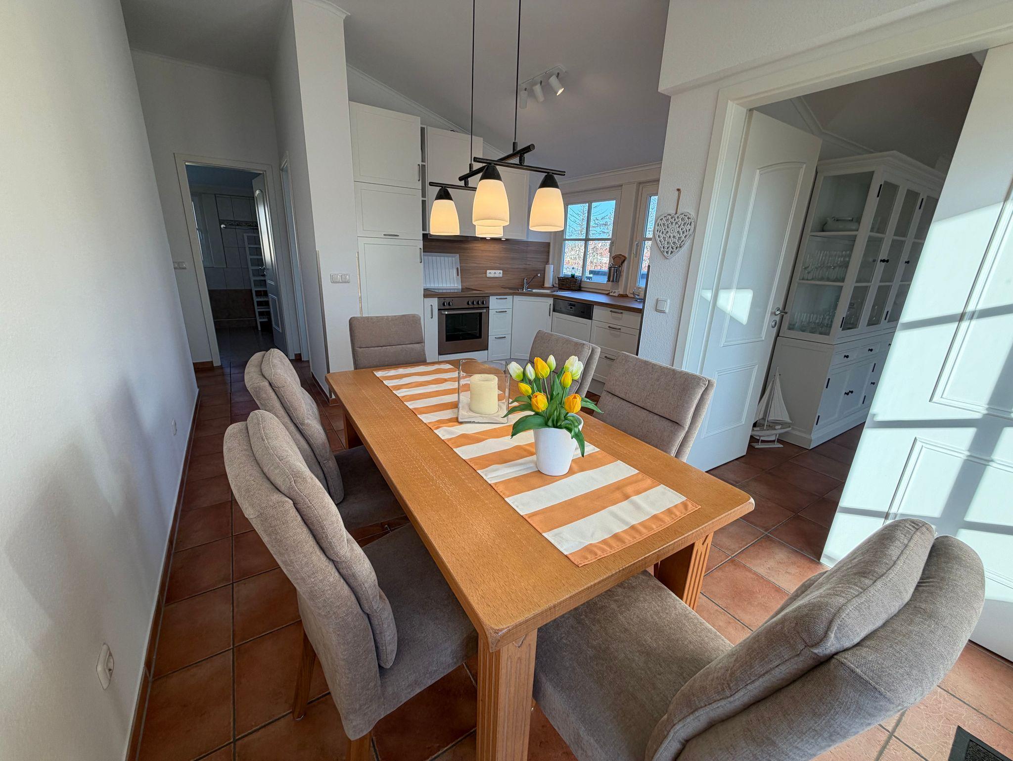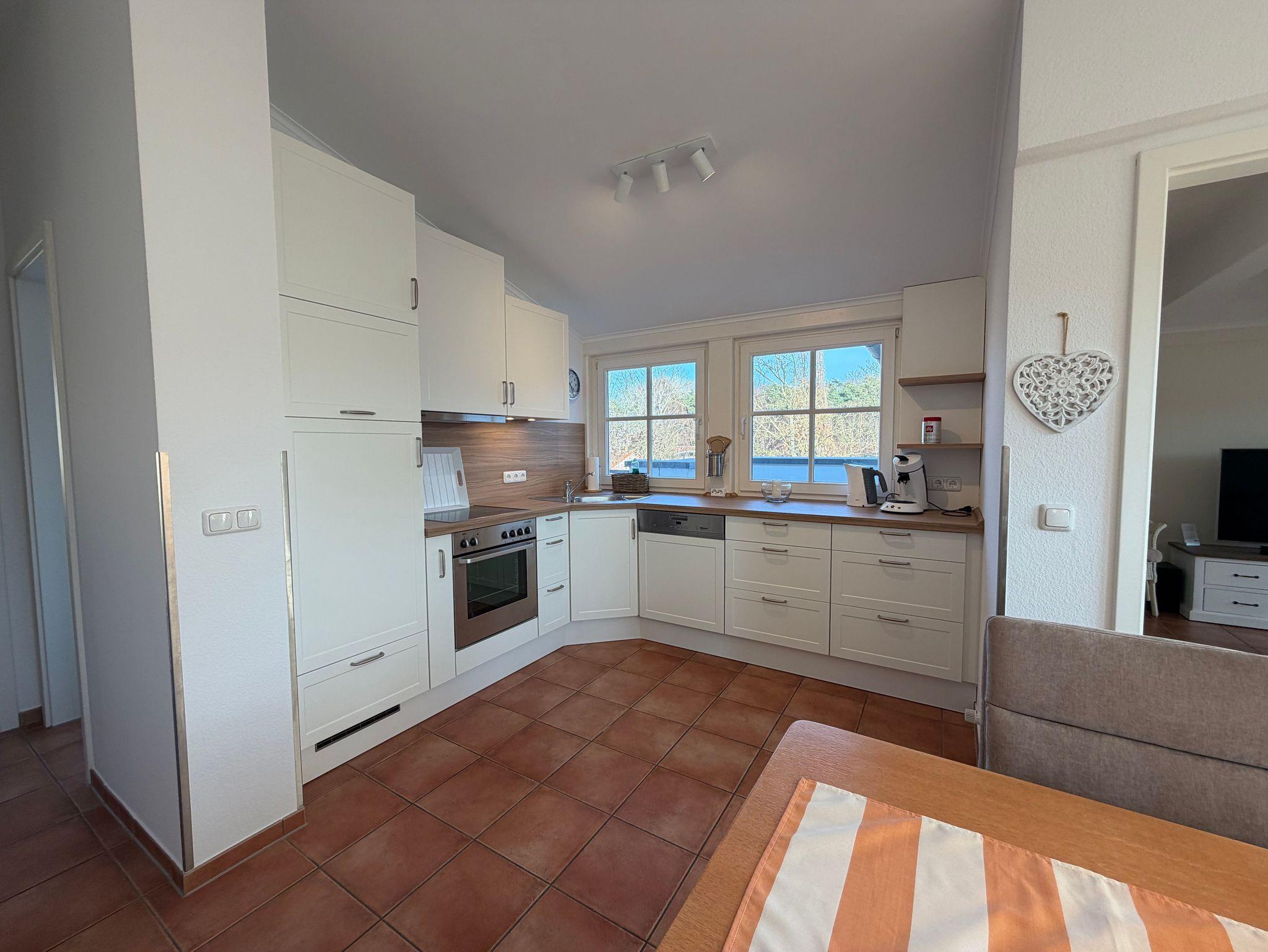 In der separaten Küche finden Sie einen Essbereich vor, der Ihnen reichlich Platz für gemeinsame Mahlzeiten bietet. Die mit hochwertig ausgestattete Küchenzeile hält für Sie alle wichtigen Küchengeräte und -utensilien bereit, die Sie für Ihr perfektes Dinner benötigen: Ein 4-Zonen-Ceranfeld mit Dunstabzug und Backofen, ein Geschirrspüler sowie ein Kühlschrank mit Gefrierfach befinden sich in der Küche. Eine Kaffeemaschine, ein Wasserkocher und ein Toaster sowie genügend Koch- und Essgeschirr vervollständigen die Kücheneinrichtung. Von hier betreten Sie den kleinen Balkon mit Süd-West-Ausrichtung.