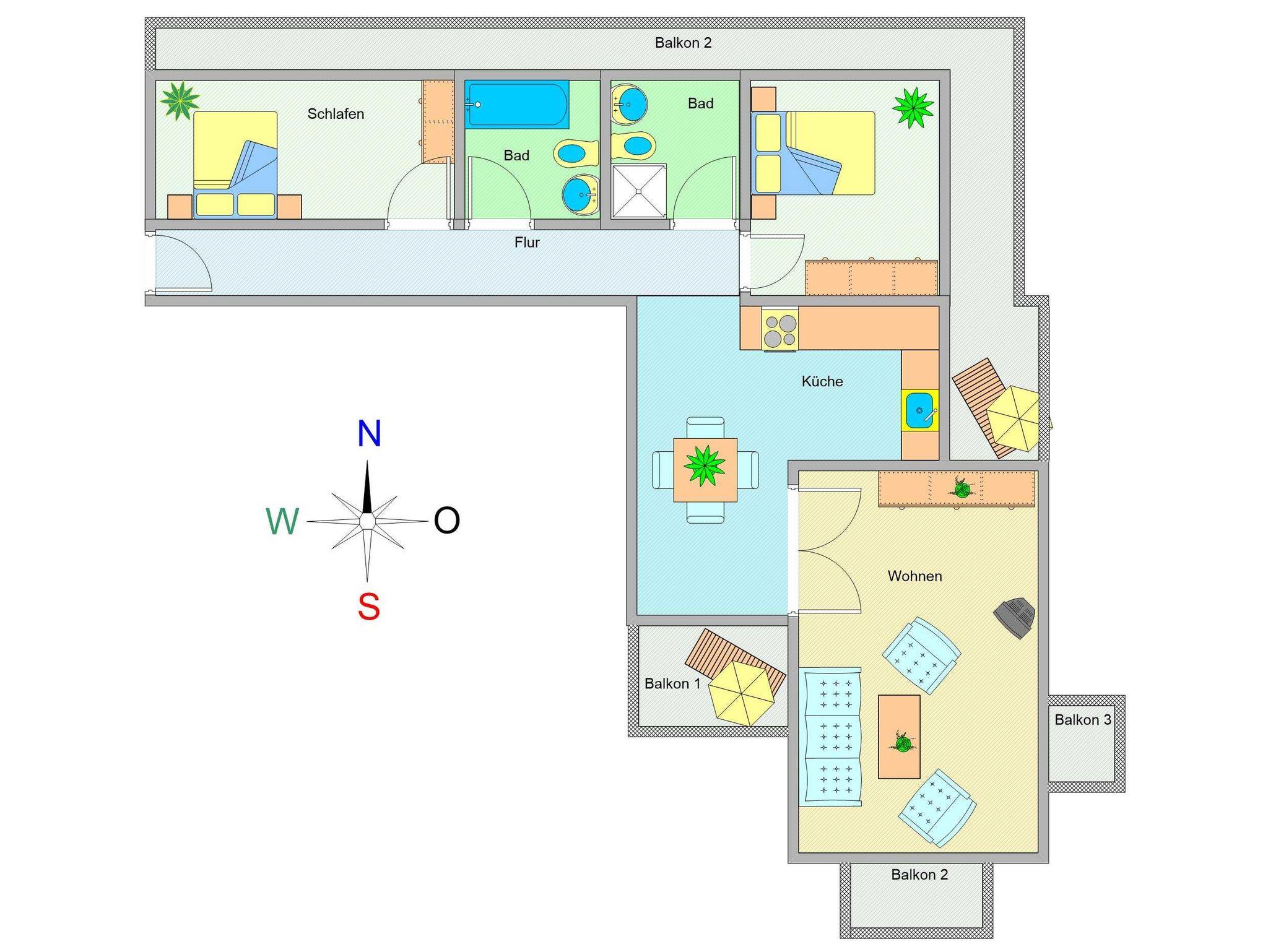 HELLE FREUNDLICHE 3-RAUM-FERIENWOHNUNG MIT 4 BALKONEN UND 2 BÄDERN