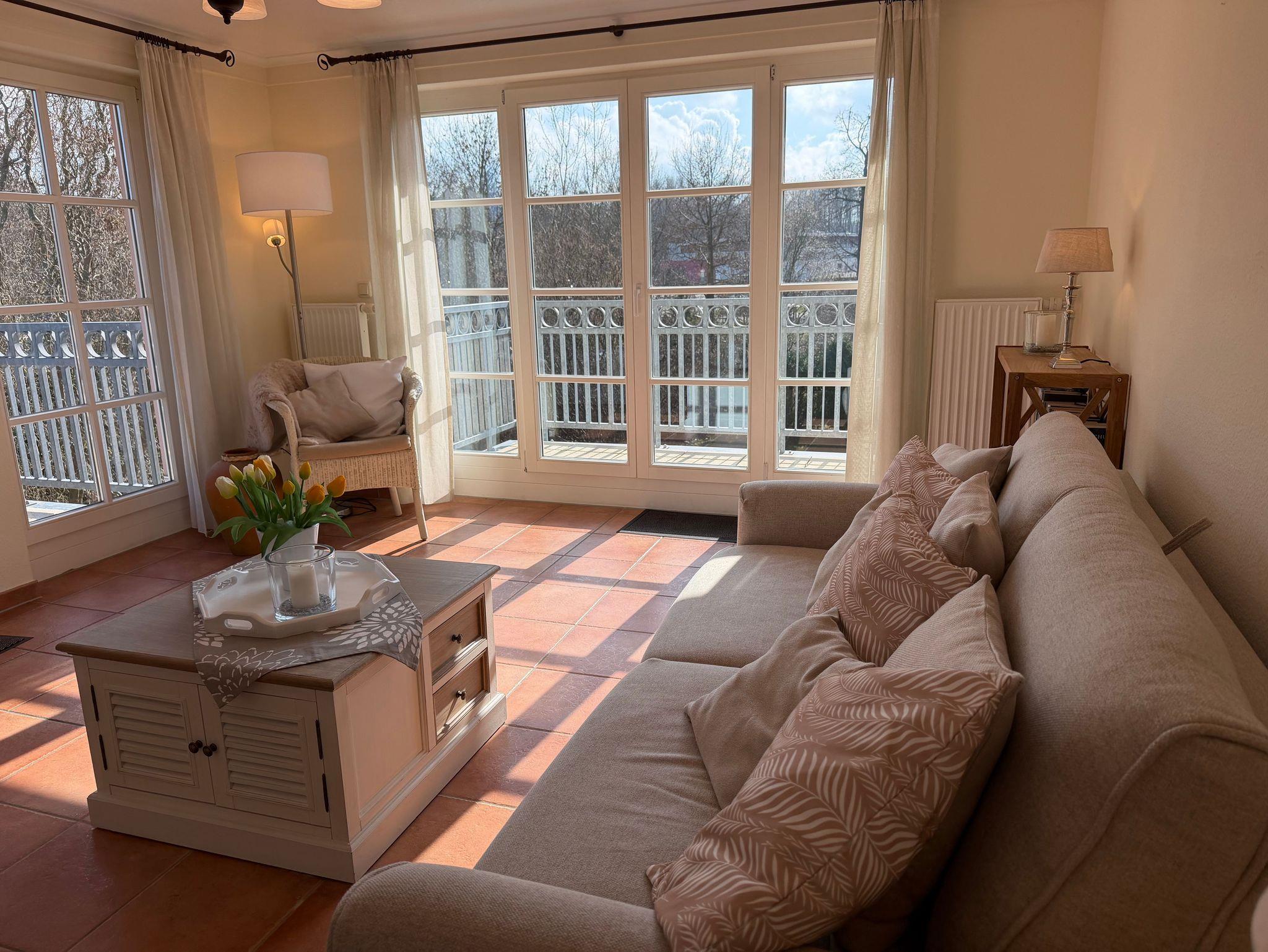 Helle 3-Raum-Ferienwohnung mit 4 Balkonen, mediterranem Flair und nur 100 m vom feinen Sandstrand in Kühlungsborn entfernt.