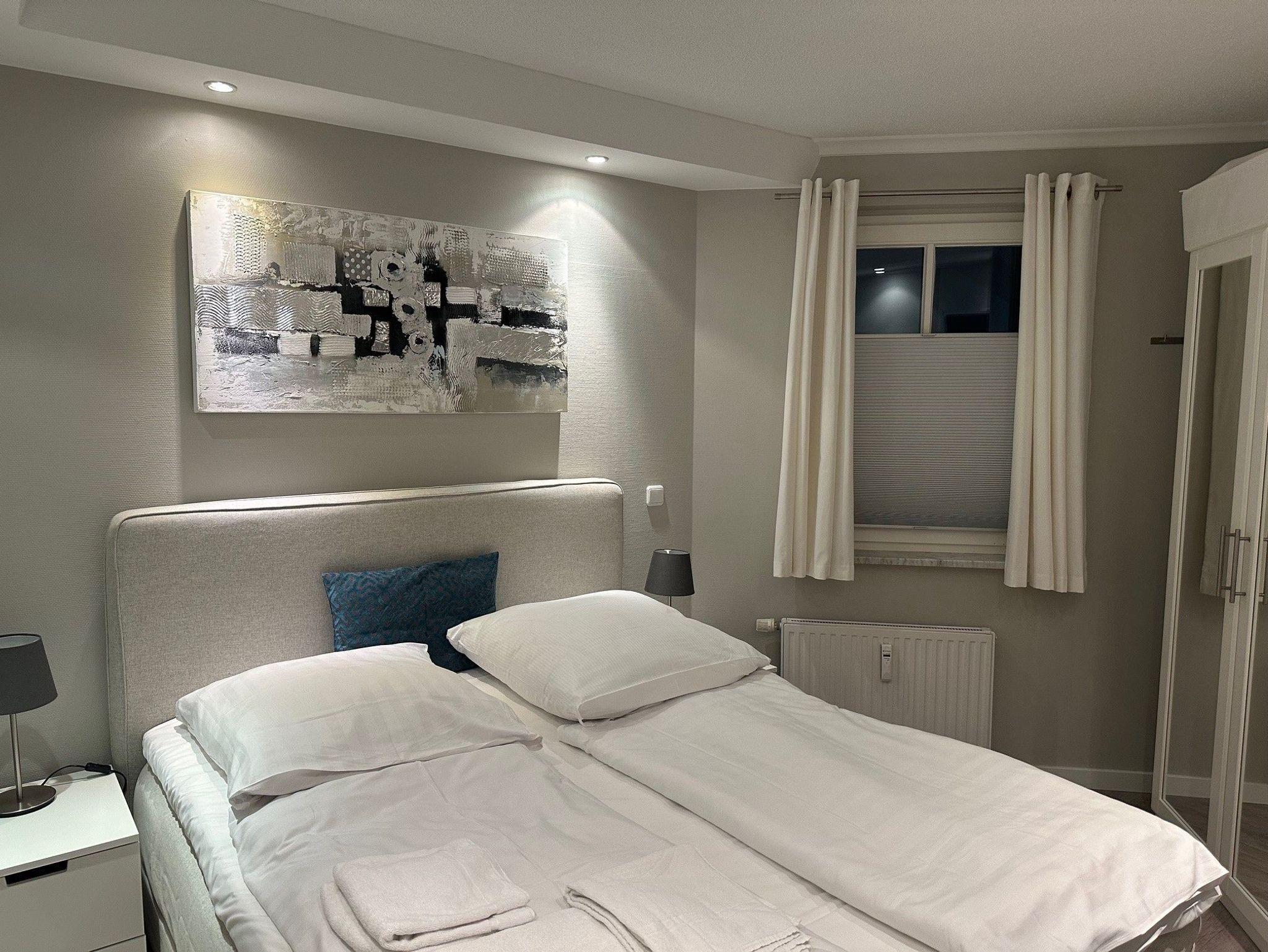 - 1. Schlafzimmer mit Boxspringbett (1,60 x 2,00 m, durchgehender Topper), Kleiderschrank und TV