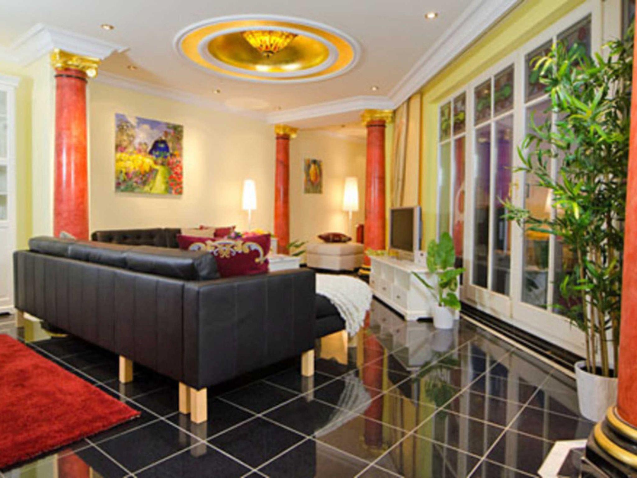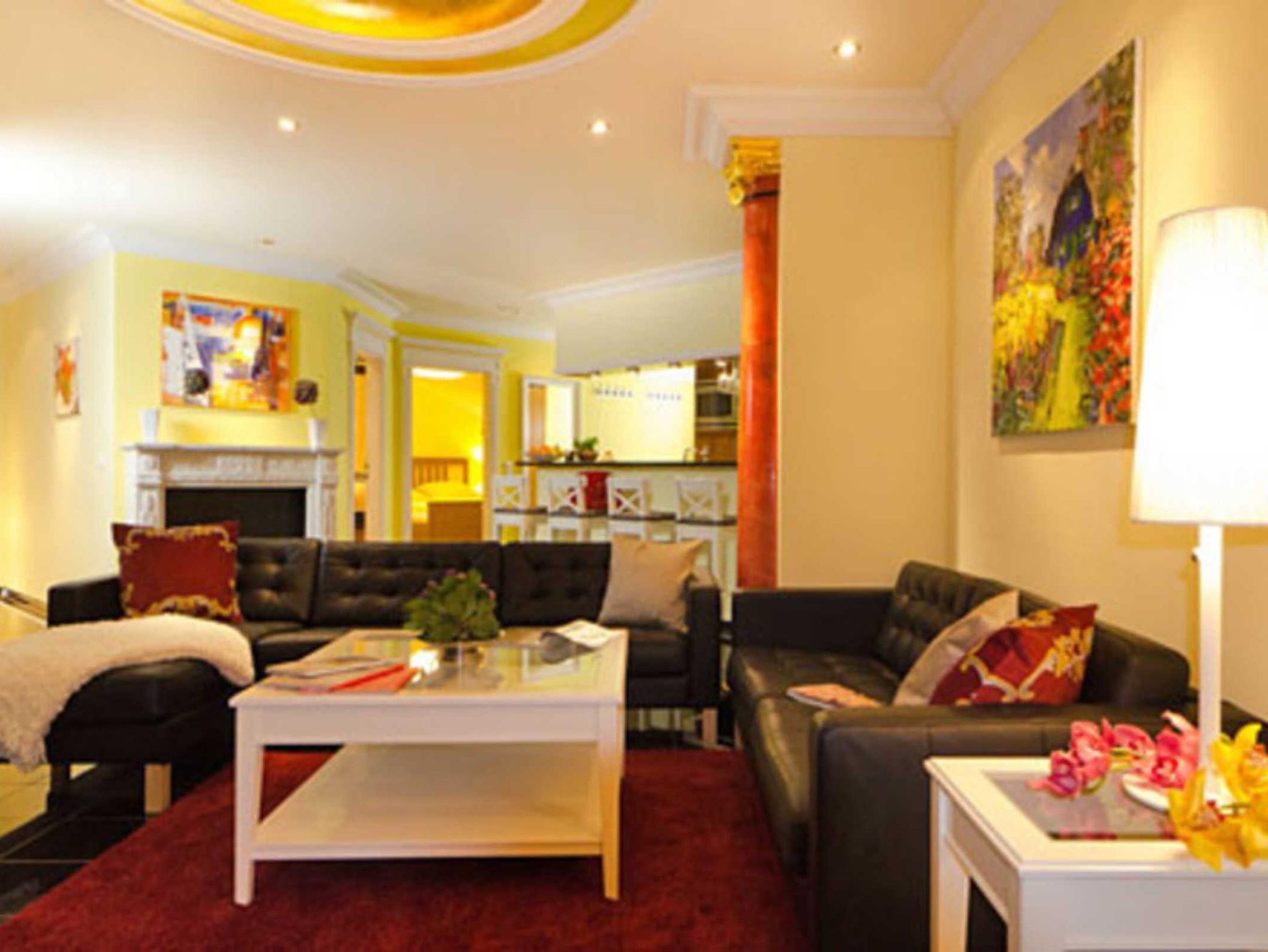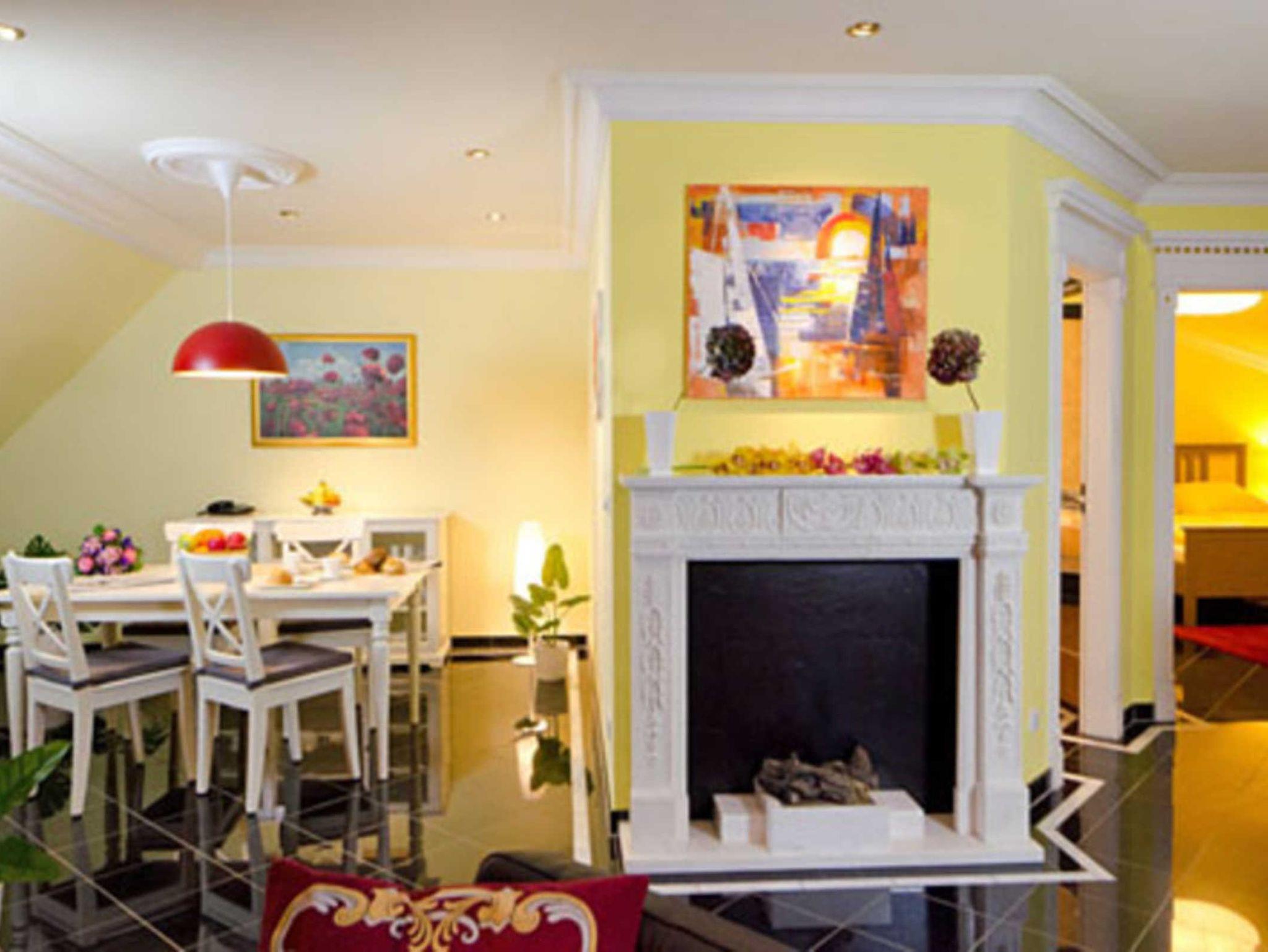 - Wohnbereich mit Schlafcouch, Ethanol-Kamin, integrierter Küche und Essplatz