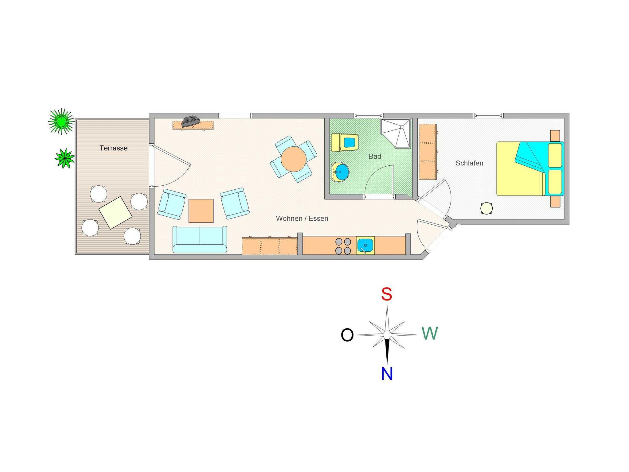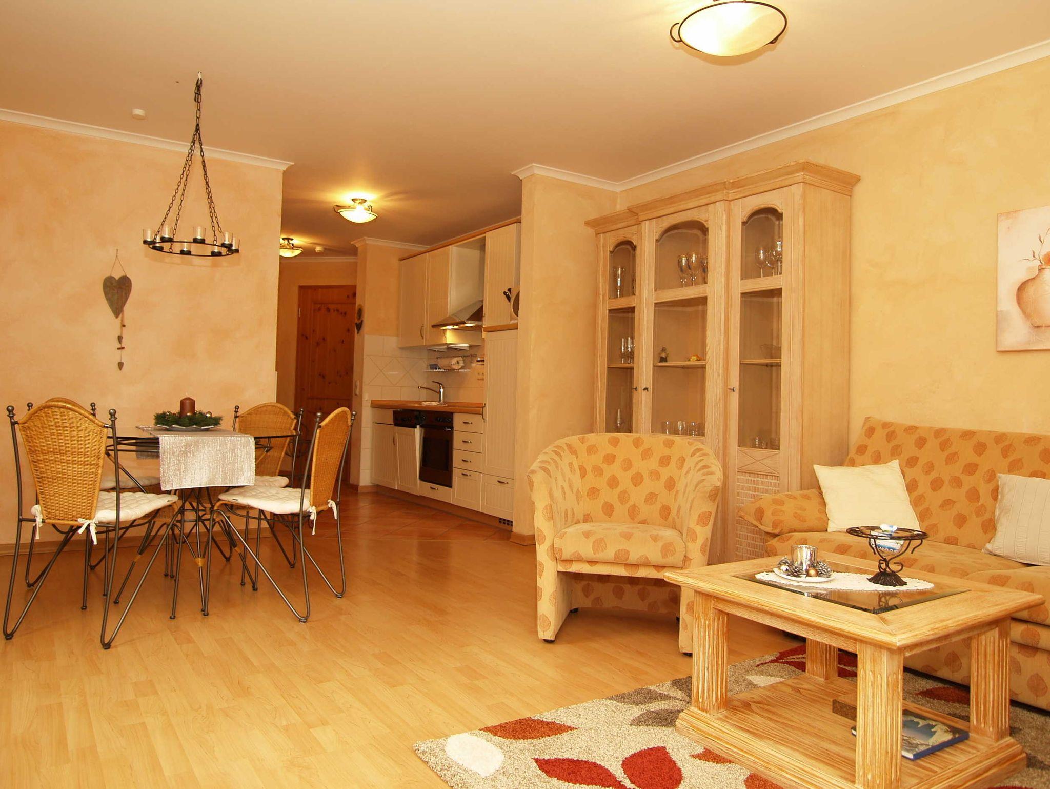 Herzlich willkommen in der Wohnung Nr. 28 in der Residenz Laguna! Die wunderschöne helle 2-Raum-Ferienwohnung im mediterranen Stil bietet Platz für 2 bis 4 Personen auf kompakten 50m² und befindet sich im Erdgeschoss des Hinterhauses der Appartementanlage. Der freundliche Wohnraum ist ausgestattet mit einer Schlafcouch für 2 Personen, einem Essplatz, Flachbild-TV, Radio sowie einer voll ausgestatteten Küchenzeile (4-Platten-Cerankochfeld mit Backofen, Geschirrspüler, Mikrowelle, Kühlschrank mit Gefrierfach usw.). Vom Wohnraum aus betreten Sie die nach Osten ausgerichtete möblierte Terrasse. Der Schlafraum mit Doppelbett bietet mit seinem großzügigen Kleiderschrank mit Ganzkörperspiegel genügend Platz für Ihre Urlaubsgarderobe. Das geflieste Tageslichtbad mit Dusche, WC und Handtuchwärmer bietet genügend Ablagefläche für Ihre Badutensilien.