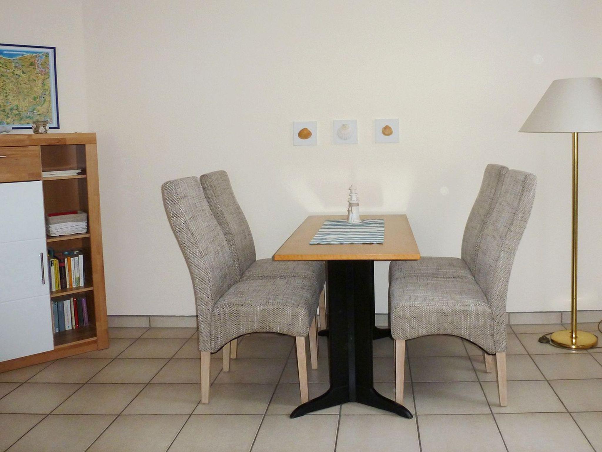 Neben dem geräumigen Wohn- und Esszimmer mit klappbarer Schlafcouch, gibt es ein Schlafzimmer mit Doppelbett, ein saniertes Bad mit Dusche und einen Abstellraum mit Garderobe.