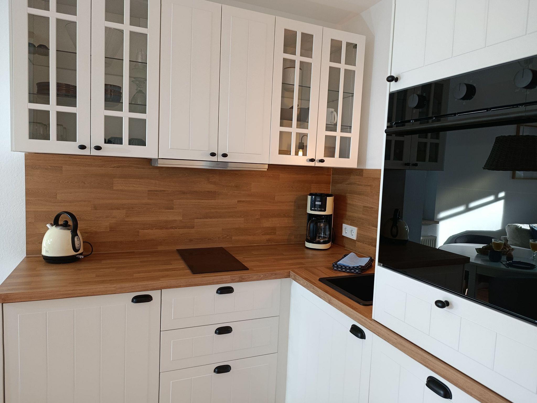 Die helle Küchenzeile wurde ausgestattet mit Backofen, Geschirrspüler, Kühl- Gefrierschrank, Dunstabzug, Induktionsherd, Kaffeemaschine, Wasserkocher und Toaster.