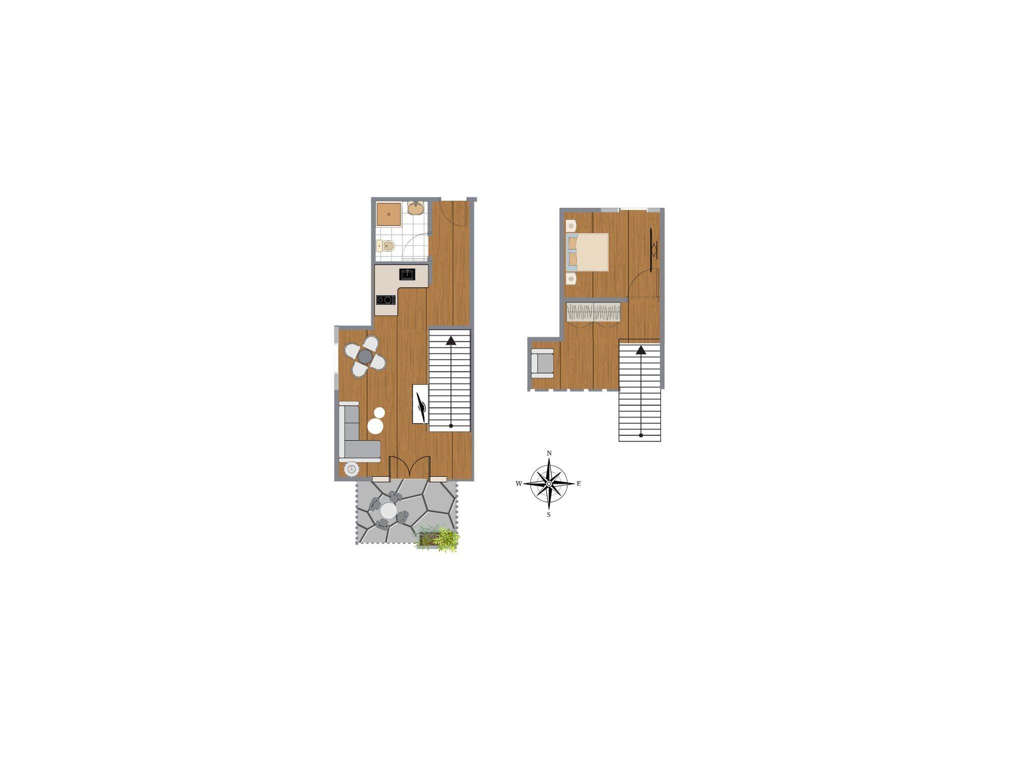 Die ca. 44 qm Komfortmaisonette-Ferienwohnung liegt im Erdgeschoss. Hier können bis zu 4 Personen übernachten. Sie hat neben dem Wohn-/Esszimmer eine Galerie und ein separates Schlafzimmer, eine Küchenzeile sowie ein Duschbad und eine ruhige, sonnige Terrasse zur Südseite.