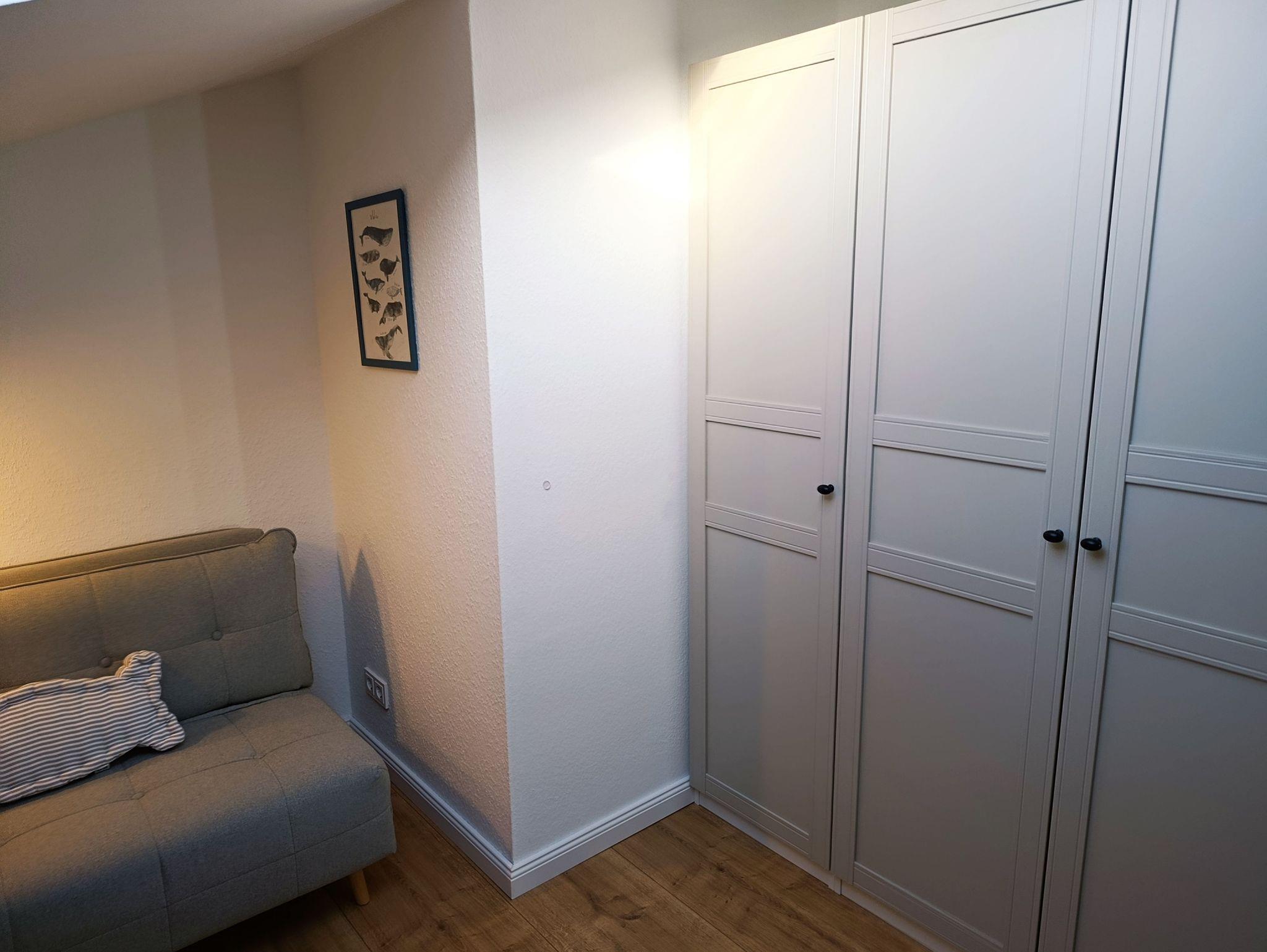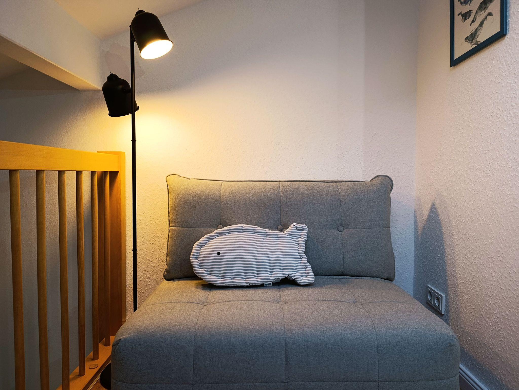 Auf der Galerie steht ein großer Kleiderschrank mit viel Stauraum und ein kleiner Sessel, der sich in Handumdrehen in eine weitere Schlafmöglichkeit verwandeln lässt.