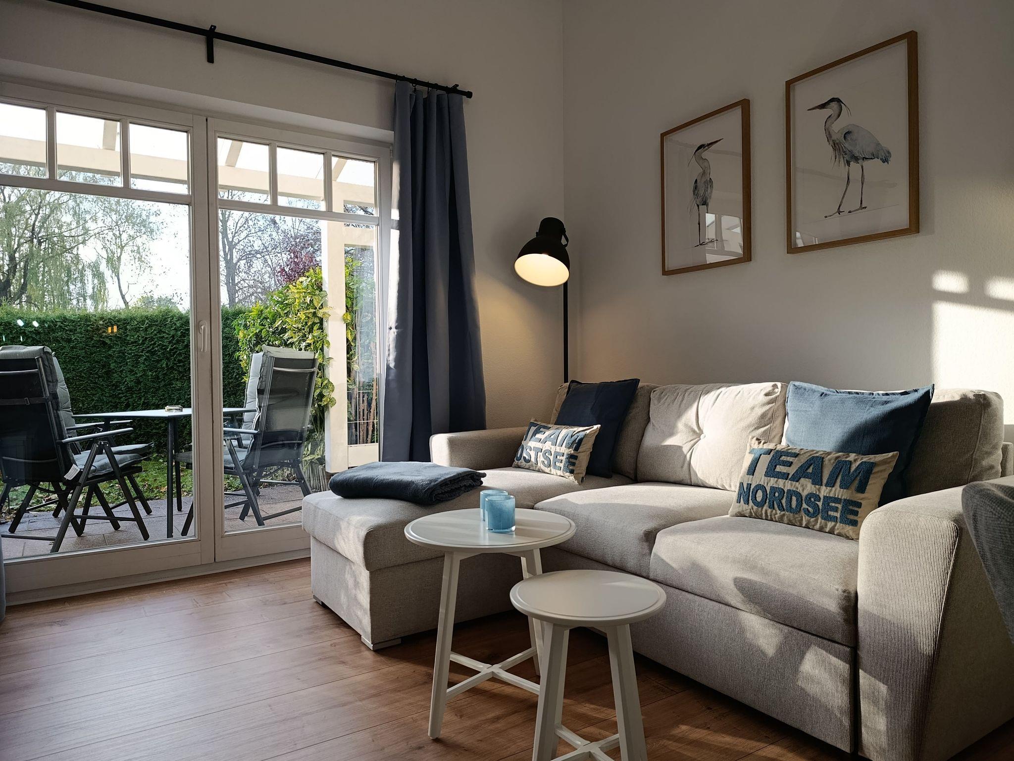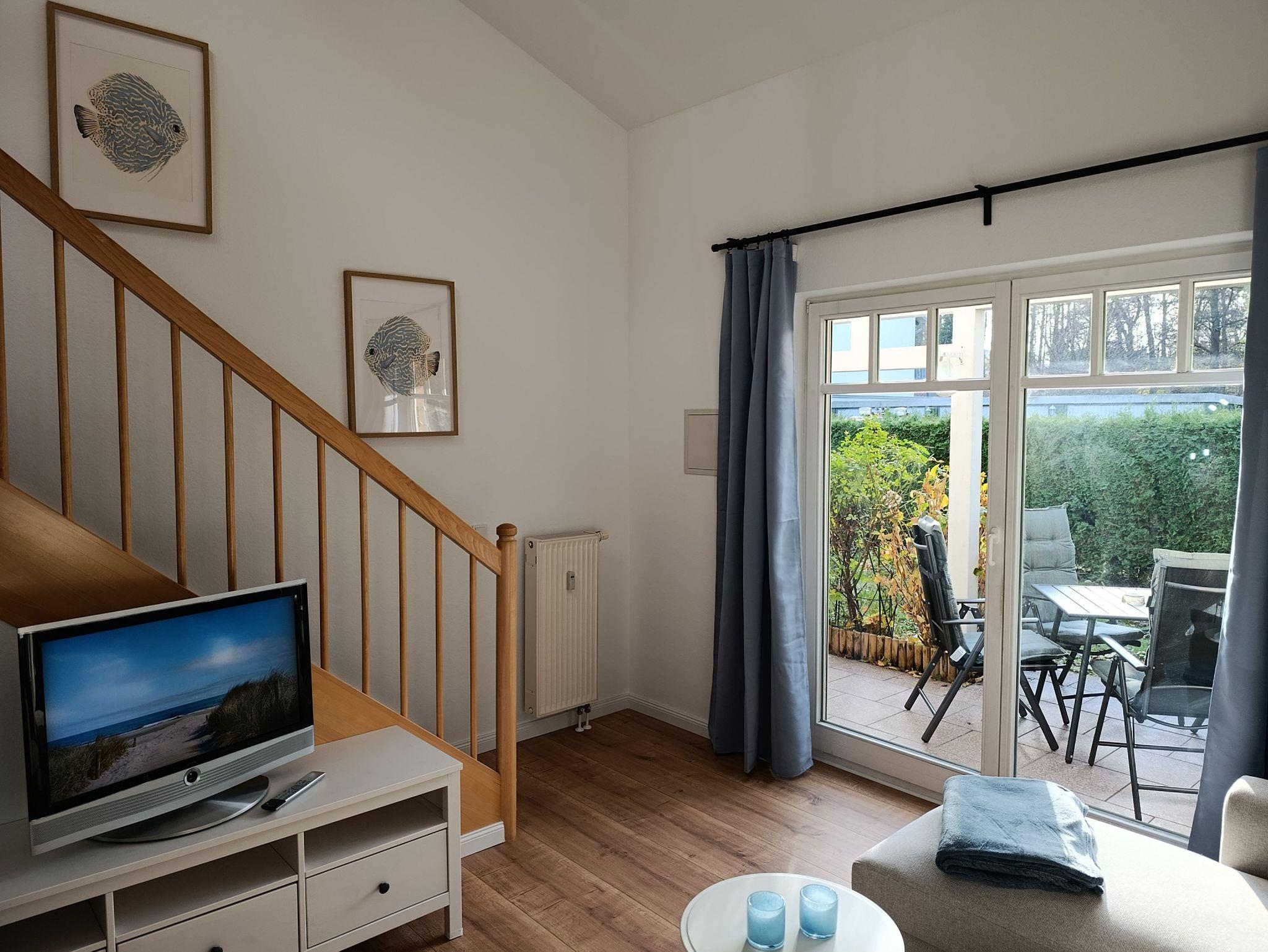 Die Wohnung liegt im Erdgeschoss und besitzt eine geschützte Terrasse zur Südseite. Das Wohnzimmer ist mit einer Schlafcouch, Couchtisch, TV - Bank mit TV, Essbereich und Küchenzeile ausgestattet. Im Schlafzimmer befinden sich ein Doppelbett und ein TV-Gerät.