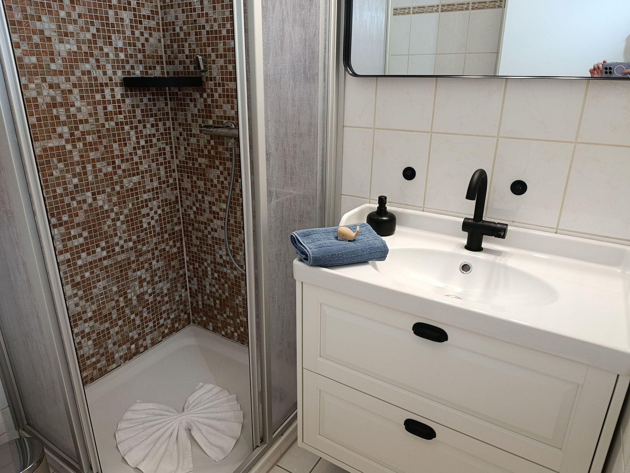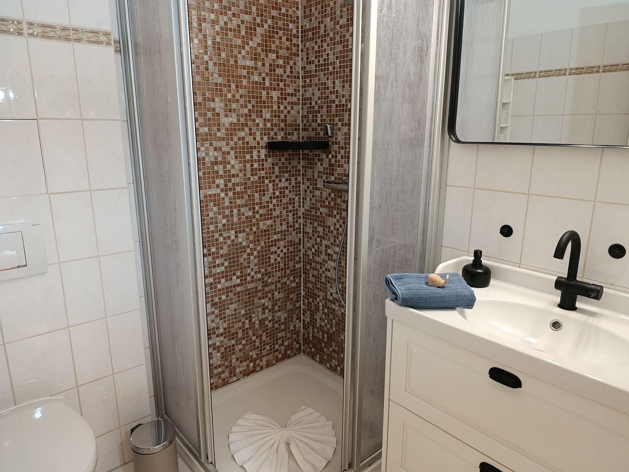 Bad mit Dusche (niedriger Duscheinstieg), WC, großer Waschtisch, Schminkspiegel und Föhn.