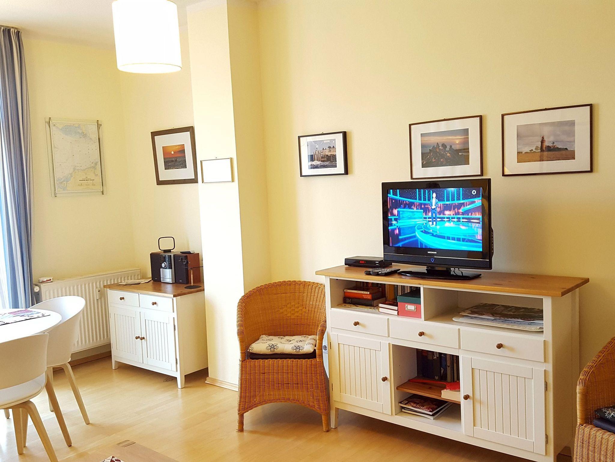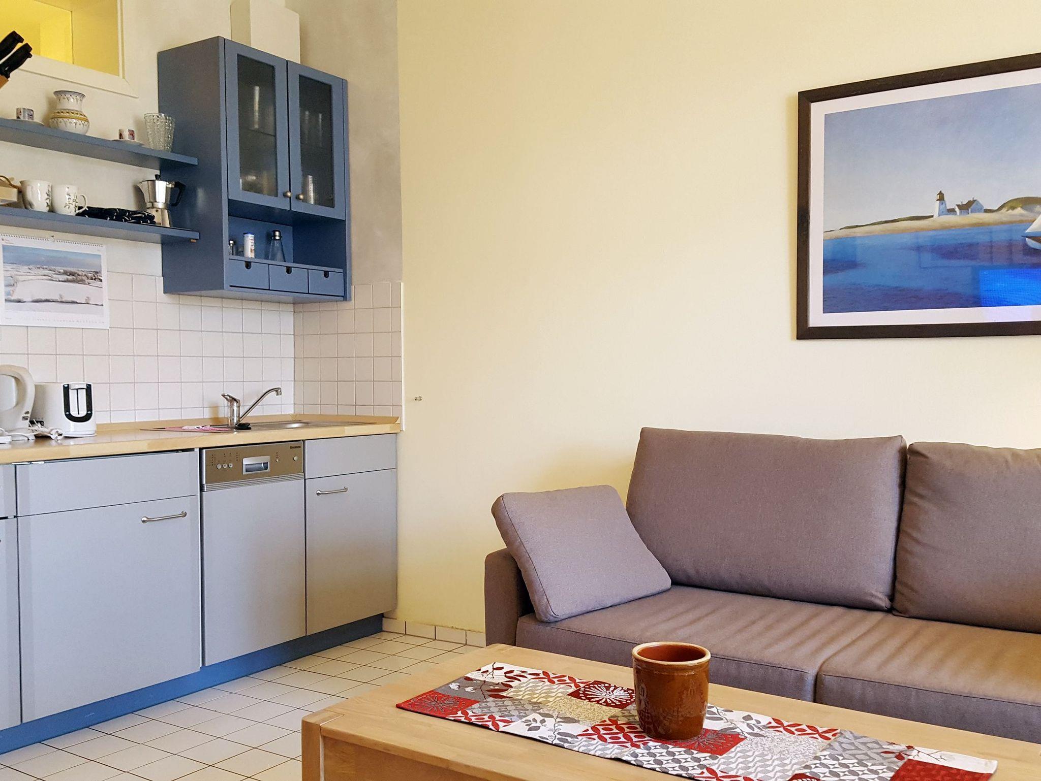 Der Wohnbereich ist eingerichtet mit einer Doppelschlafcouch mit Farb-TV, einer Pantryküche mit Geschirrspüler und einem Esstisch.