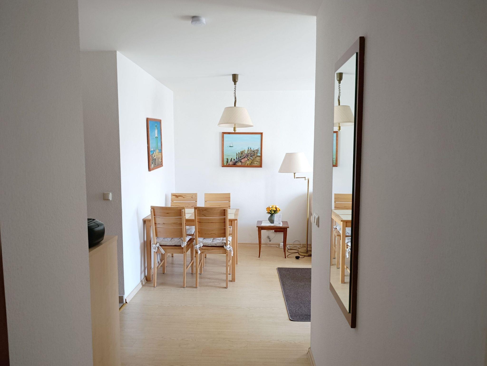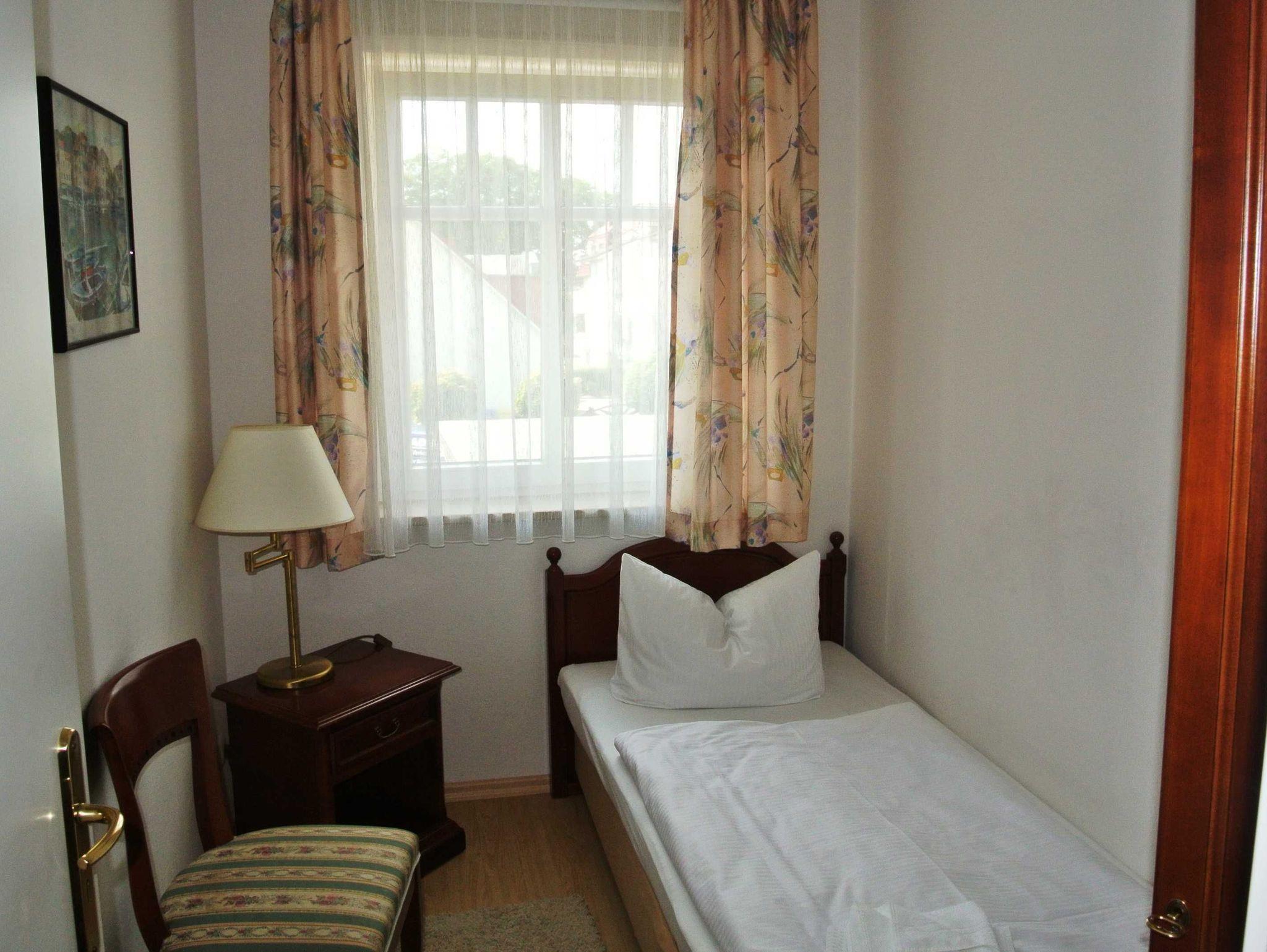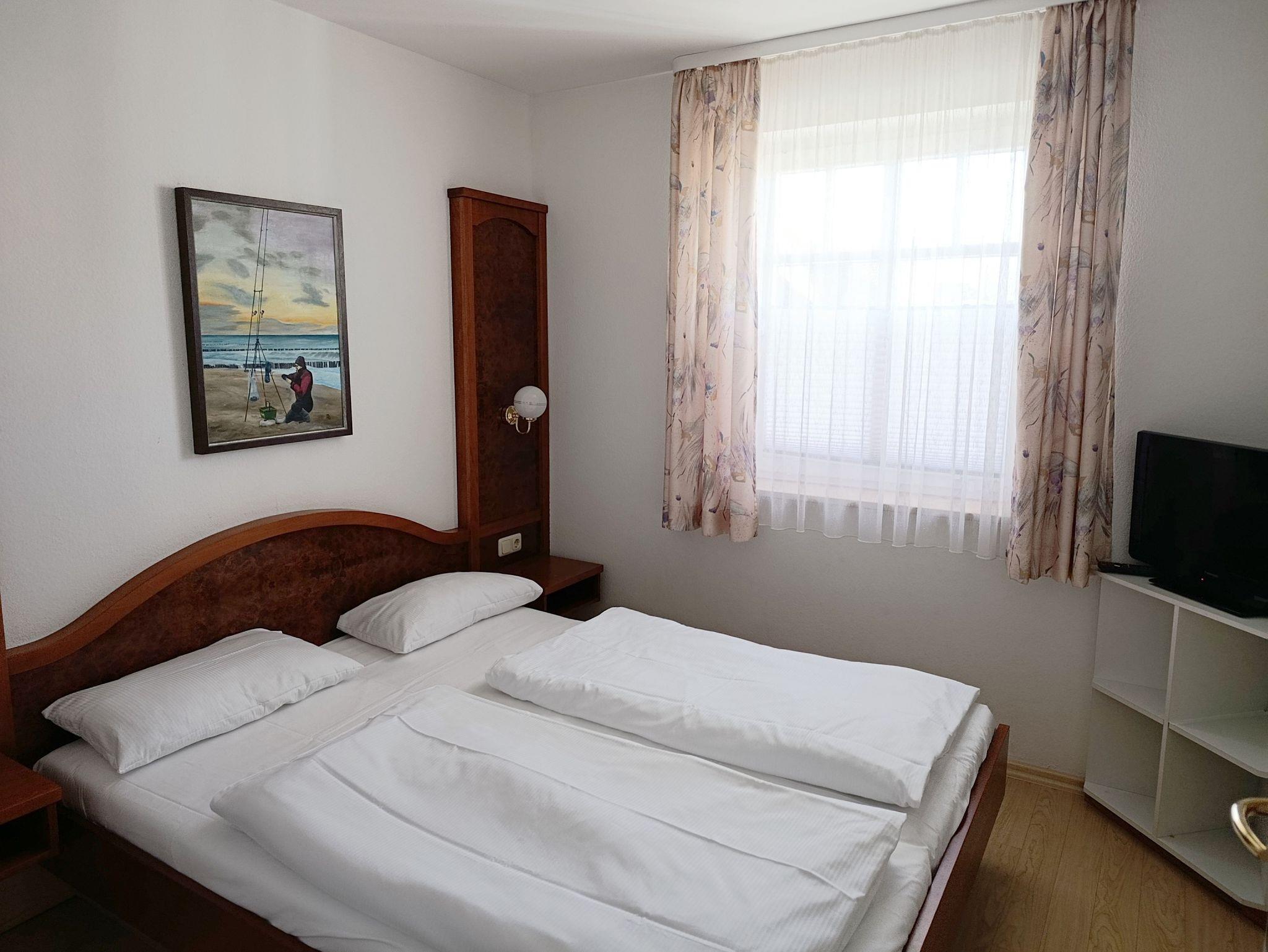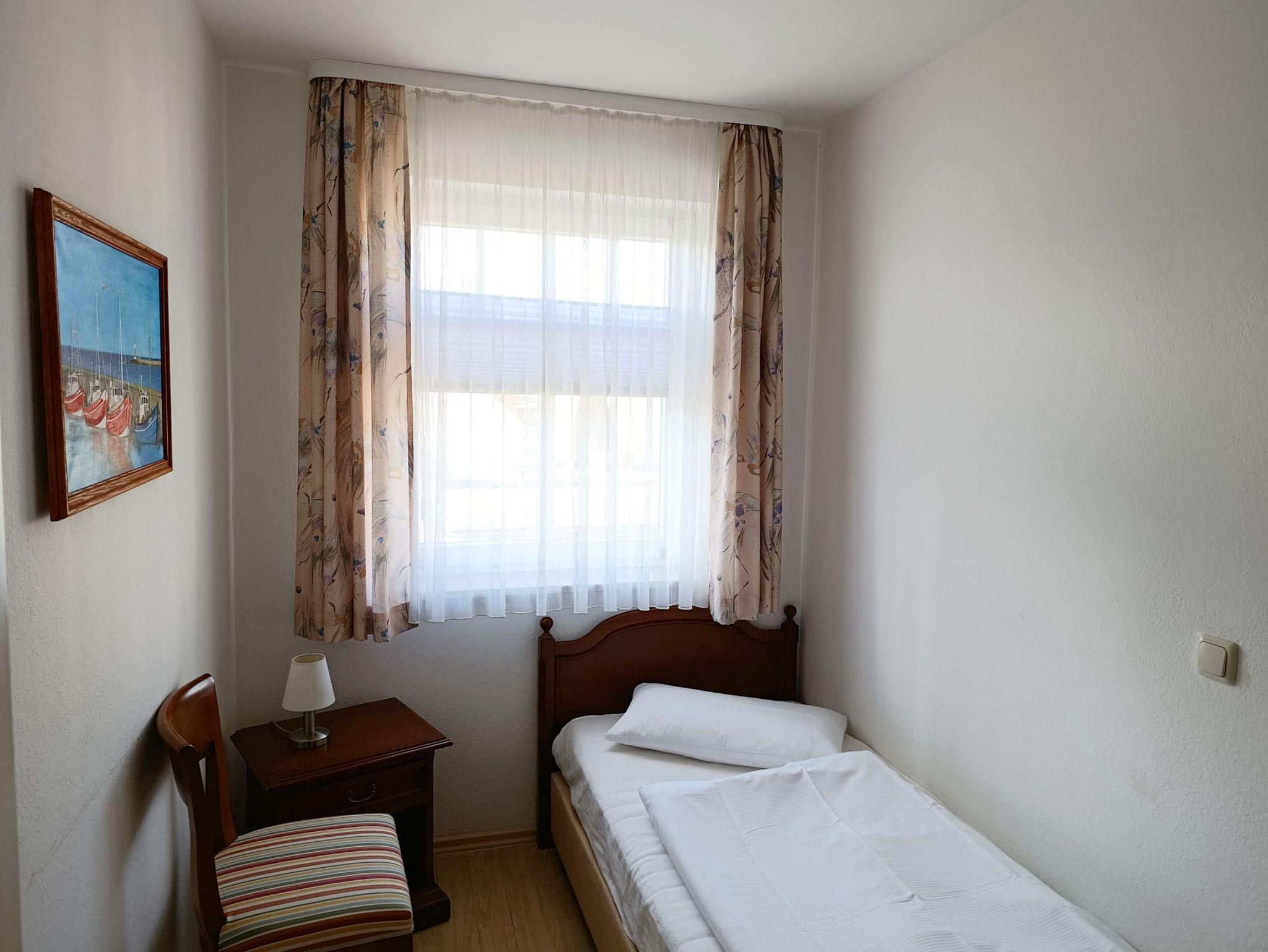Nur 150 m vom Strand wohnen Sie in einer 3-Raum-Ferienwohnung. Die 42 qm große Wohnung liegt in der ersten Etage und ist mit Fahrstuhl erreichbar. Das Wohnzimmer ist mit einer Couch, Couchtisch, Sessel, Anrichte, mit Kabel-TV (Flachbildschirm), Radio, Essbereich (Tisch und Stühle) und Küchenzeile ausgestattet. Der Balkon mit Tisch und Stühle geht zur Westseite. Im Schlafzimmer stehen ein Doppelbett und eine kleine Anrichte. Im Gästezimmer stehen ein Bett, Nachtschrank und ein kleiner Kleiderschrank. Im Flur steht ein Kleiderschrank und eine Garderobe mit Spiegel. Die Küchenzeile wurde ausgestattet mit Mikrowelle, Kühlschrank, Kaffeemaschine, Zwei-Platten-Kochfeld, Toaster und Wasserkocher. Das Bad mit Dusche und WC komplettiert die Wohnung.