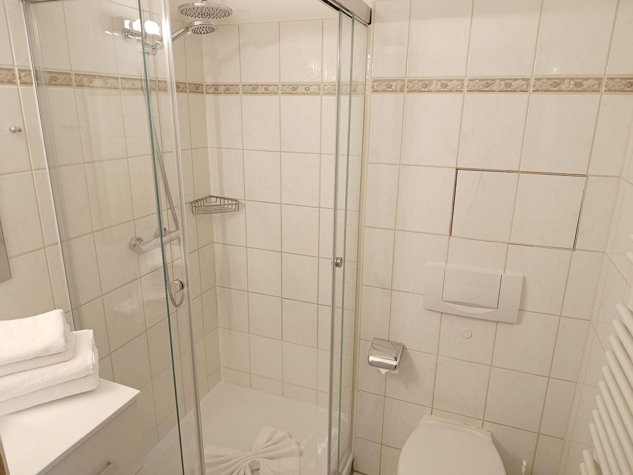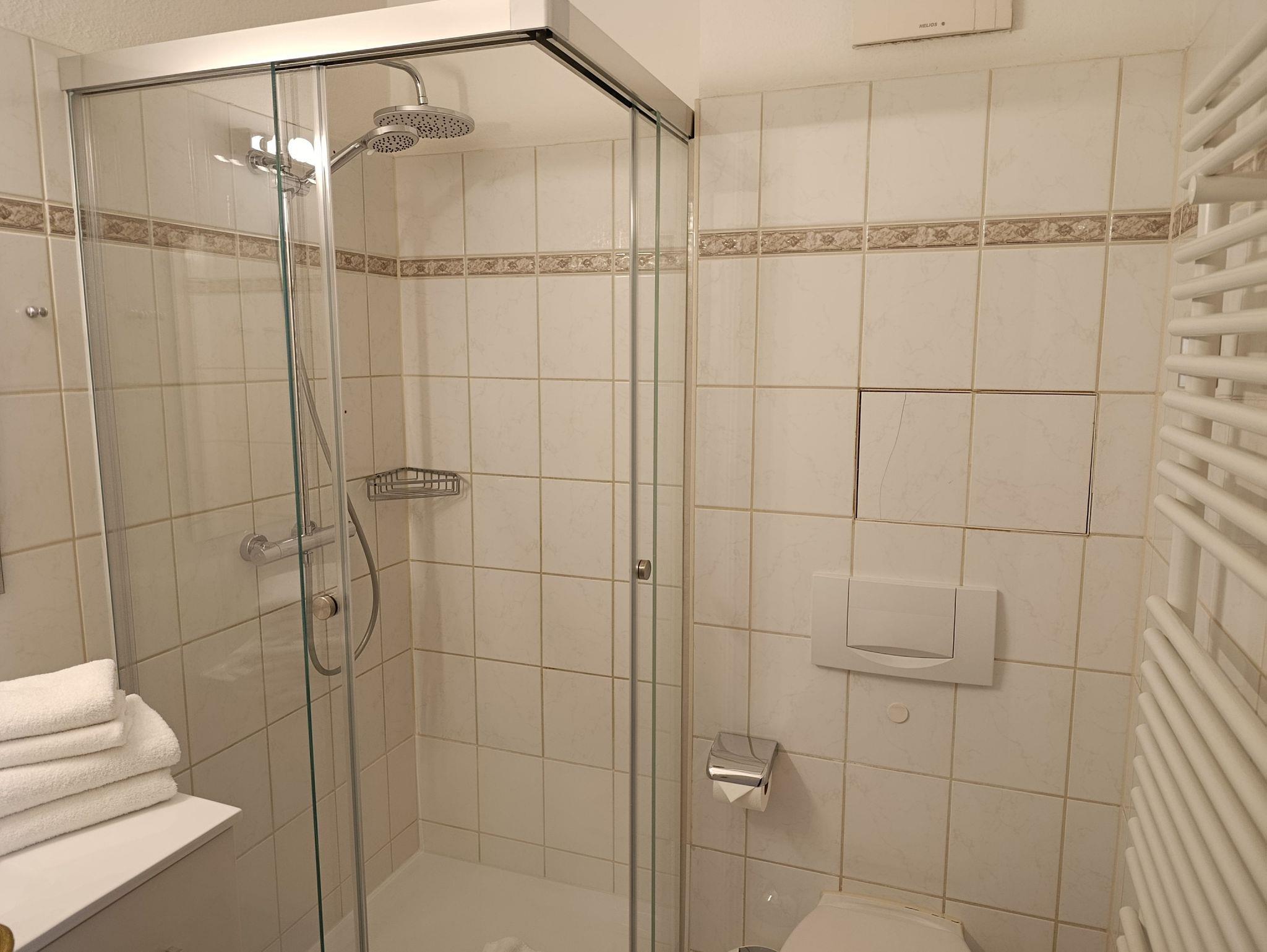Ein Bad mit Dusche, Waschbecken und WC komplettieren den guten Gesamteindruck der Wohnung.