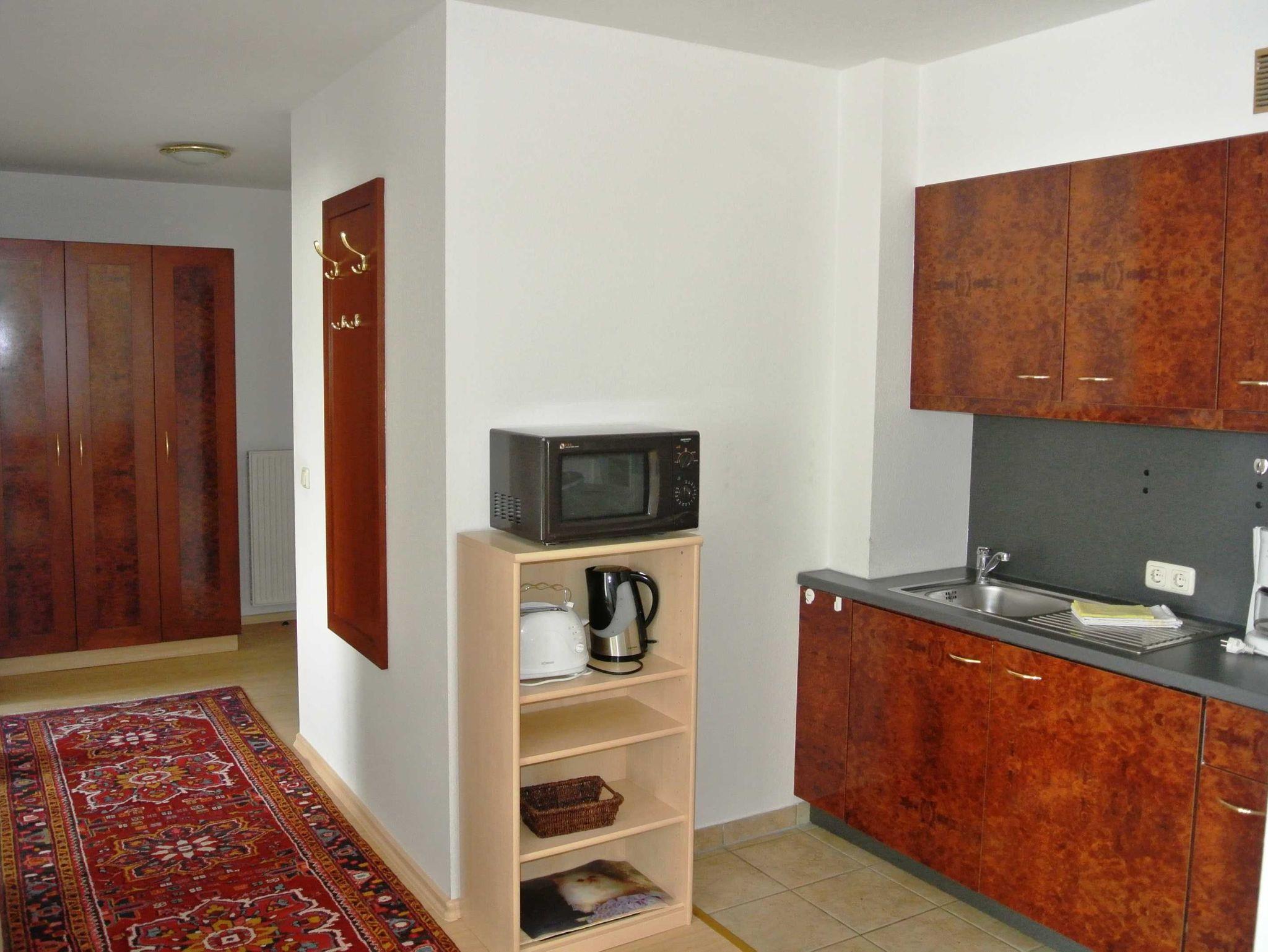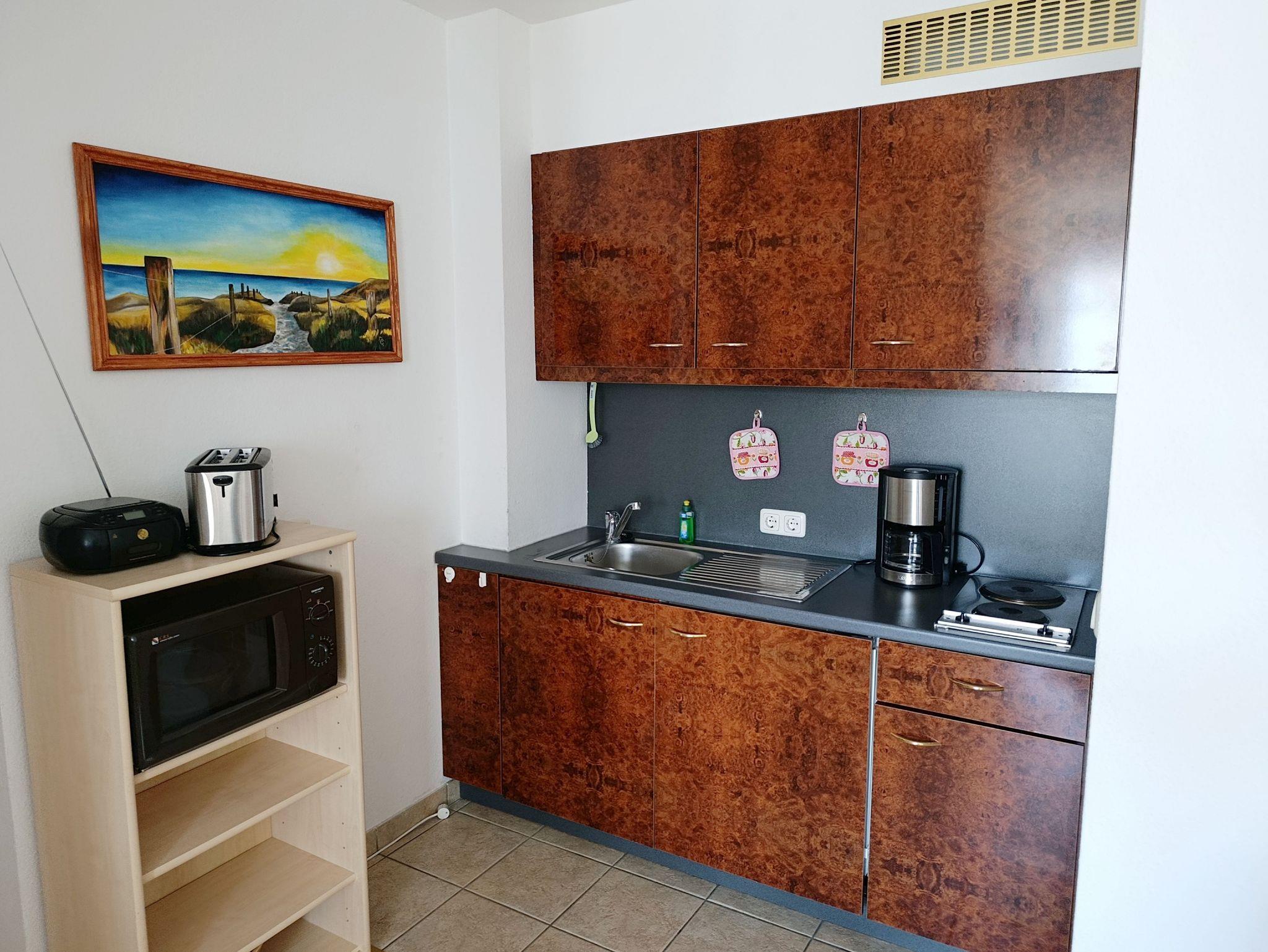 Die praktisch gestaltete Ferienwohnung in der 1. Etage hat einen offenen Wohnbereich mit Küchenzeile und Essbereich, ein Schlafzimmer mit Doppelbett, ein Gästezimmer mit Einzelbett und einen Balkon zur Westseite. Die funktionale Küchenzeile ist mit 2-Platten-Kochfeld, Kühlschrank, Mikrowelle, Kaffeemaschine, Wasserkocher, Toaster und div. Geschirr ausgestattet.