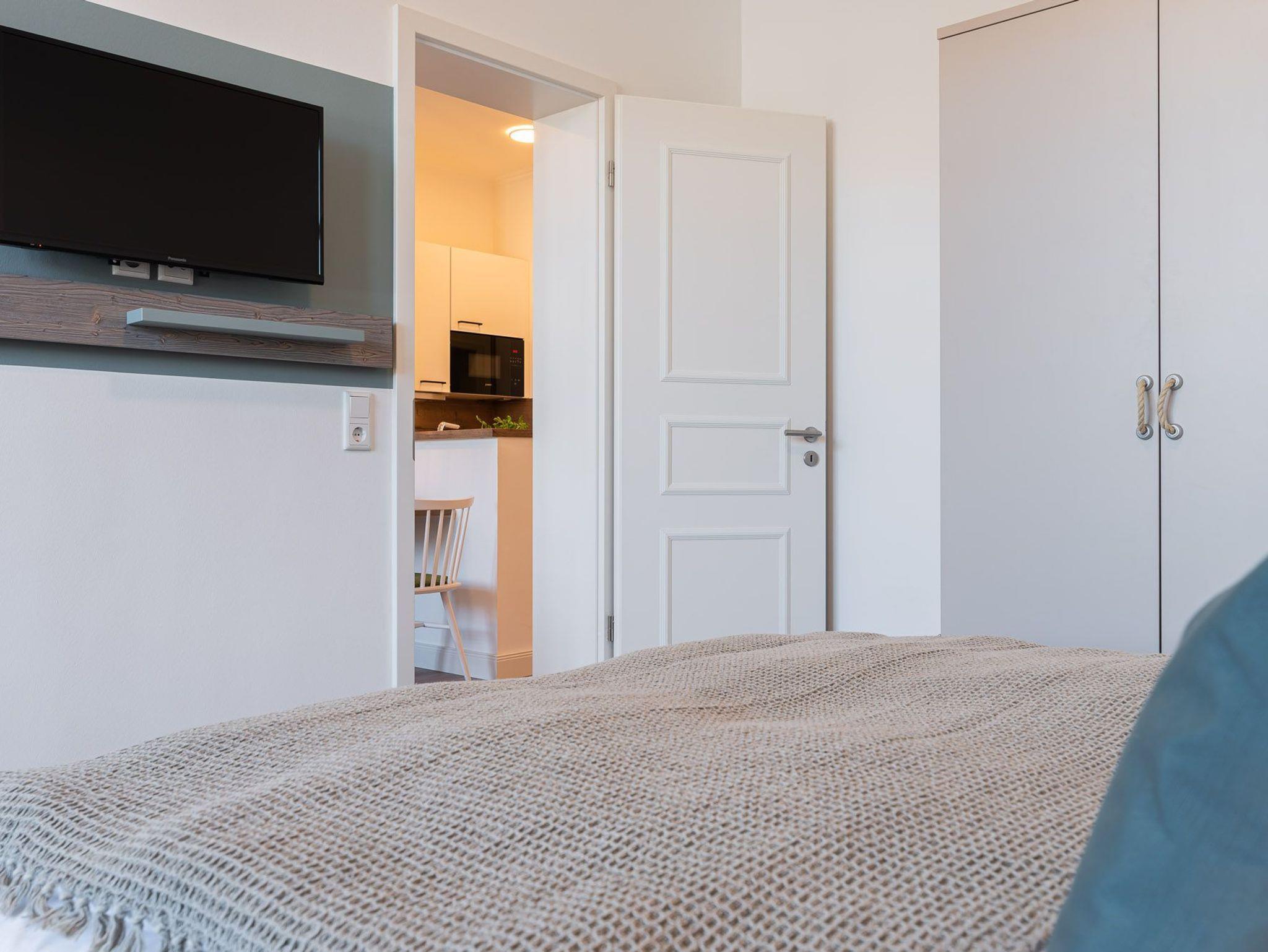 Das Schlafzimmer verfügt über ein 1,80 x 2,00 m Bett, sowie über einen Kleiderschrank und ein TV-Gerät. Für unsere kleinen Gäste können ein Kinderreisebett und ein Kinderhochstuhl bereitgestellt werden (kostenpflichtig zu buchbar).
