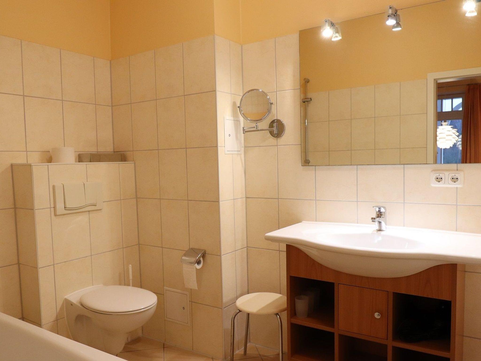 Im Badezimmer befindet sich eine Badewanne mit Duschabtrennung, sowie Waschbecken und WC.
