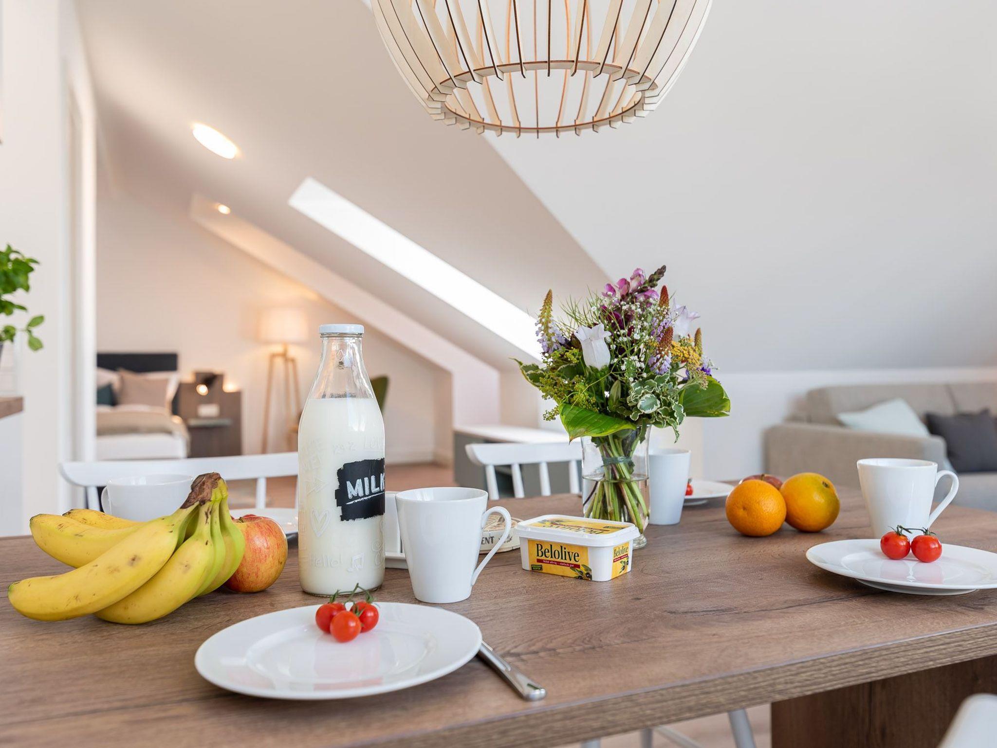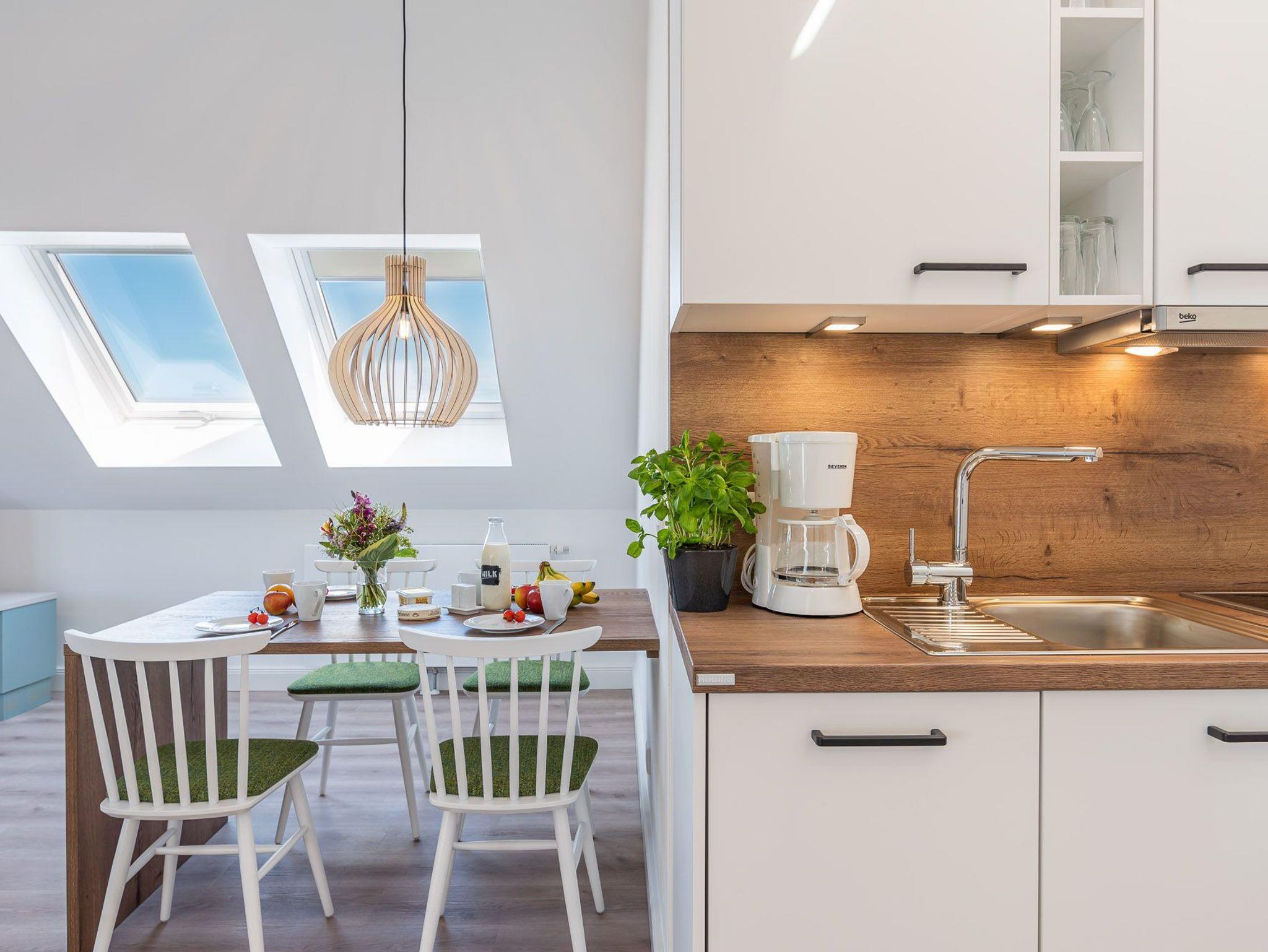 Das Bad verfügt über eine Dusche, einem Haartrockner und einem Handtuchtrockner. Zu Ihrem Apartment gehört ebenfalls ein großer und lichtdurchfluteter Wohn- und Essbereich mit offener Küche.