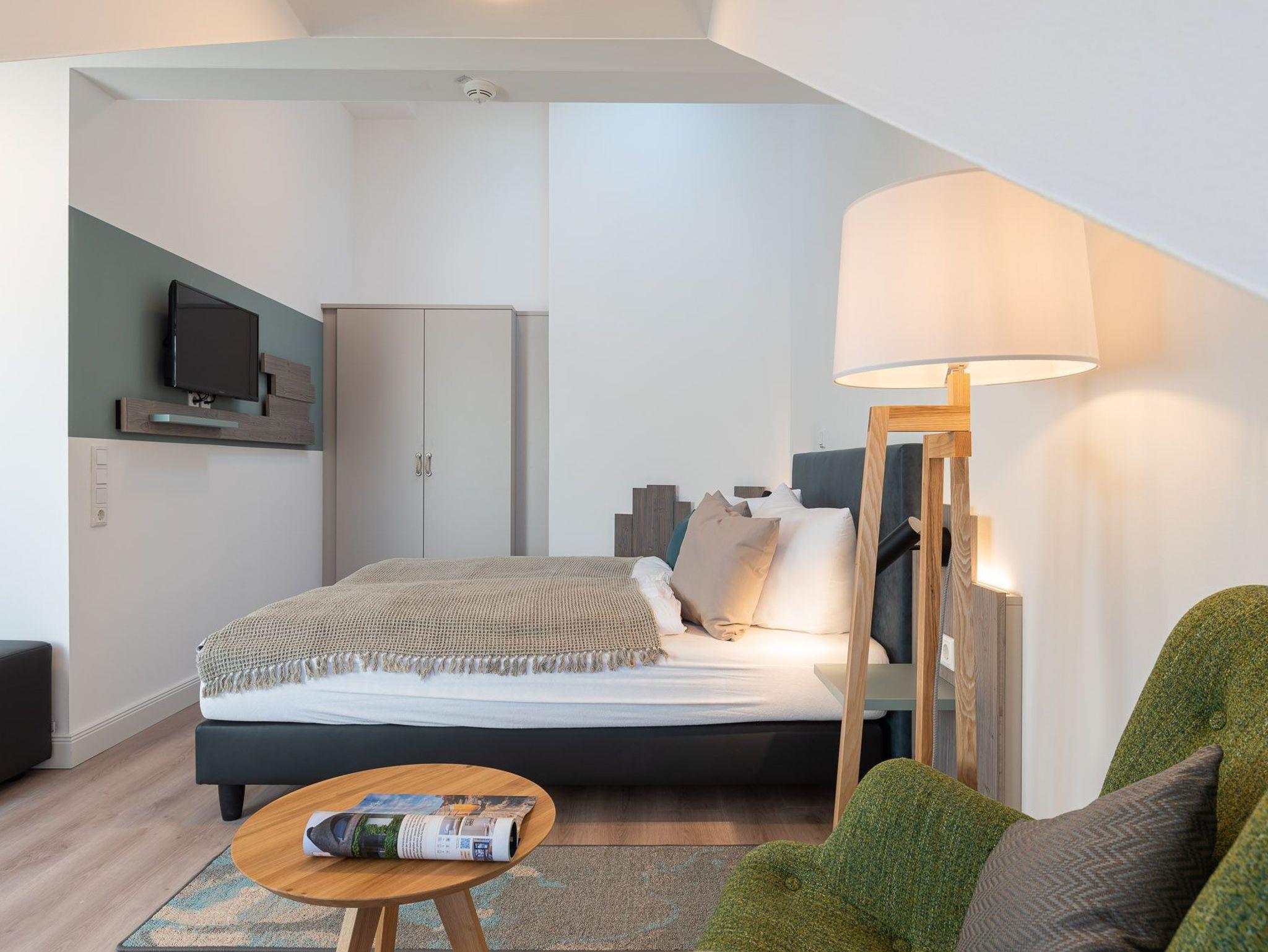 Der Schlafbereich verfügt über ein 1,60 x 2,00 m Bett, sowie über einen Kleiderschrank und ein TV-Gerät. Die zweite Schlafmöglichkeit ist ein bequemes Schlafsofa mit einer Liegefläche von 1,50 x 1,95 m. Für unsere kleinen Gäste können ein Kinderreisebett und ein Kinderhochstuhl bereitgestellt werden (kostenpflichtig zu buchbar).