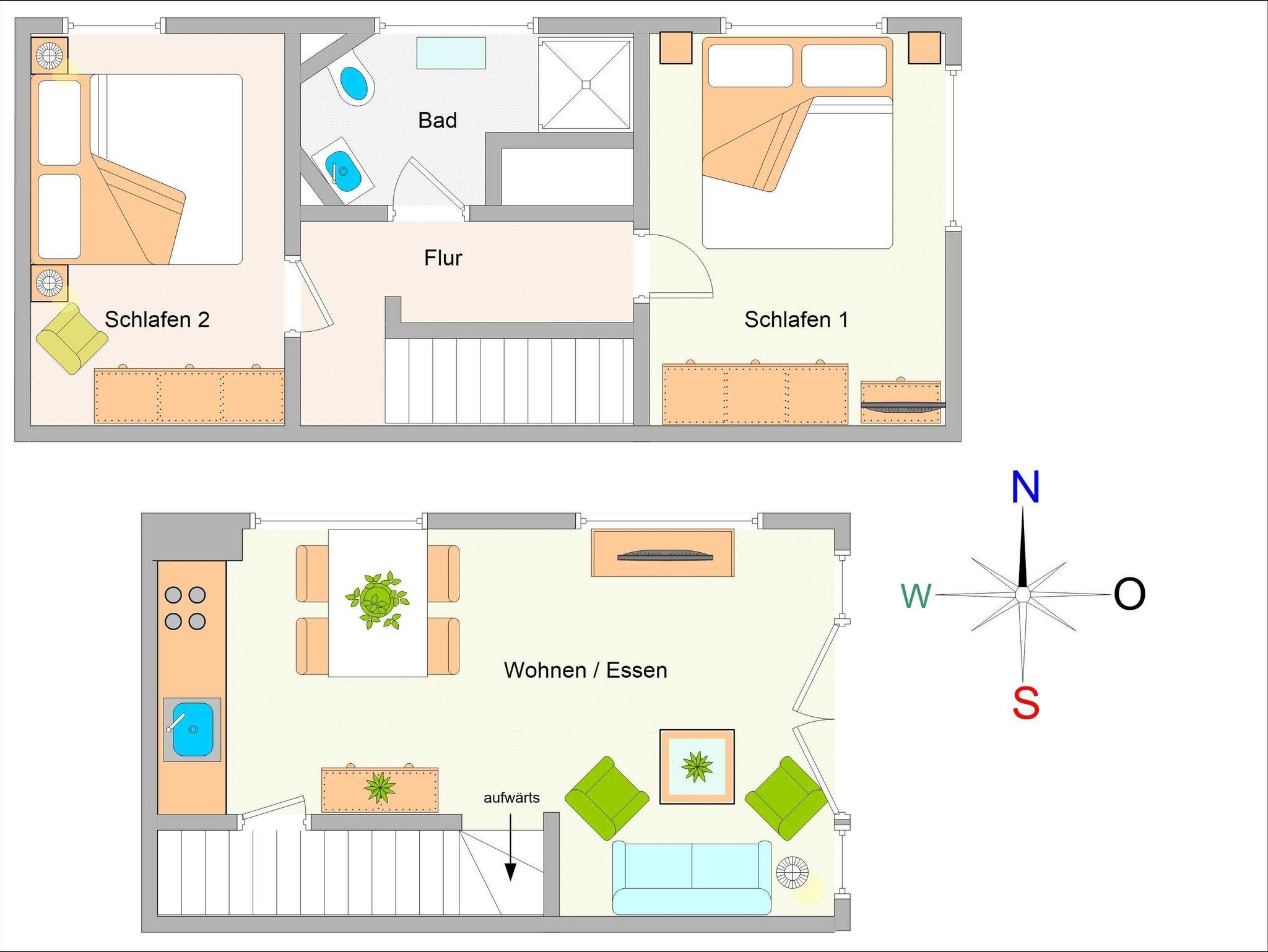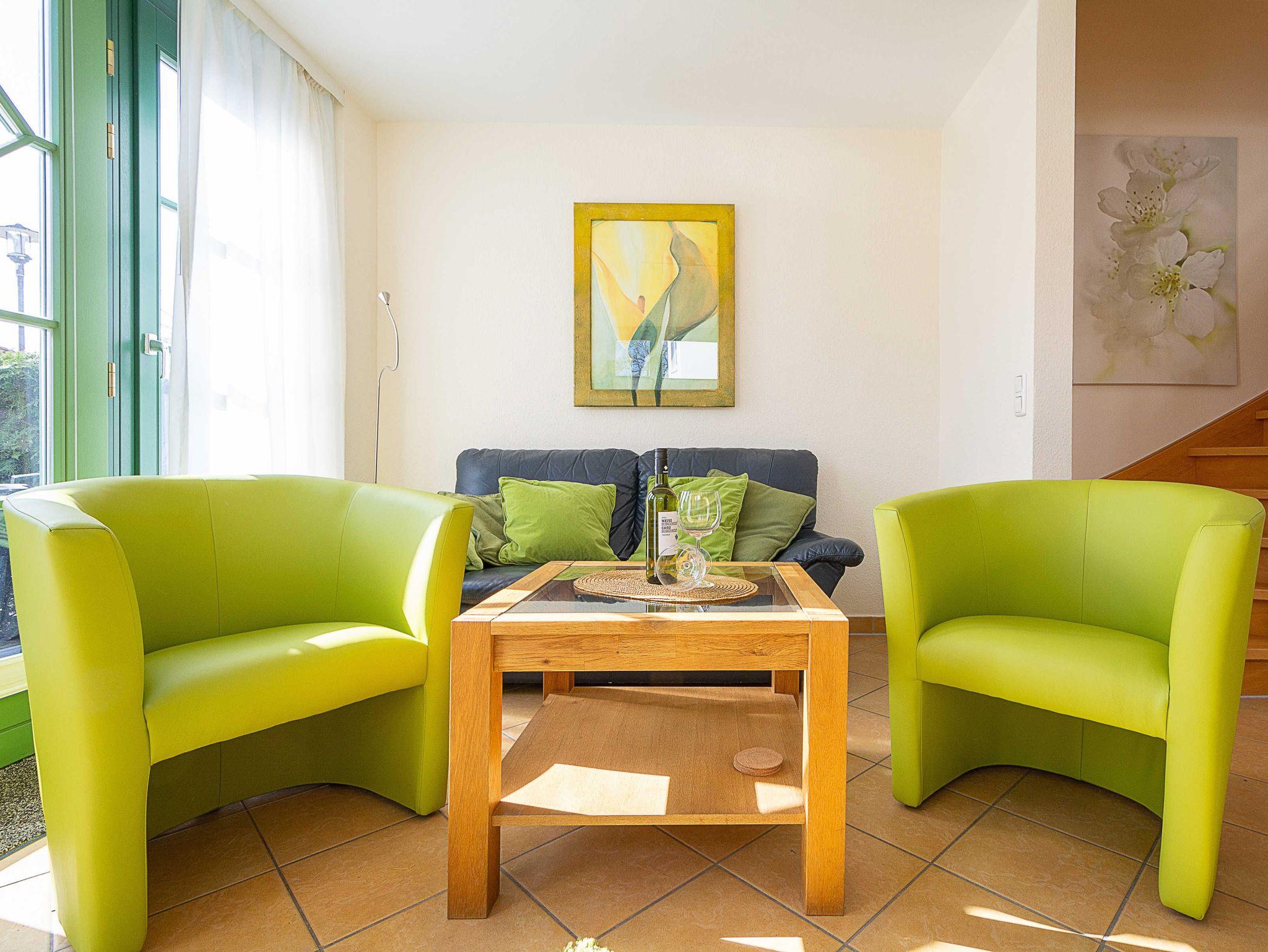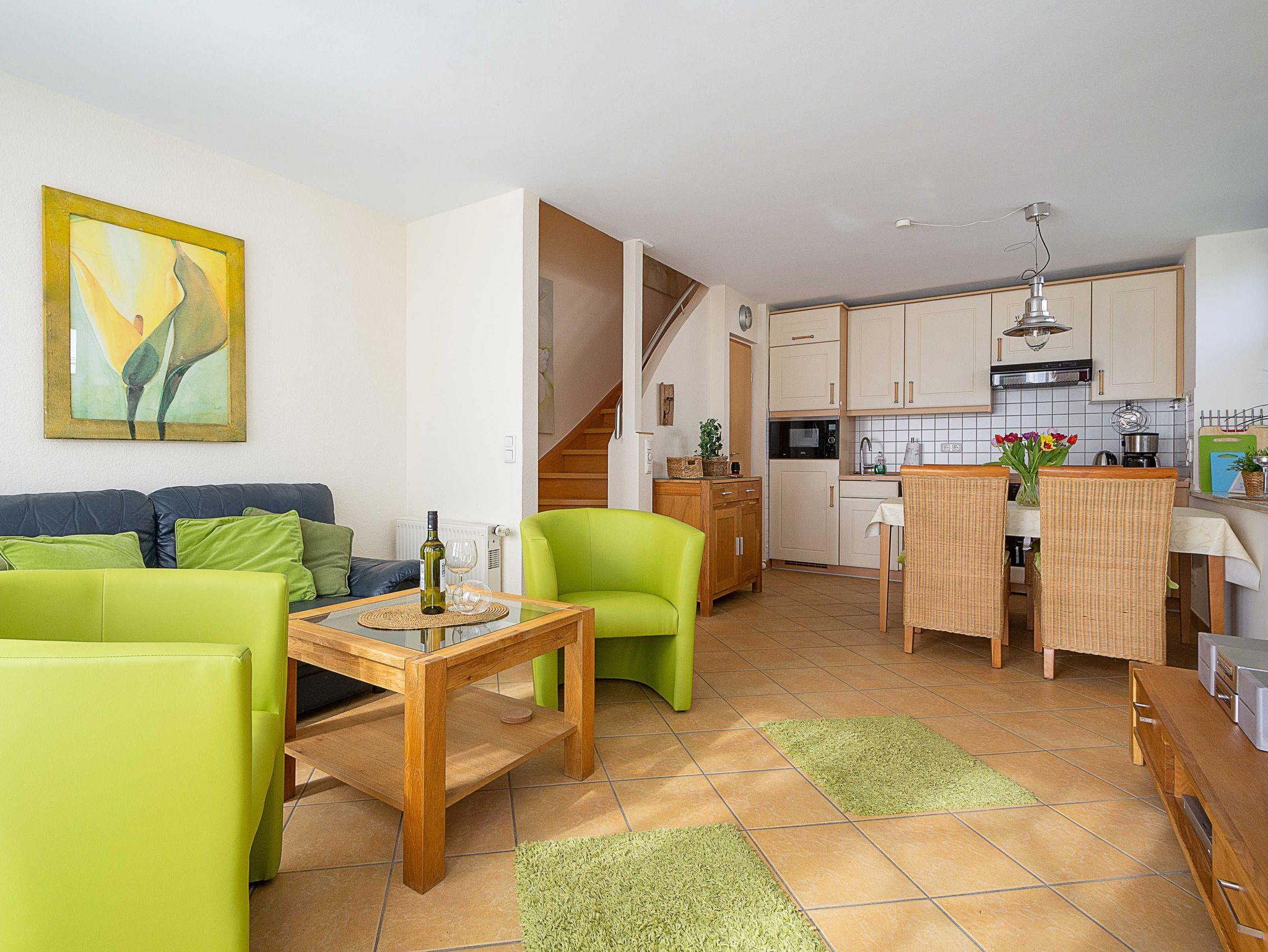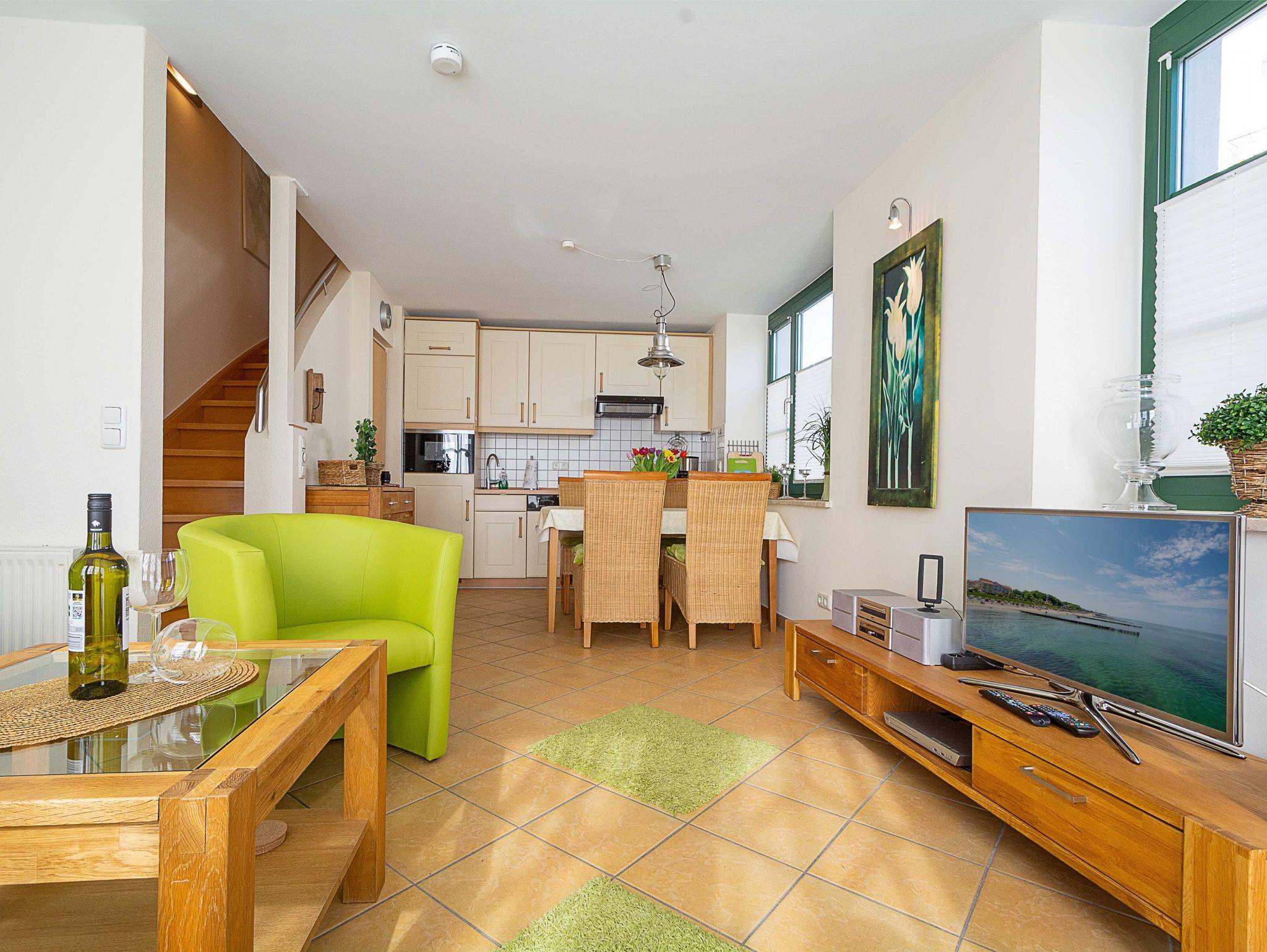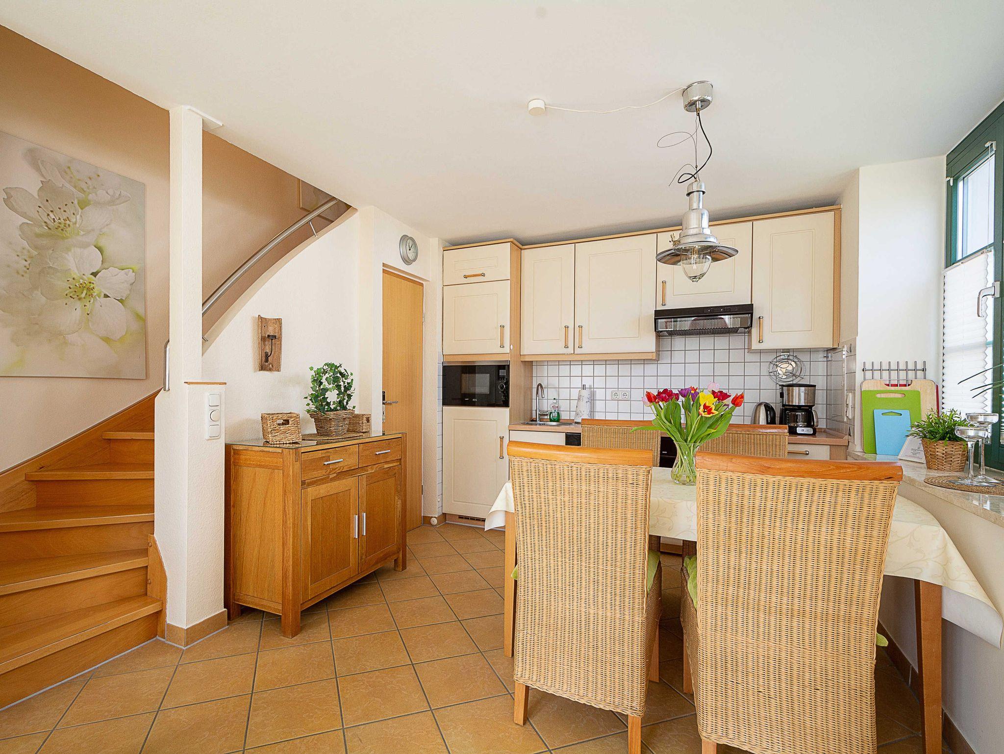 Hier werden Urlaubsträume wahr! Die wunderschöne helle Maisonette-Wohnung von ca. 56qm Größe. Sie betreten die liebevoll eingerichtete 3-Raum-Ferienwohnung, die über zwei Etagen (Erdgeschoss und erstes Obergeschoss) verläuft, über die große möblierte Terrasse. Im Erdgeschoss befindet sich der helle freundliche Wohnbereich, welcher über eine gemütliche Couchgarnitur, 32-Zoll-Flachbild-TV und Stereoanlage sowie einen Essbereich und eine Küchenzeile verfügt.