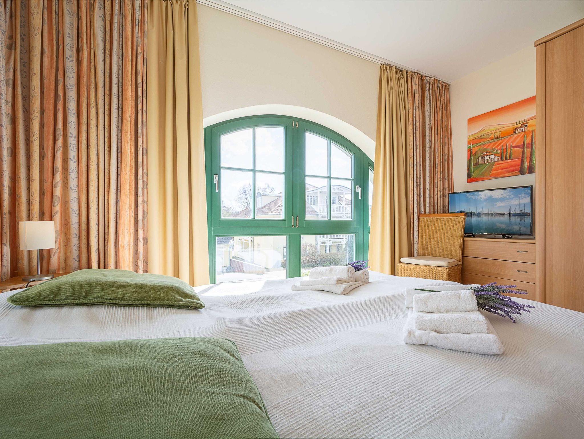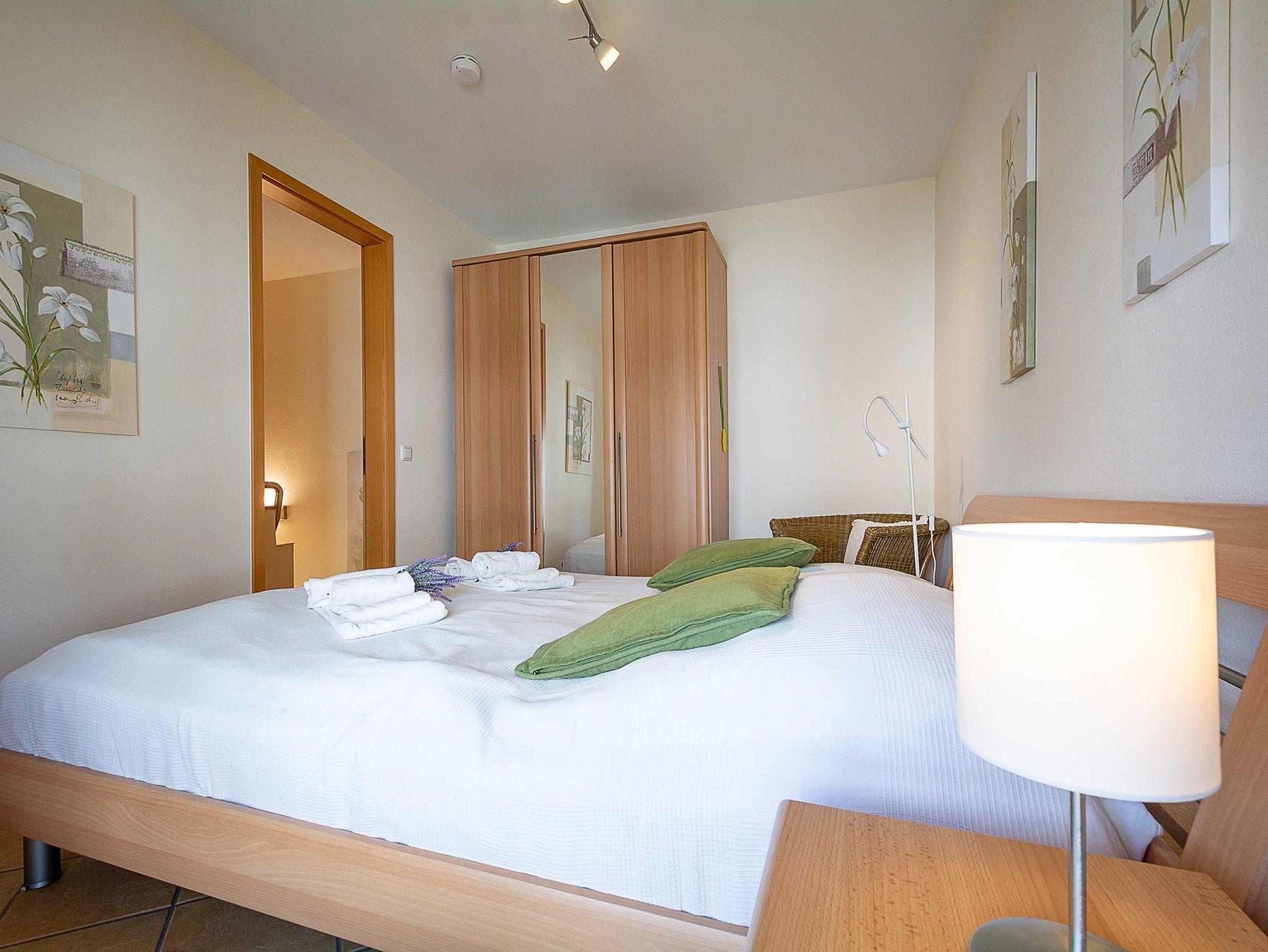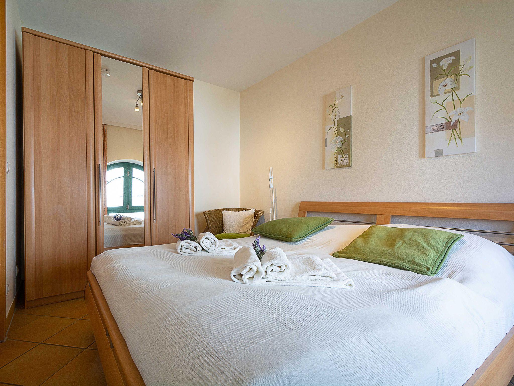Vom Wohnbereich betreten Sie über eine sich in der Wohnung befindliche Treppe die obere Etage, auf der sich das Bad und die beiden Schlafzimmer befinden. Die hellen Schlafzimmer sind jeweils ausgestattet mit einem hochwertigen Hasena-Doppelbett mit orthopädischen Matratzen und hochwertigen Toppern (Schlafzimmer 1 mit Härtegrad 2 und je 80cm Matratzenbreite, Schlafzimmer mit 2 Härtegrad 3 und je 80cm Matratzenbreite) und einem großen Kleiderschrank mit Ganzkörperspiegel, der genügend Platz für Ihre Urlaubsgarderobe bietet. Ein Schlafzimmer ist sogar mit einem 32-Zoll-Flatscreen-TV ausgestattet. Als Sichtschutz bzw. zum Verdunkeln sind in den Schlafzimmern Gardinen und Verdunklungs-Vorhänge an den Fenstern angebracht.