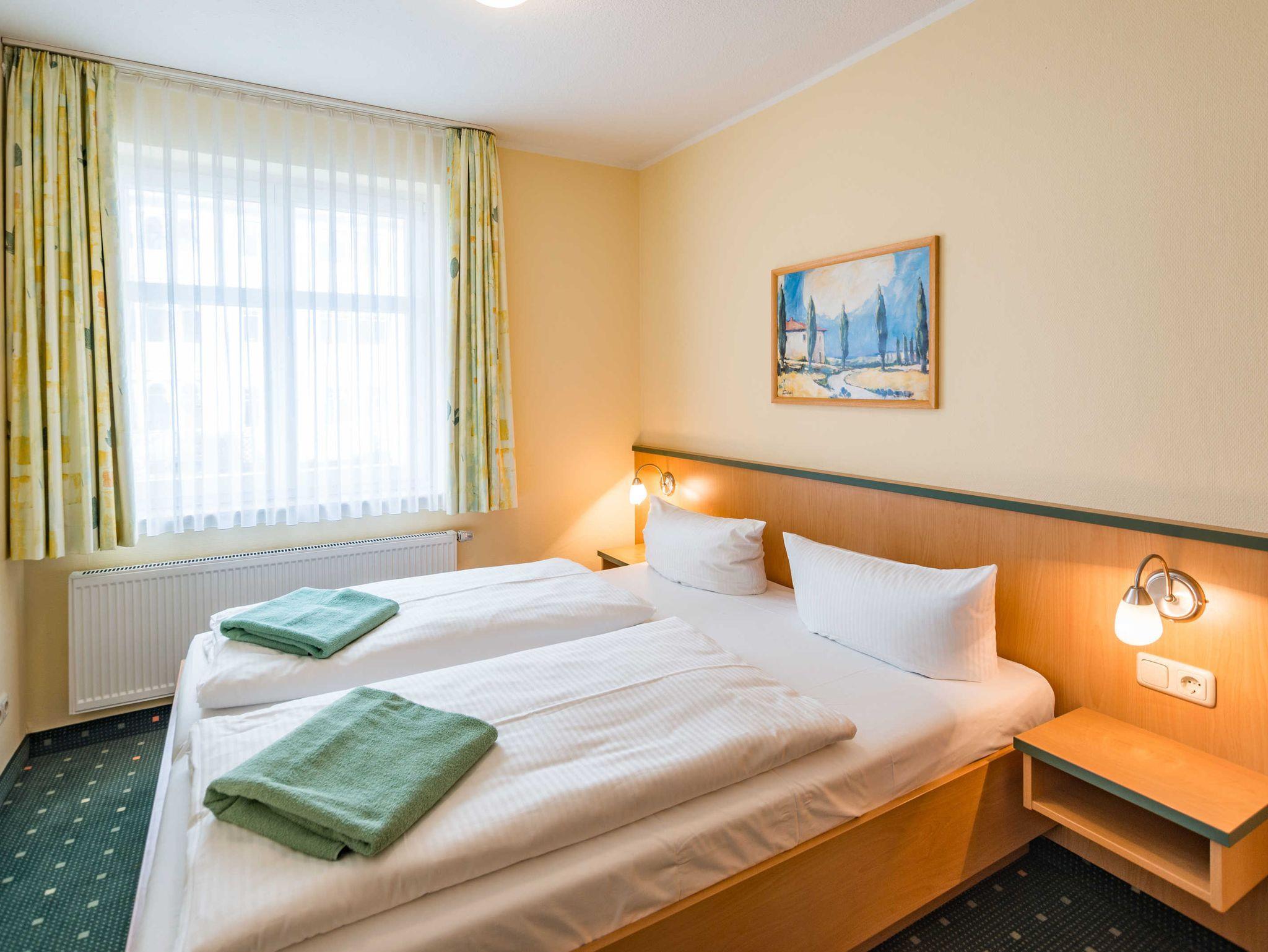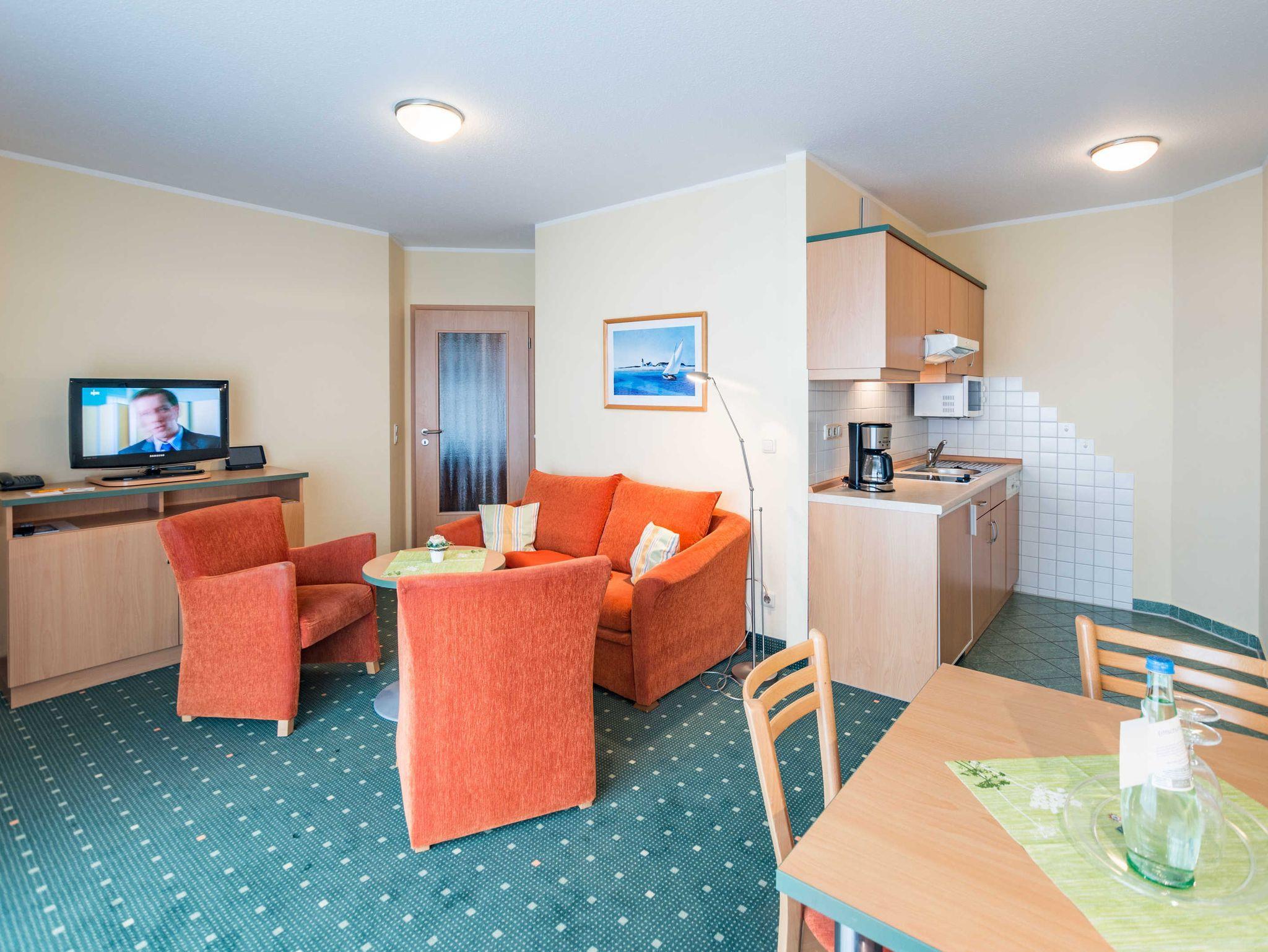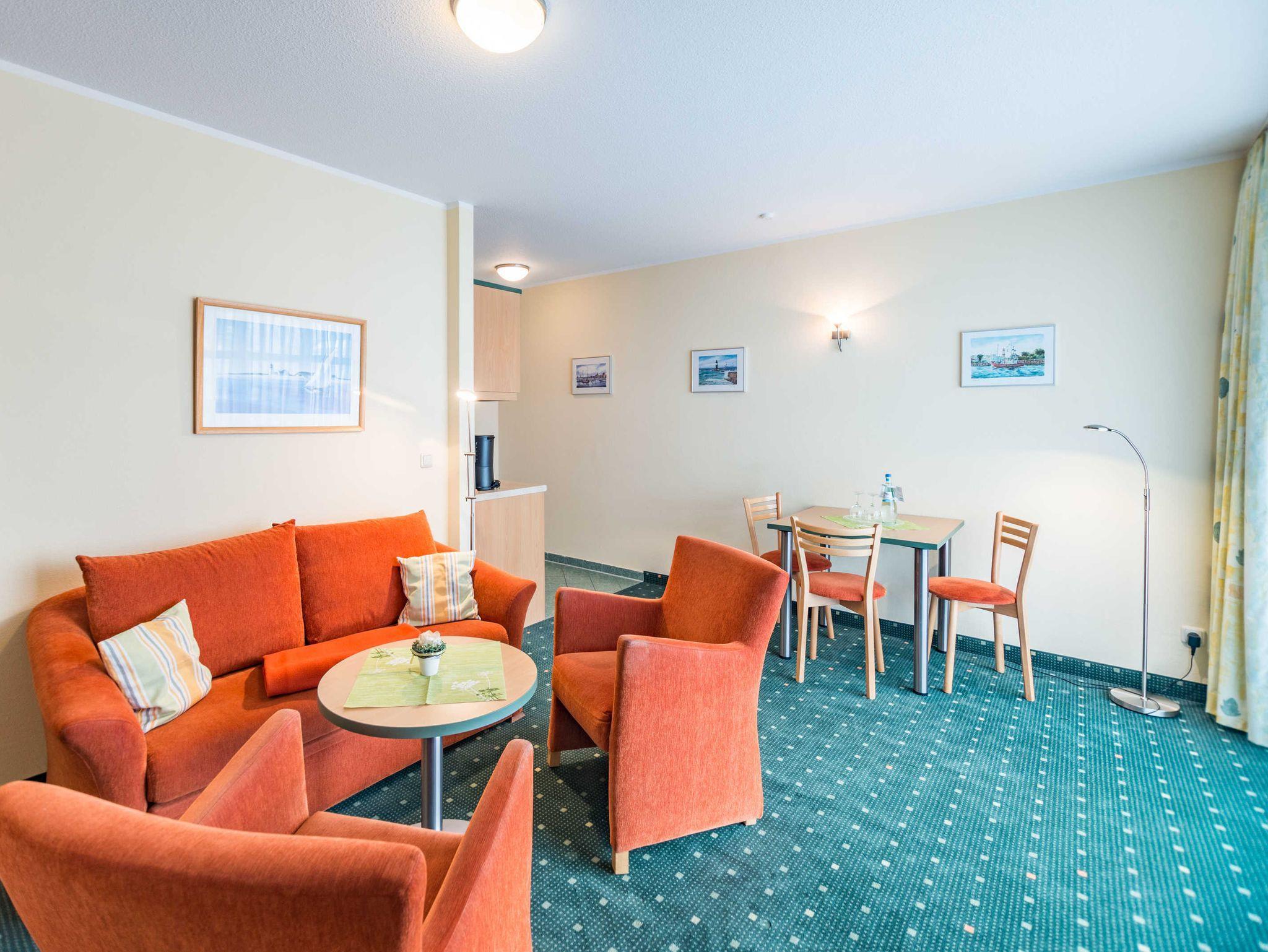 Das 2-Zimmer-Apartment mit Teppichboden befindet sich im 1. OG des Am Weststrand Apartmenthaus Bellamare. Mit ca. 40 m² Wohnfläche und einem Balkon zur Nordseite besteht das Apartment aus einem Wohnzimmer, einem Schlafzimmer, einer voll ausgestatteten Küchenzeile mit Geschirrspülmaschine, Kühlschrank, Mikrowelle, Zwei-Platten-Cerankochfeld, Kaffeemaschine, Wasserkocher und Toaster. Das Schlafzimmer verfügt über ein Doppelbett. Im Wohnzimmer gibt es eine Sitzecke mit Couch und Sessel sowie einen Esstisch mit 4 Stühlen. Die Couch im Wohnzimmer ist ebenfalls ausklappbar mit einer Größe von 1.40 x 2.00 m zum Schlafen für 1 bis 2 Personen geeignet. Weiterhin gibt es ein Bad mit Dusche, WC und Waschbecken sowie einen Flur. Das Apartment ist für maximal 3 Erwachsene und insgesamt 4 Personen geeignet. Haustiere sind in diesem Apartment nicht gestattet.
