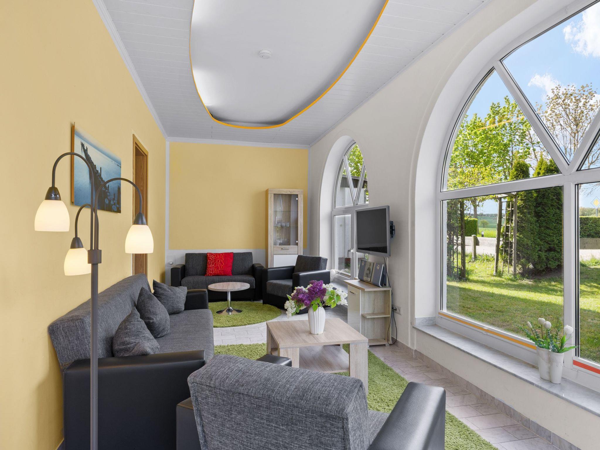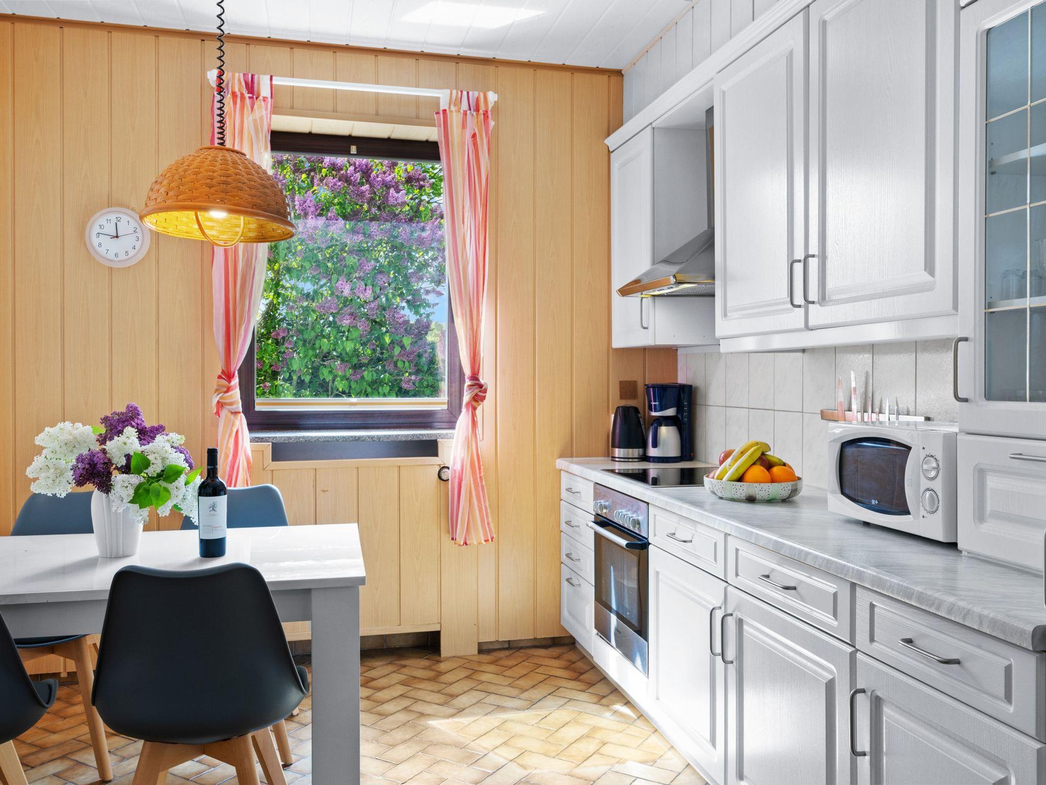 Helle und sehr großzügige 4- Zimmer Ferienwohnung mit separatem Wohnzimmer mit Couchecke, TV und Blick durch die großen Rundfenster in den Garten. Separate und umfangreich ausgestattete Küche mit 4- Plattenherd, Backofen, Geschirrspüler, Kühlschrank mit Gefrierfach, Kaffeemaschine, Wasserkocher, Mikrowelle und Toaster. Bad mit Dusche und WC. Schlafzimmer 1 mit Doppelbett (1,80 x 2m), Einzelbett und Kleiderschrank, Schlafzimmer 2 mit zwei Einzelbetten (0,90x2m) und Kleiderkommode.