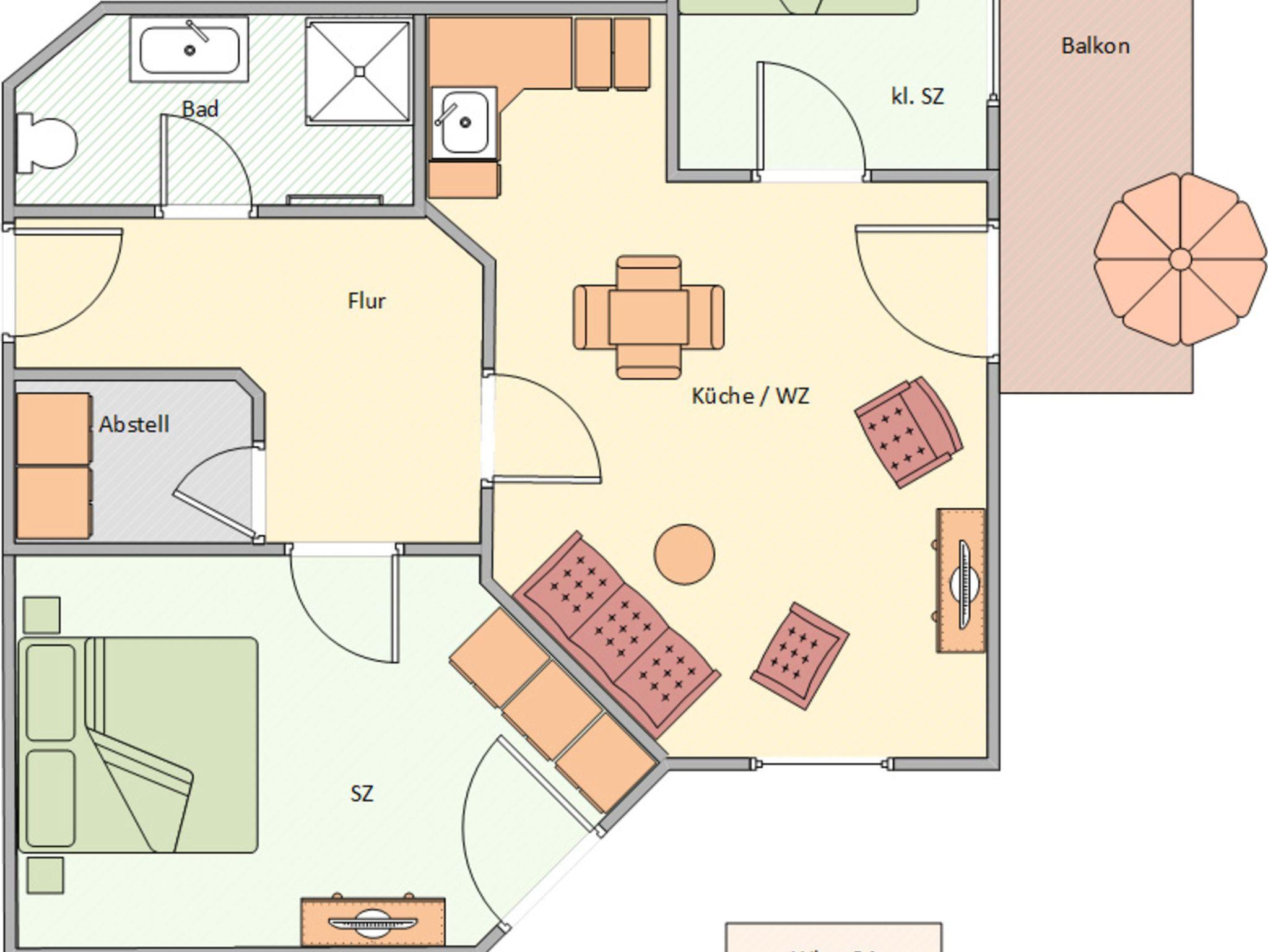 Die Wohnung ist im 2. Obergeschoss gelegen und hat einen Balkon zur Westseite. Die Wohnungsgröße beträgt ca. 60 qm und teilt sich in Wohnzimmer, angrenzende Küche, Schlafzimmer, kl. Kinderzimmer, Duschbad, Flur und Abstellkammer. Im Wohnzimmer befindet sich ein Esstisch mit 4 Stühlen. Küche ist mit einer Spülmaschine, Kühlschrank, Ceranfeld, Mikrowelle mit Backofen, Tresor, HD-Sat TV und Telefon.