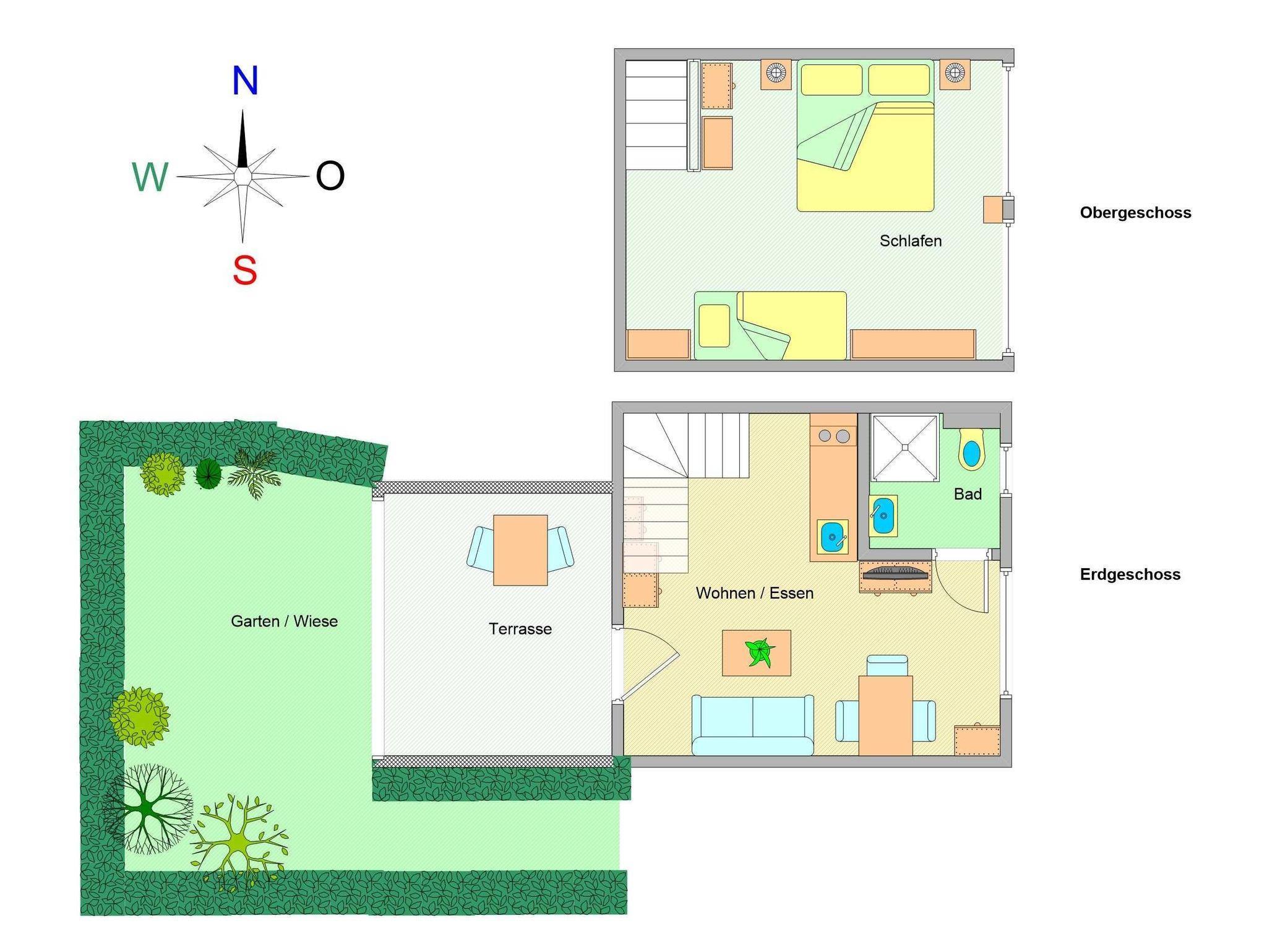 Sie wohnen in einem ca. 50m² großen Ferienhaus, das über 2 Etagen verläuft. Im Erdgeschoss finden Sie das helle Wohnzimmer mit einem gemütlichen Sofa, einer Essecke, dem Flachbild-TV, Kleiderschrank und die im Jahr 2021 neu eingebaute Küchenzeile (2-Platten-Herd, Geschirrspüler, Mikrowelle, Kühlschrank, Kaffeemaschine, Wasserkocher, Toaster). Das Duschbad finden Sie ebenso im Erdgeschoss. Über eine Holztreppe gelangen Sie in das Obergeschoss. Hier befindet sich das Schlafzimmer und ist ausgestattet mit einem großen Doppelbett, einem Einzelbett und vielen Regalen. Die kleine Grünfläche vor dem Haus lädt zum Entspannen ein.