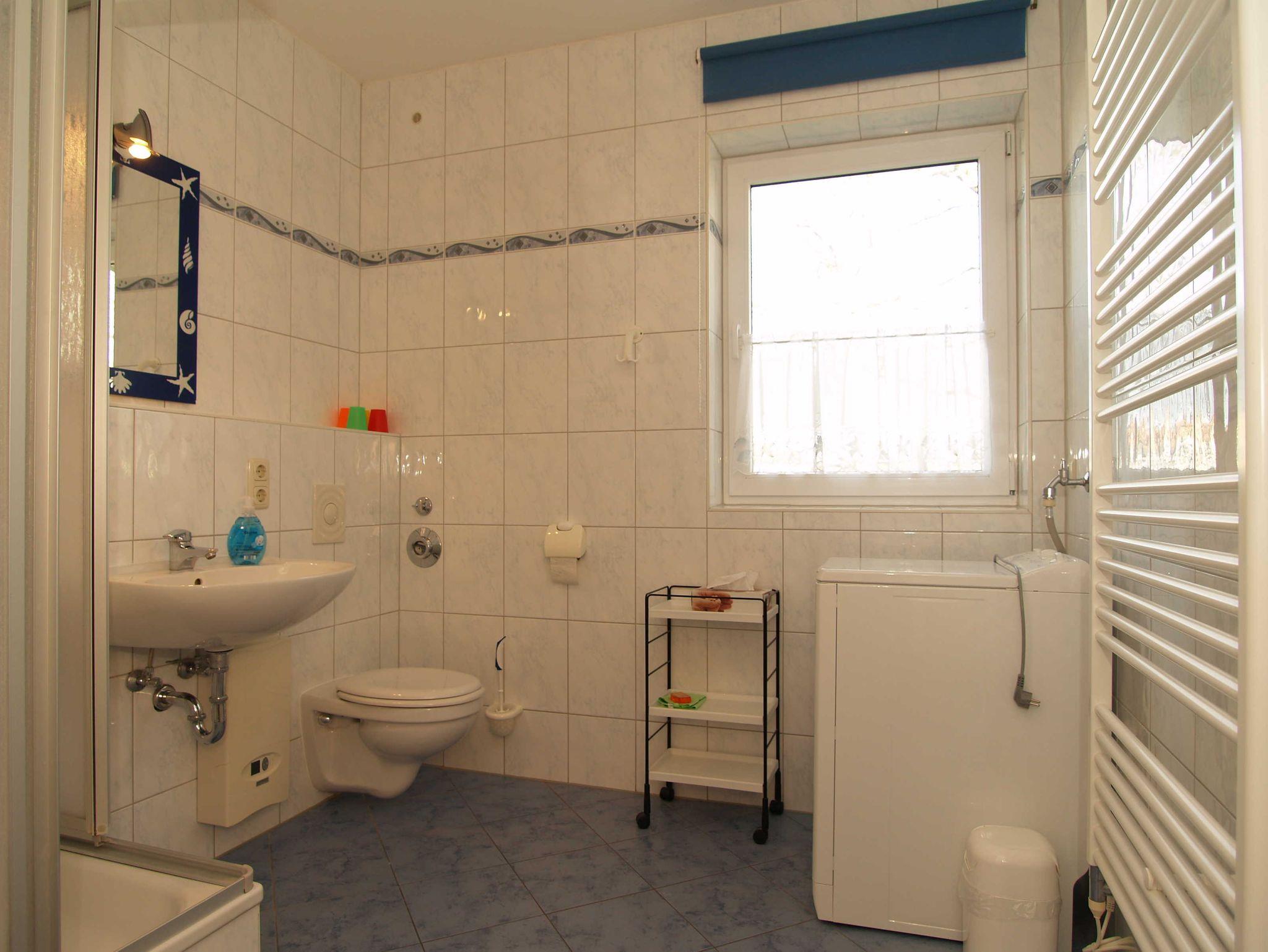 Das geflieste Tageslichtbad ist ausgestattet mit einer Dusche, Waschbecken und WC sowie einer Waschmaschine. Ein Handtuchheizkörper sorgt für kuschelig warme Handtücher und vervollständigt die Badausstattung.