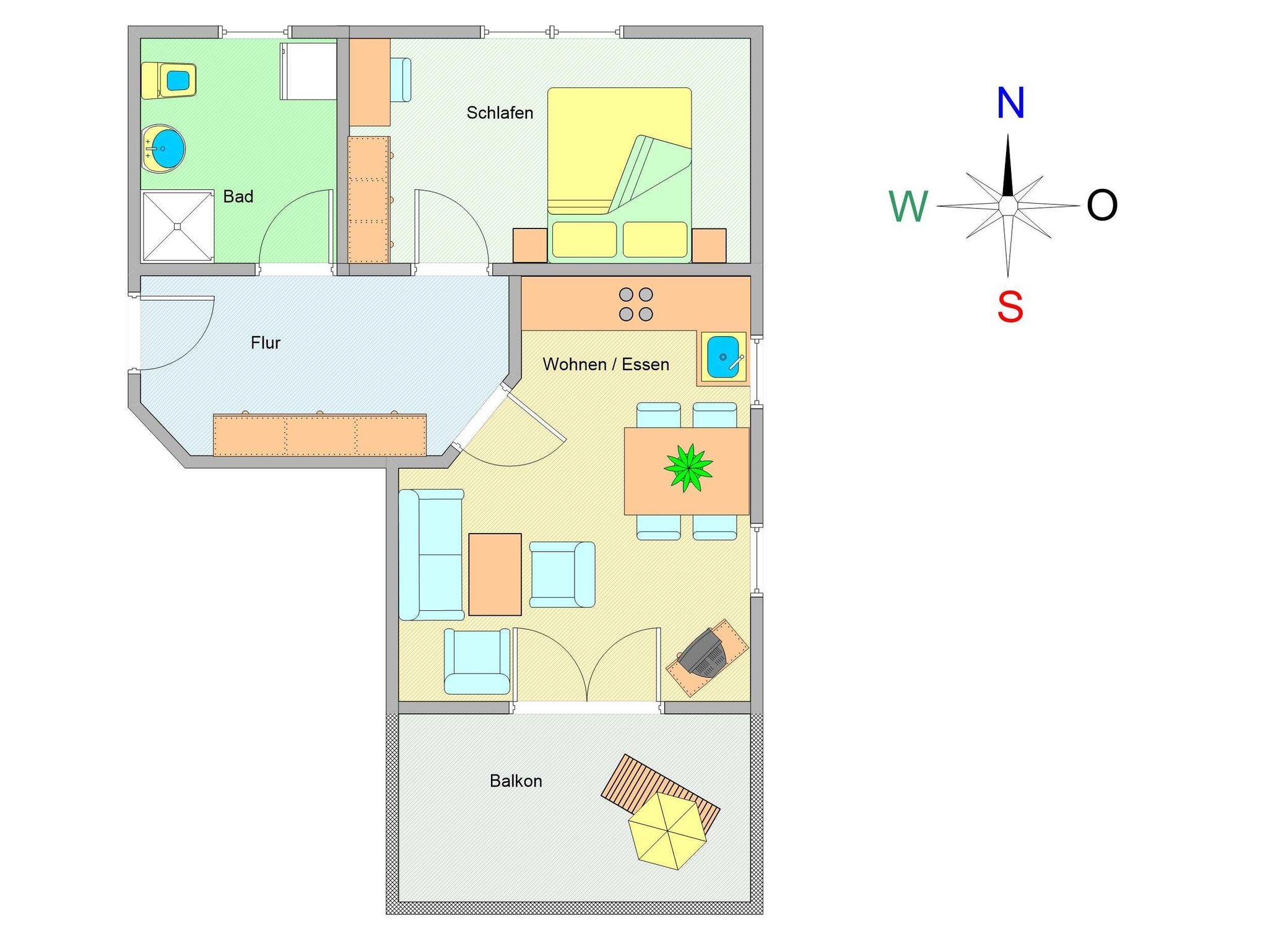 Herzlich Willkommen in der Wohnung 4 in der Waldstraße 30! Die gemütlich eingerichtete 2-Raum-Ferienwohnung mit einer Gesamtfläche von 54 qm befindet sich im 1. Obergeschoss des Appartementhauses.
