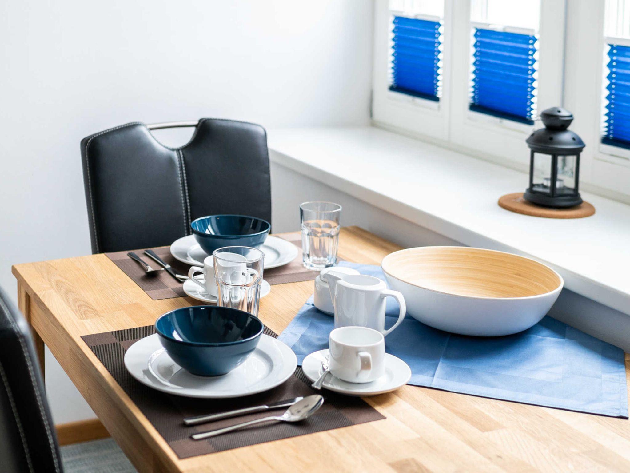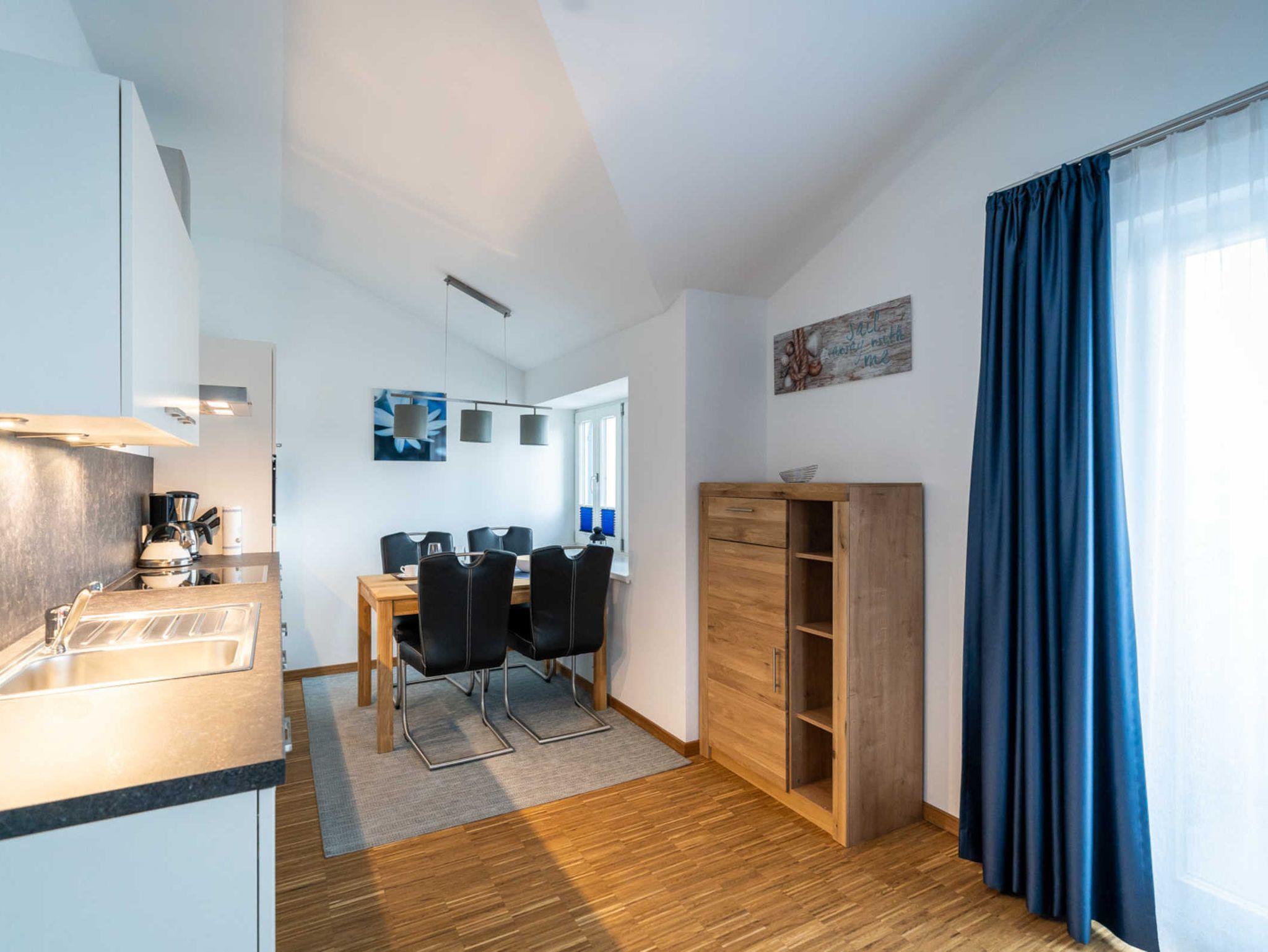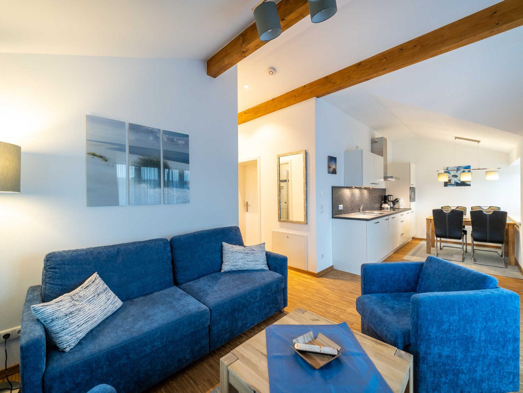 An den gemütlich eingerichteten Wohnraum schließt sich eine moderne, voll ausgestattete offene Küche mit Spülmaschine, Kühlschrank, Backofen, Cerankochfeld, Kaffeemaschine, Toaster, Wasserkocher und ausreichend Geschirr an, auf dem zugehörigen Balkon kann man die Abendsonne genießen. WLAN und internetfähige TV-Flachbildschirme sind in jedem Raum selbstverständlich, das geräumige Schlafzimmer mit großem Wandschrank und Boxspringbett sowie das schöne Bad mit ebenerdiger Überkopfdusche und WC vervollständigen die moderne Ferienwohnung Brise.