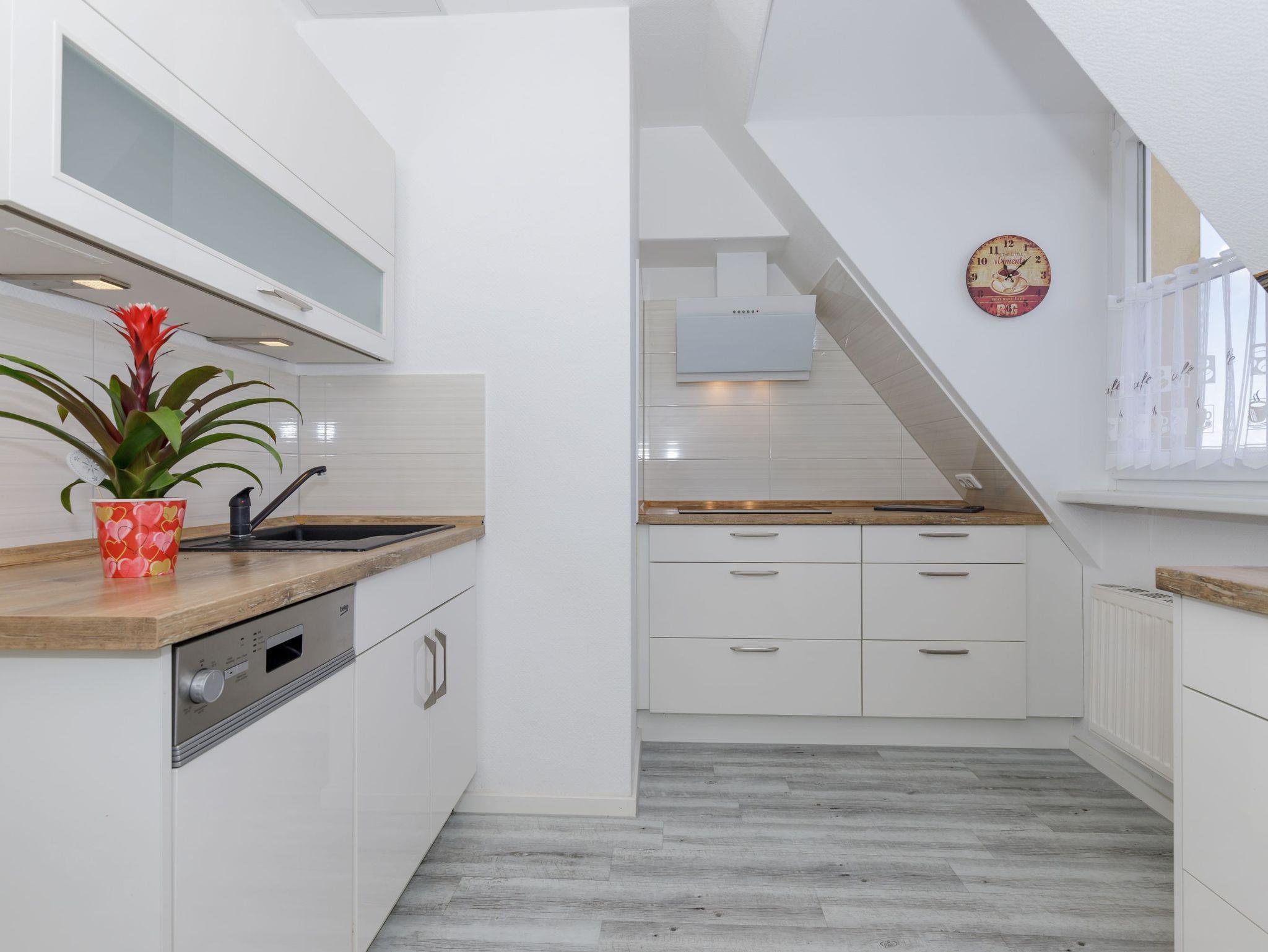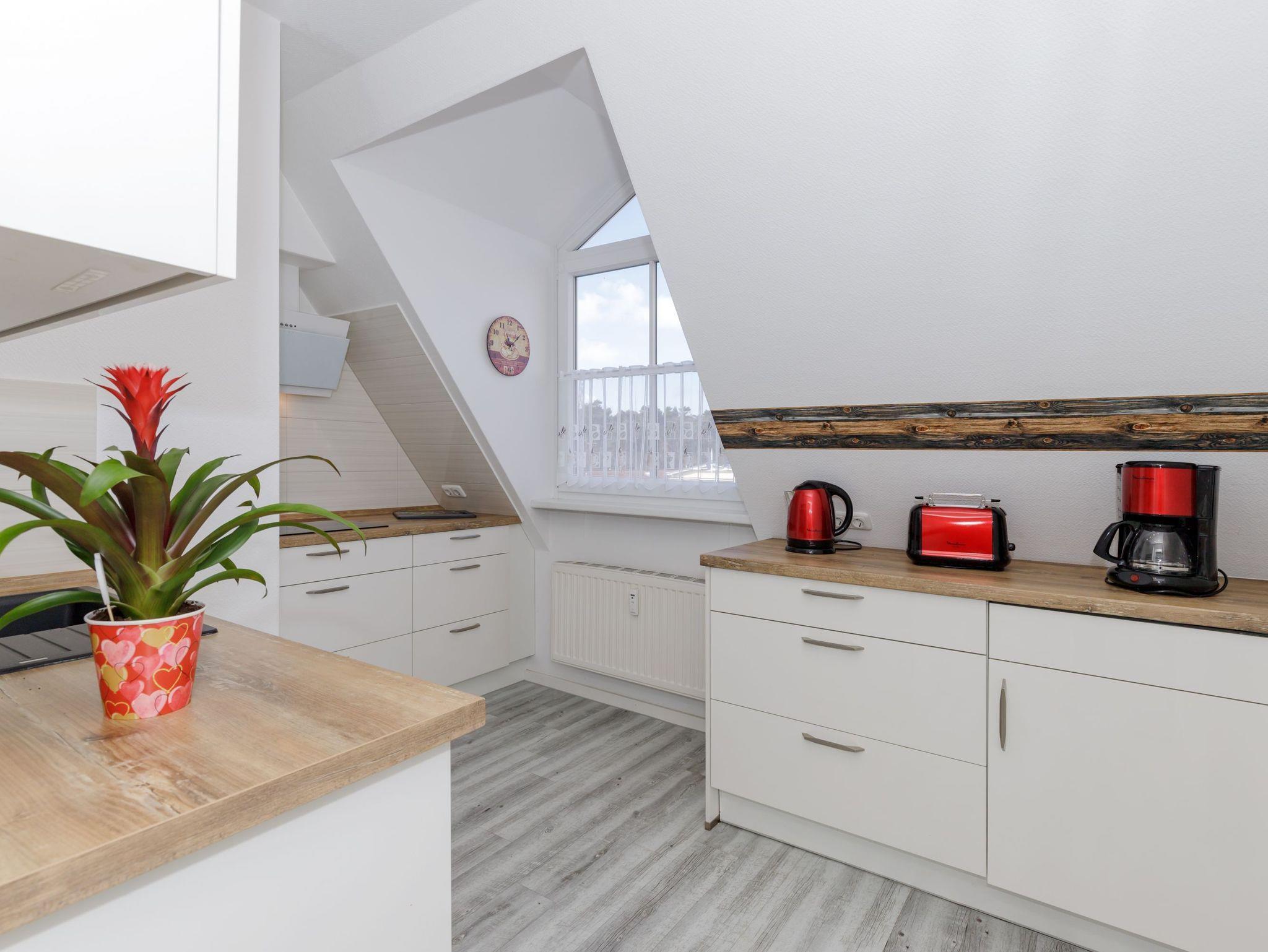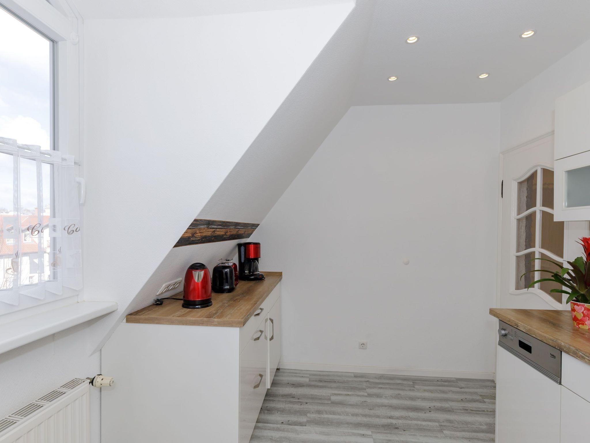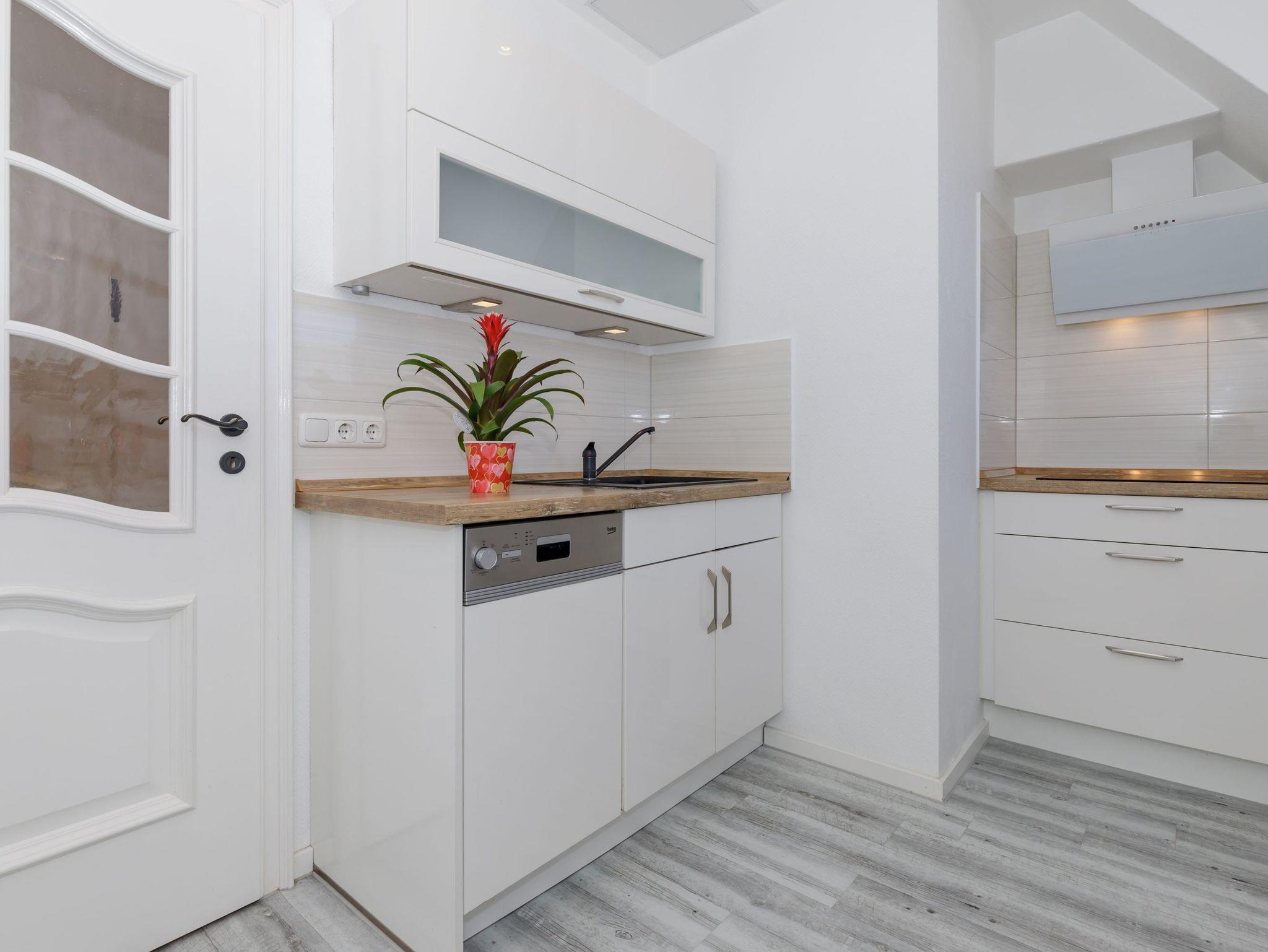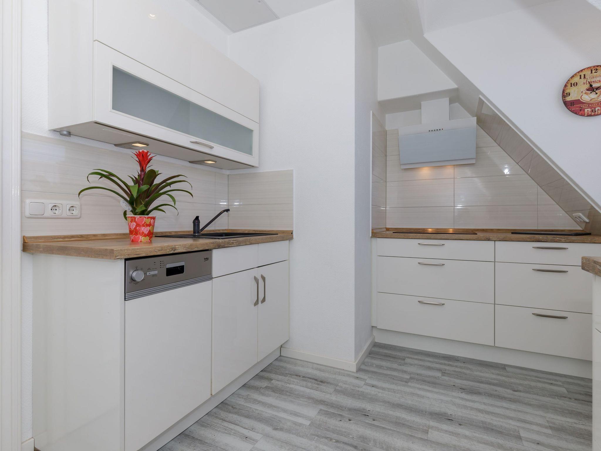 Die separate Küche ist gut ausgestattet mit einem Kühlschrank mit Gefrierfach, einer Spüle, einem Geschirrspüler, einem Cerankochfeld, einem Toaster und einer Kaffeemaschine.