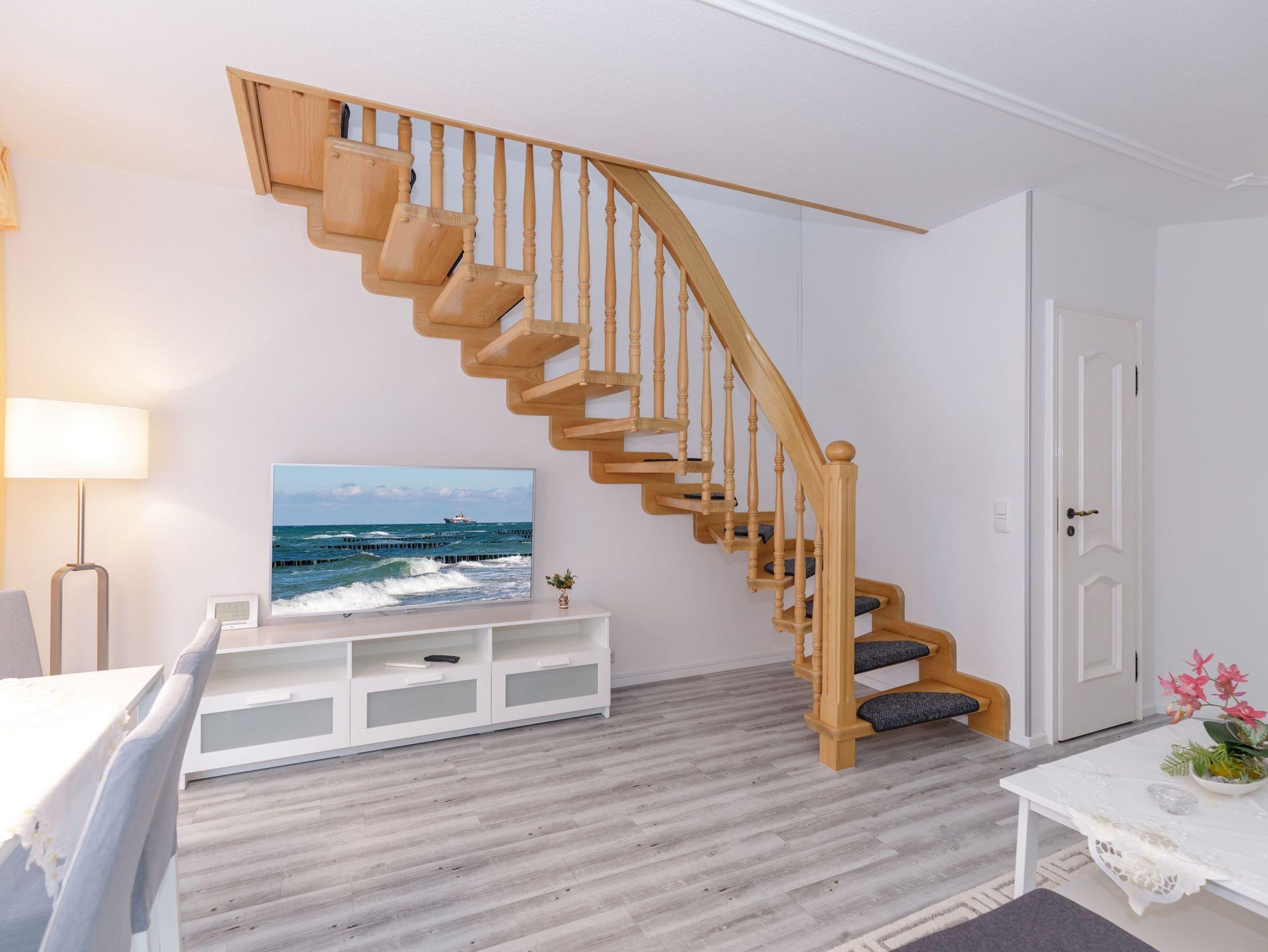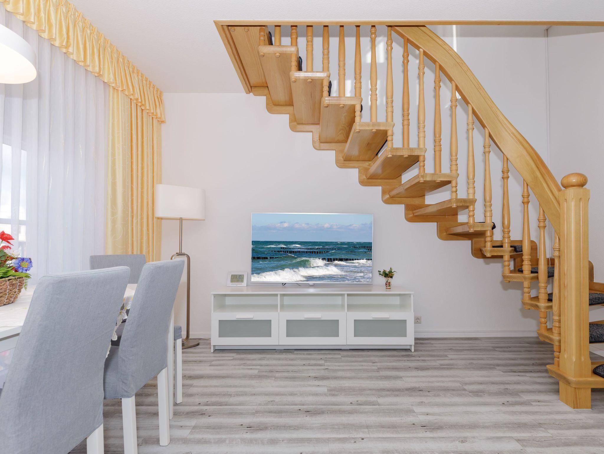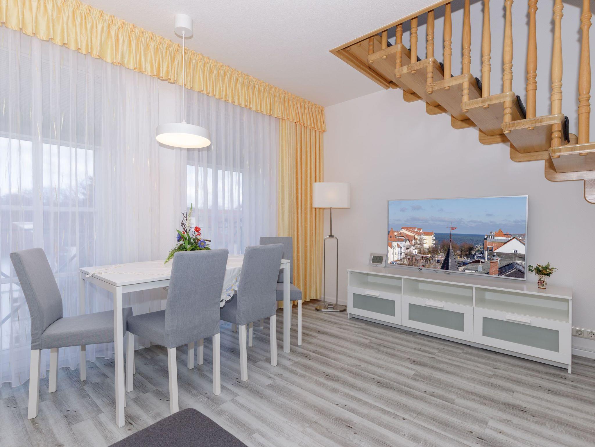 Mit dem Fahrstuhl gelangen Sie in das Appartement im 4. Obergeschoss. Über eine Treppe erreichen Sie den Schlafbereich auf der Galerie. Es verfügt über ein geräumiges Wohnzimmer mit Essbereich einem Flachbild-TV, ein Schlafzimmer mit Doppelbett sowie ein Badezimmer mit Dusche. Über die Galerie erreichen Sie die Dachterrasse, die einen exklusiven Blick auf Kühlungsborn bietet.