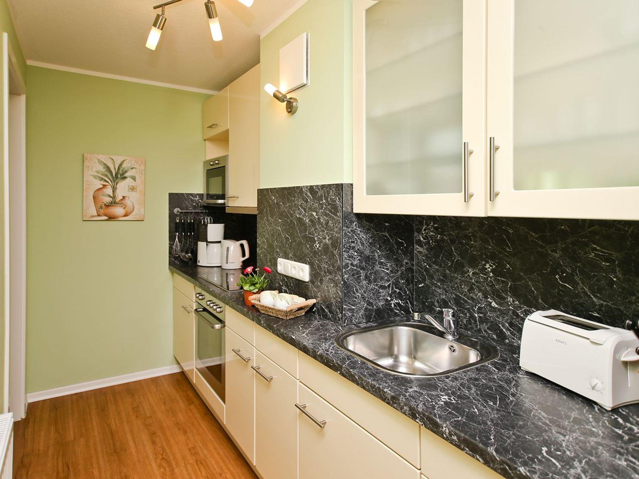 Die Küchenzeile ist ausgestattet mit einem Ceranherd mit Backofen, Geschirrspüler und Mikrowelle.
