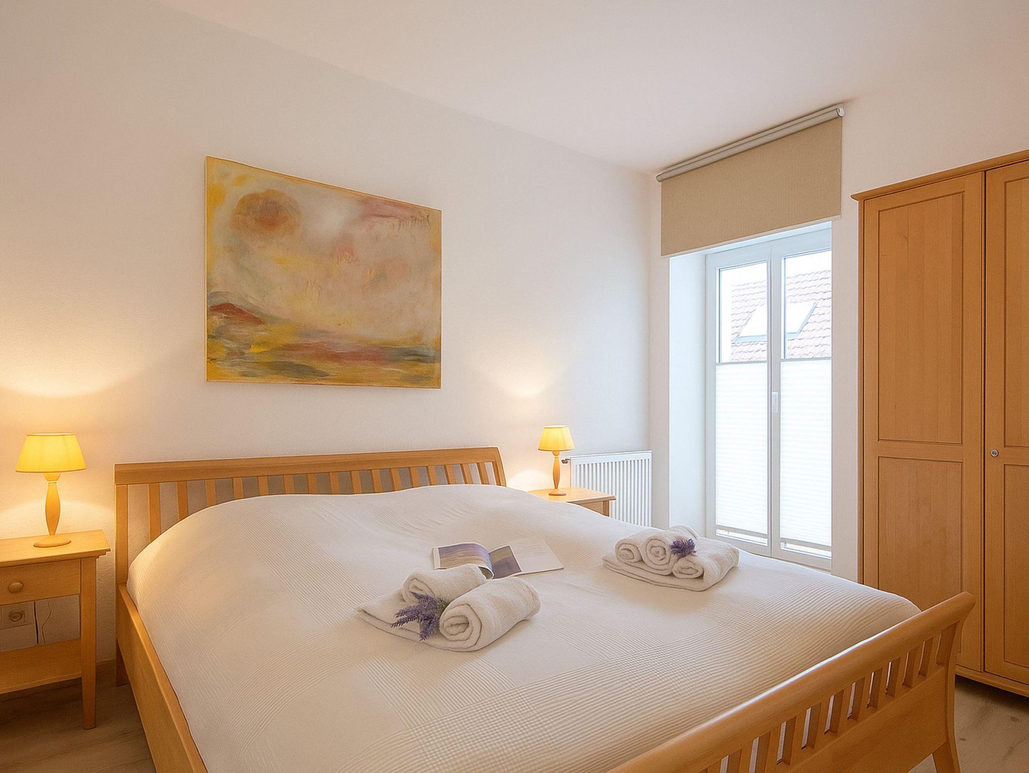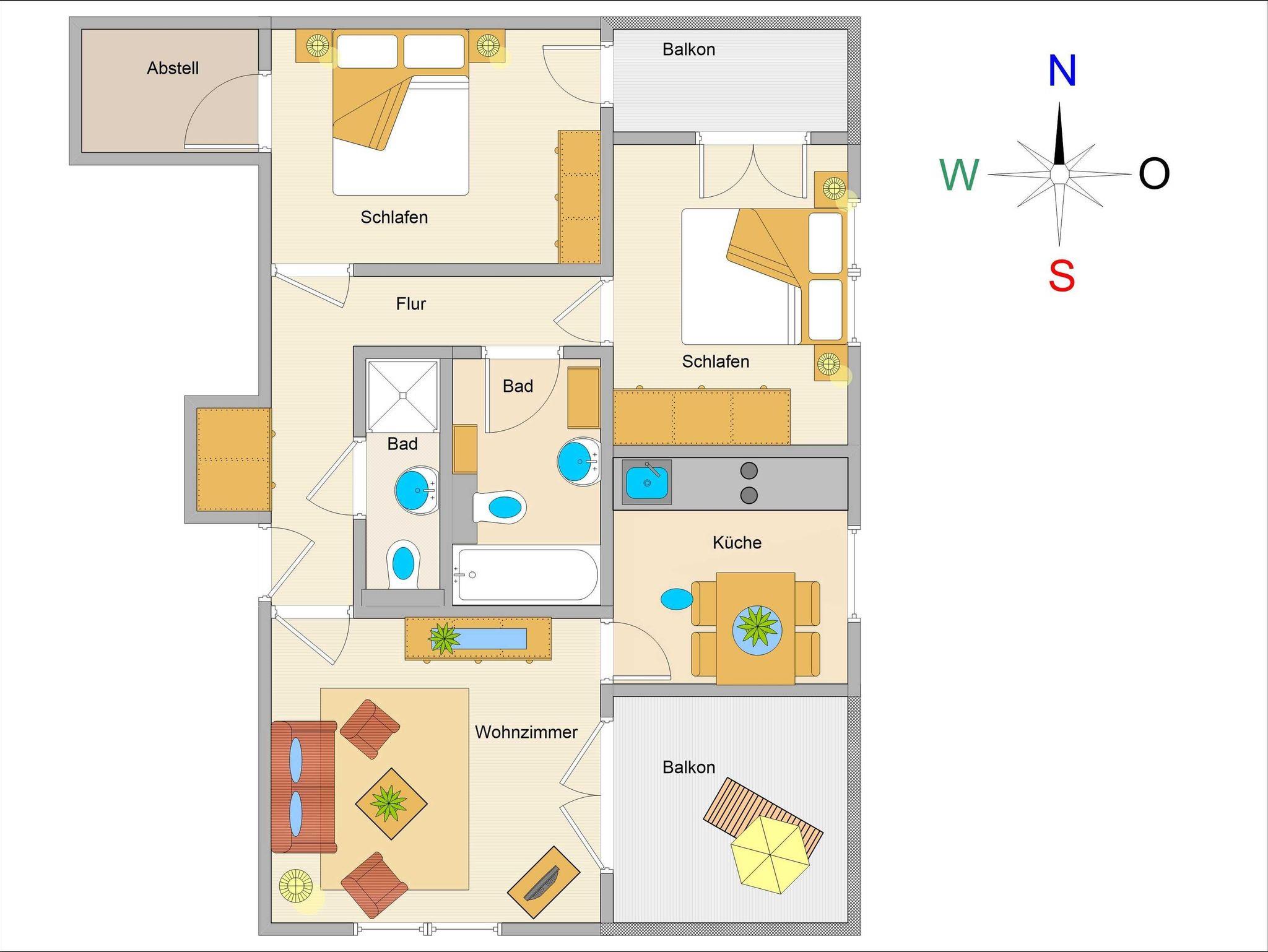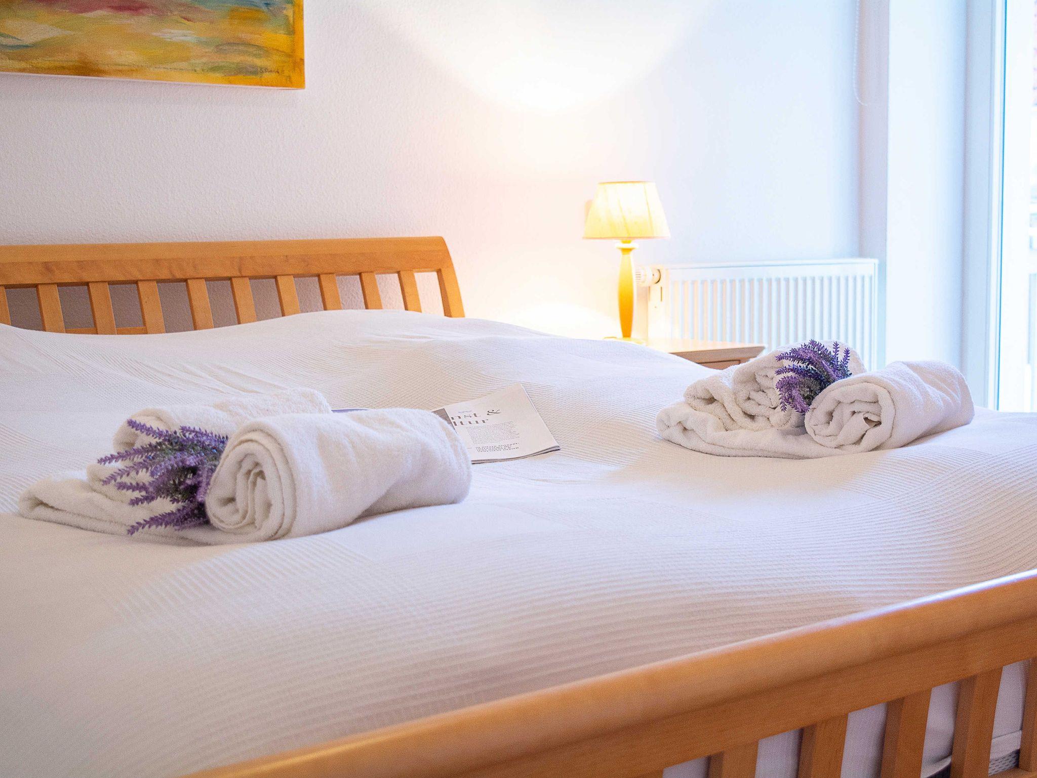 Vom Wohnraum aus gelangen Sie auf den ersten Balkon, der nach Süd-Osten ausgerichtet ist und morgens herrlichen Sonnenschein bietet. Beide Schlafzimmer führen auf den zweiten Balkon, der nach Nord-Osten ausgerichtet ist und einen ruhigen Rückzugsort bietet. Das erste Schlafzimmer ist mit einem komfortablen Doppelbett (180 cm x 200 cm) und einem geräumigen Kleiderschrank ausgestattet. Auch im zweiten Schlafzimmer erwartet Sie ein Doppelbett (160 cm x 200 cm) für erholsame Nächte. Die Wohnung ist sowohl gefliest als auch mit Laminat ausgestattet.