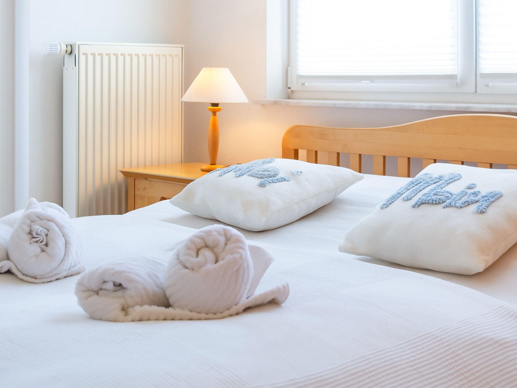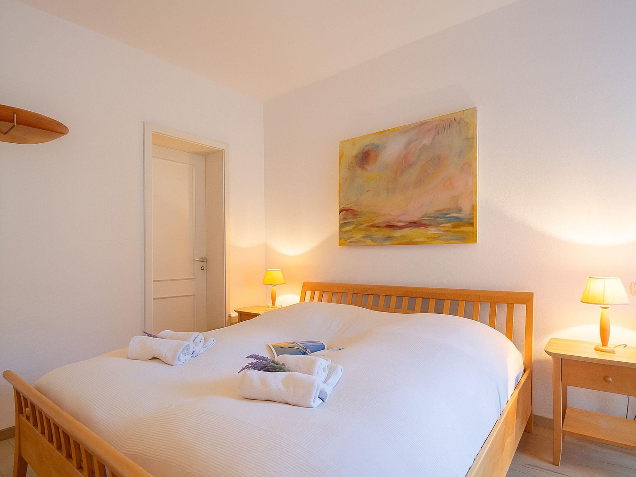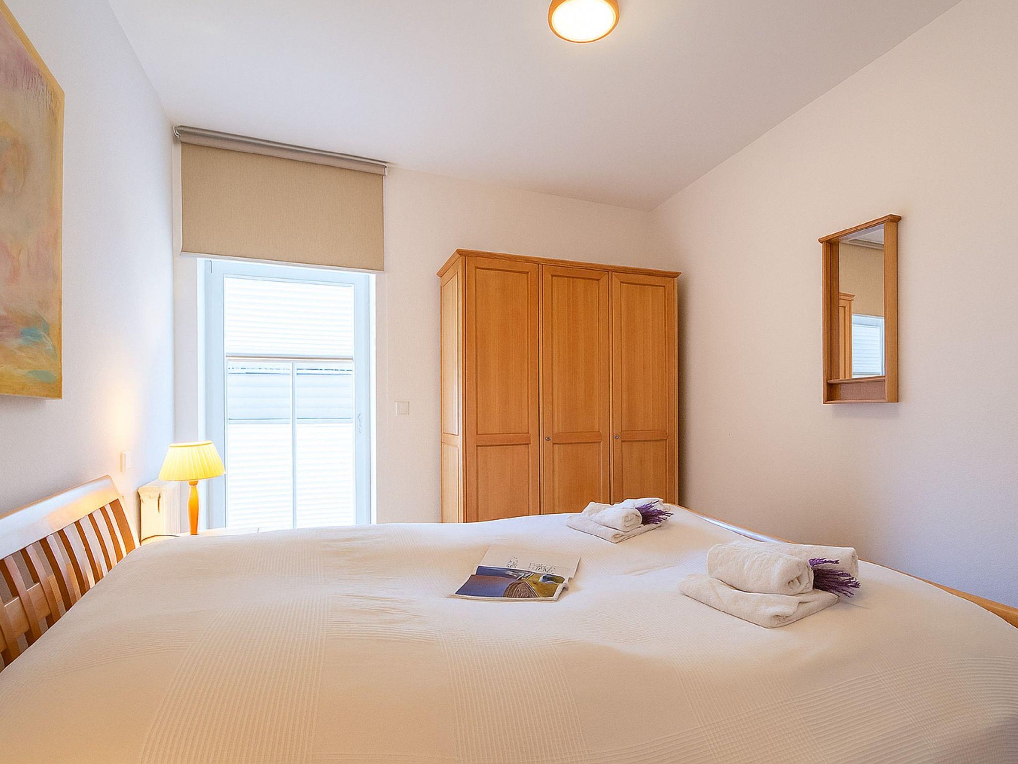 Vom Wohnraum aus gelangen Sie auf den ersten Balkon, der nach Süd-Osten ausgerichtet ist und morgens herrlichen Sonnenschein bietet. Beide Schlafzimmer führen auf den zweiten Balkon, der nach Nord-Osten ausgerichtet ist und einen ruhigen Rückzugsort bietet. Das erste Schlafzimmer ist mit einem komfortablen Doppelbett (180 cm x 200 cm) und einem geräumigen Kleiderschrank ausgestattet. Auch im zweiten Schlafzimmer erwartet Sie ein Doppelbett (160 cm x 200 cm) für erholsame Nächte. Die Wohnung ist sowohl gefliest als auch mit Laminat ausgestattet.