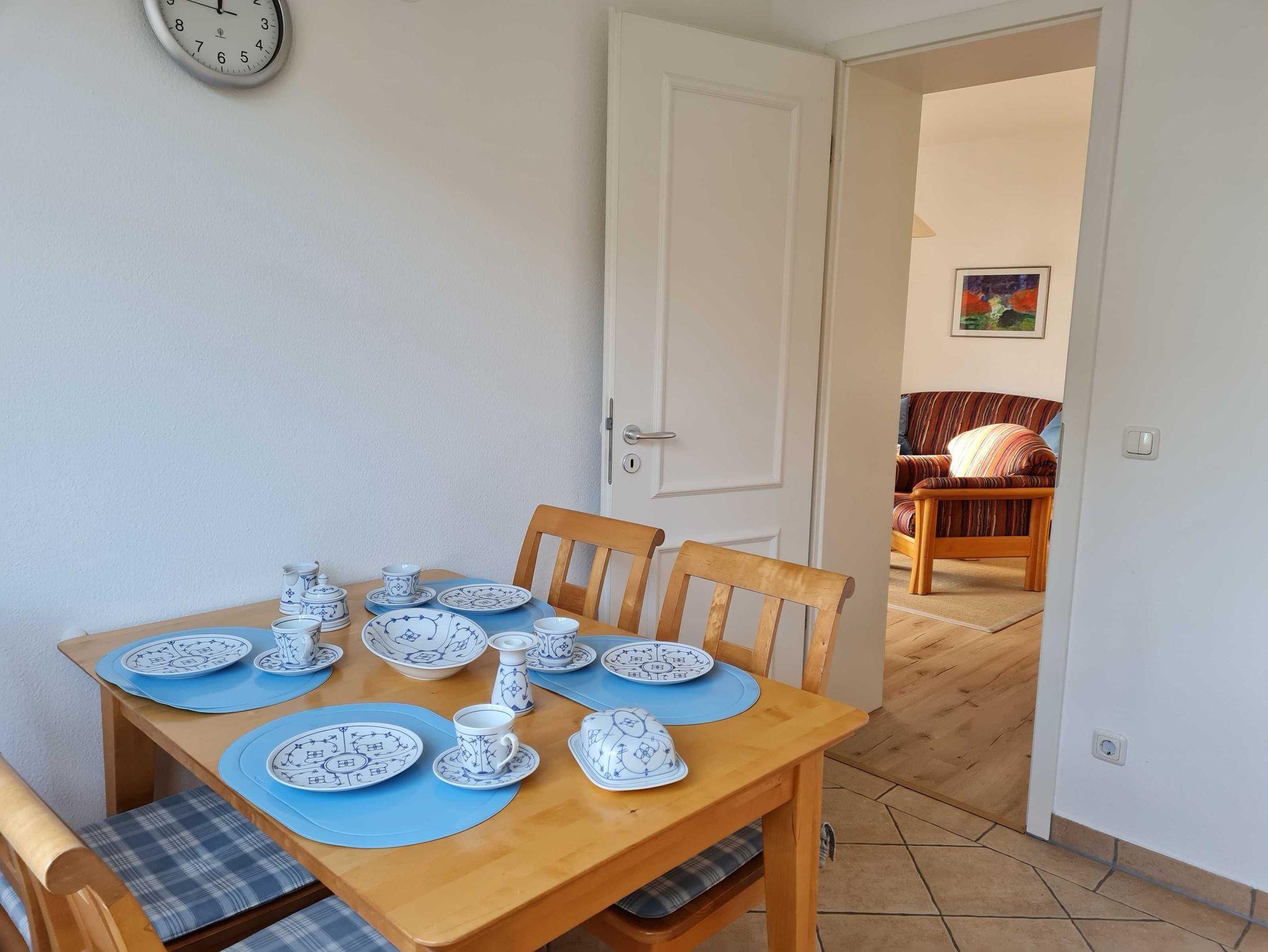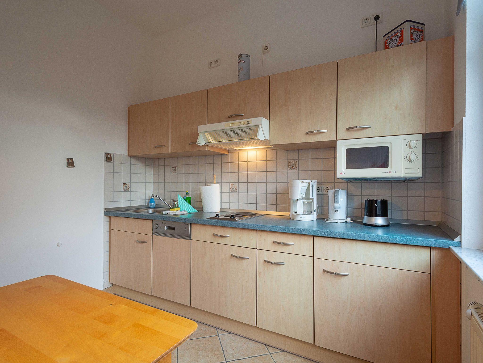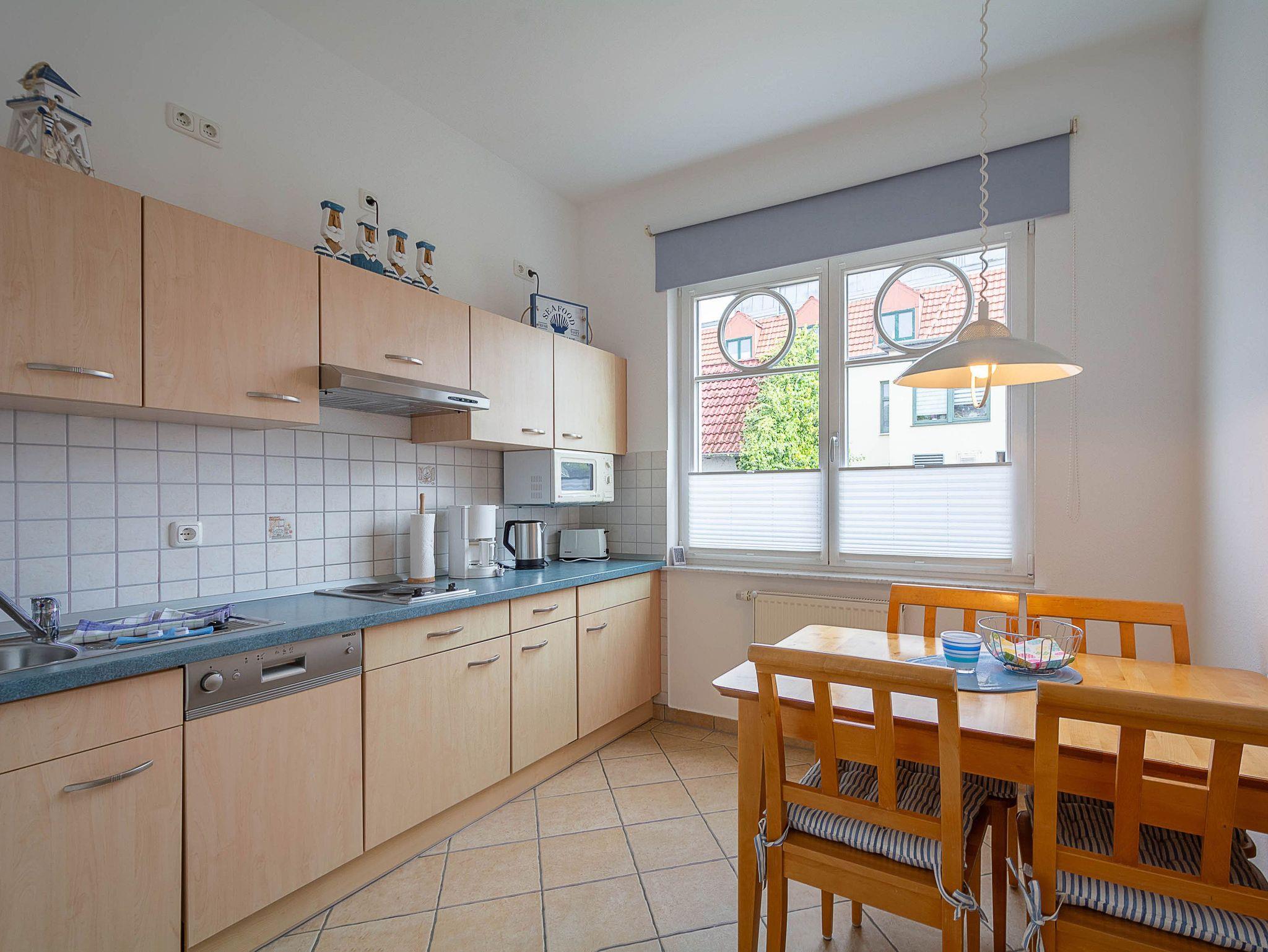 Vom Wohnraum betreten Sie die separate Küche, die mit allen wichtigen Küchengeräten und -utensilien eingerichtet ist, die Sie für Ihren perfekten Ostseeurlaub benötigen. Ein 2-Platten-Kochfeld mit Dunstabzug, ein Kühlschrank mit Gefrierfach sowie eine Mikrowelle befinden sich in der gut ausgestatteten Küche. Eine Kaffeemaschine, ein Wasserkocher, ein Toaster sowie ausreichend Geschirr und ein Esstisch komplettieren die Kücheneinrichtung.