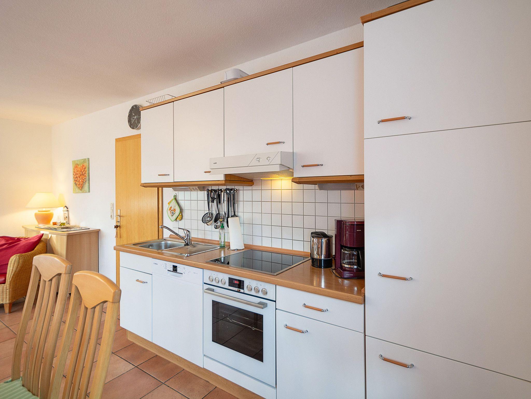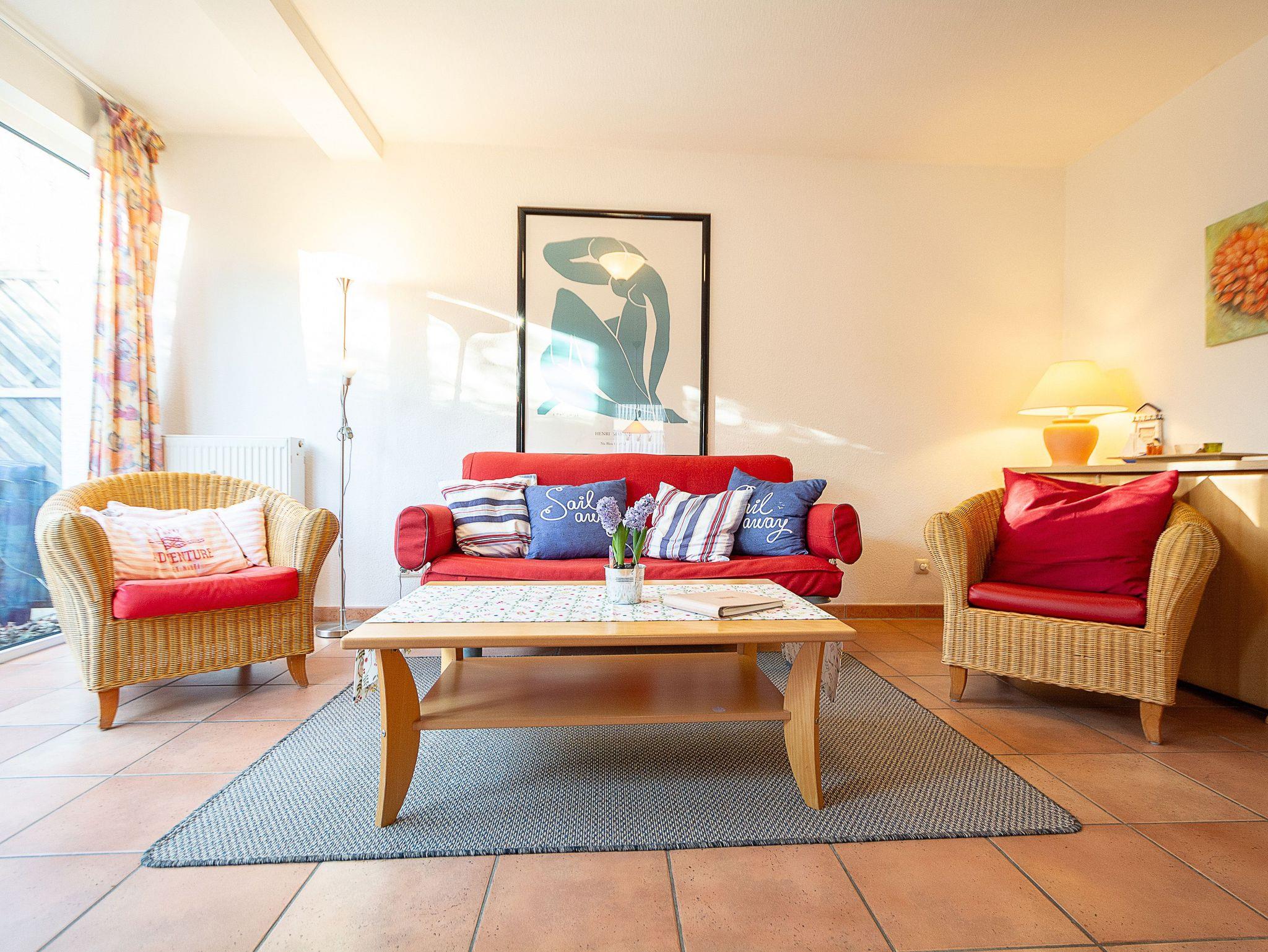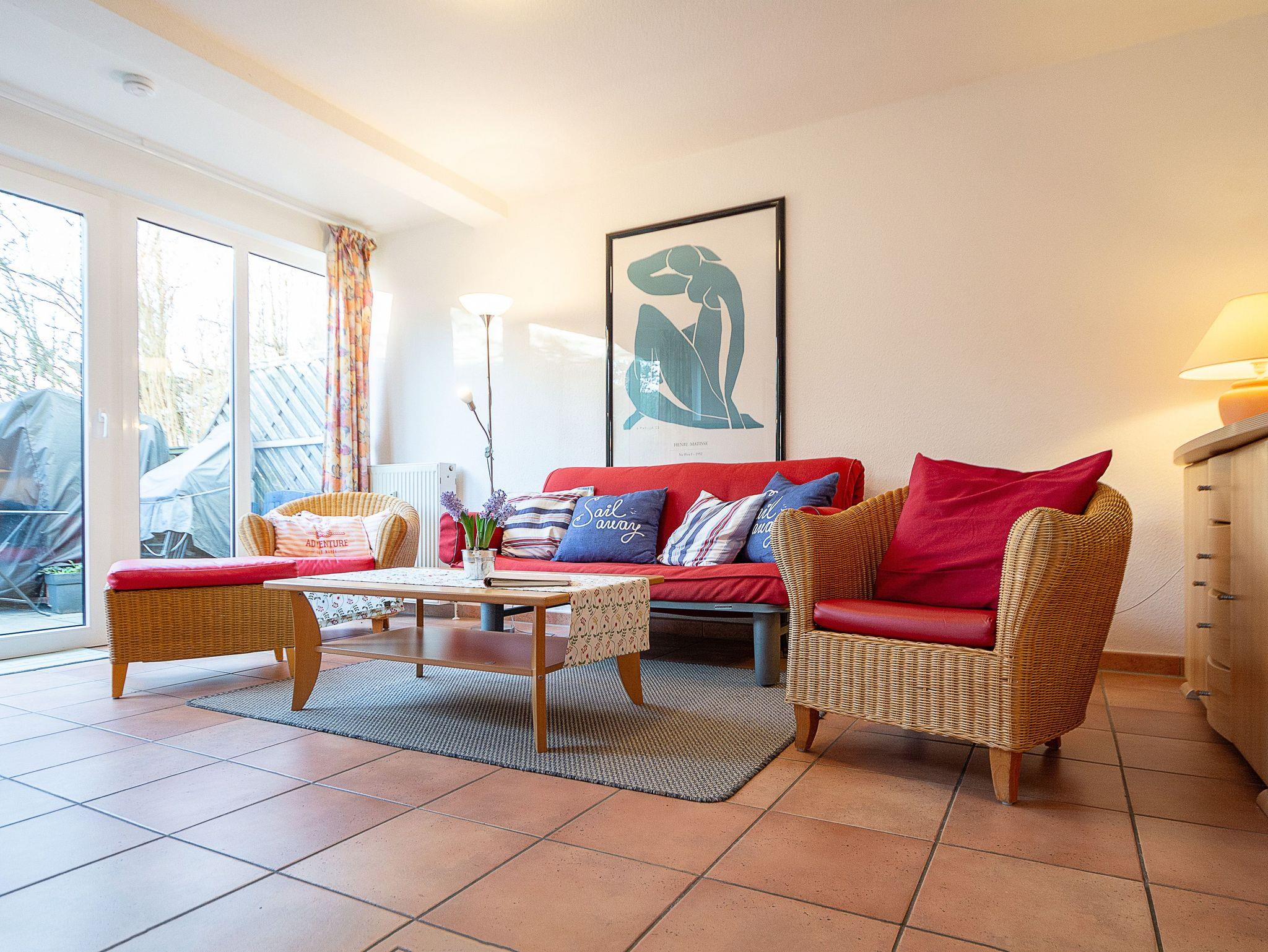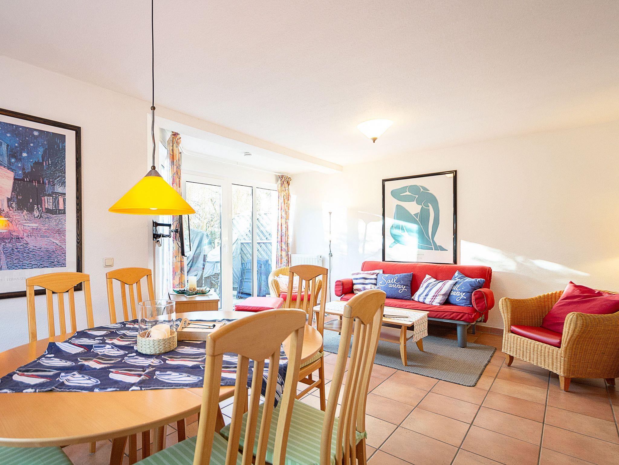 Sie wohnen in einer komfortablen 3-Raum-Ferienwohnung von ca. 59 qm Größe, die sich im Erdgeschoss eines Mehrfamilienhauses befindet. Das helle freundliche Wohnzimmer ist ausgestattet mit einer Sitzgruppe mit Schlafcouch, Radio und 50-Zoll-Smart-TV mit DAB+ und Bluetooth Schnittstelle sowie einem Esstisch und einer offenen Küchenzeile. Die Küche ist ausgestattet mit allen wichtigen Küchengeräten und -utensilien, die Sie für Ihr perfektes Dinner benötigen: 4-Zonen-Ceranfeld mit Backofen und Dunstabzug, Geschirrspüler, Kühlschrank mit Gefrierfach, Wasserkocher, Kaffeemaschine und Toaster sowie ausreichend Kochutensilien, Geschirr und Besteck sind vorhanden. Vom Wohnraum aus betreten Sie die Terrasse, die in Richtung Süden ausgerichtet ist. Hier können nach einem erlebnisreichen Tag am Strand Ihren Abend zu einem Gläschen Wein im Strandkorb oder auf der Sitzgruppe ausklingen lassen. Ein Schlafzimmer mit Doppelbett (180cm x 200cm) und Smart-TV, ein Schlafzimmer mit Französischem Bett (140cm x 200cm) sowie das Bad mit Dusche und WC vervollständigen das Gesamtbild dieser Wohnung.