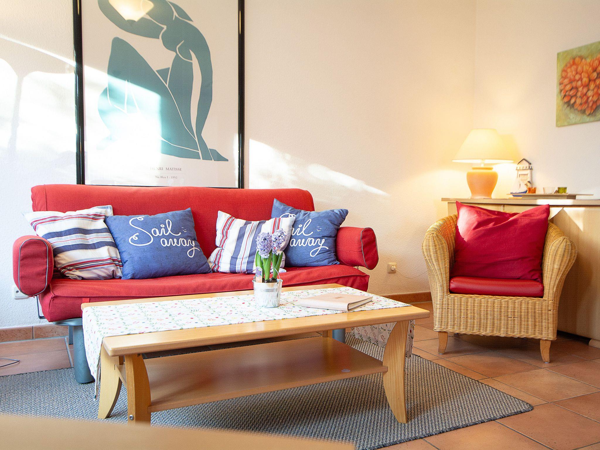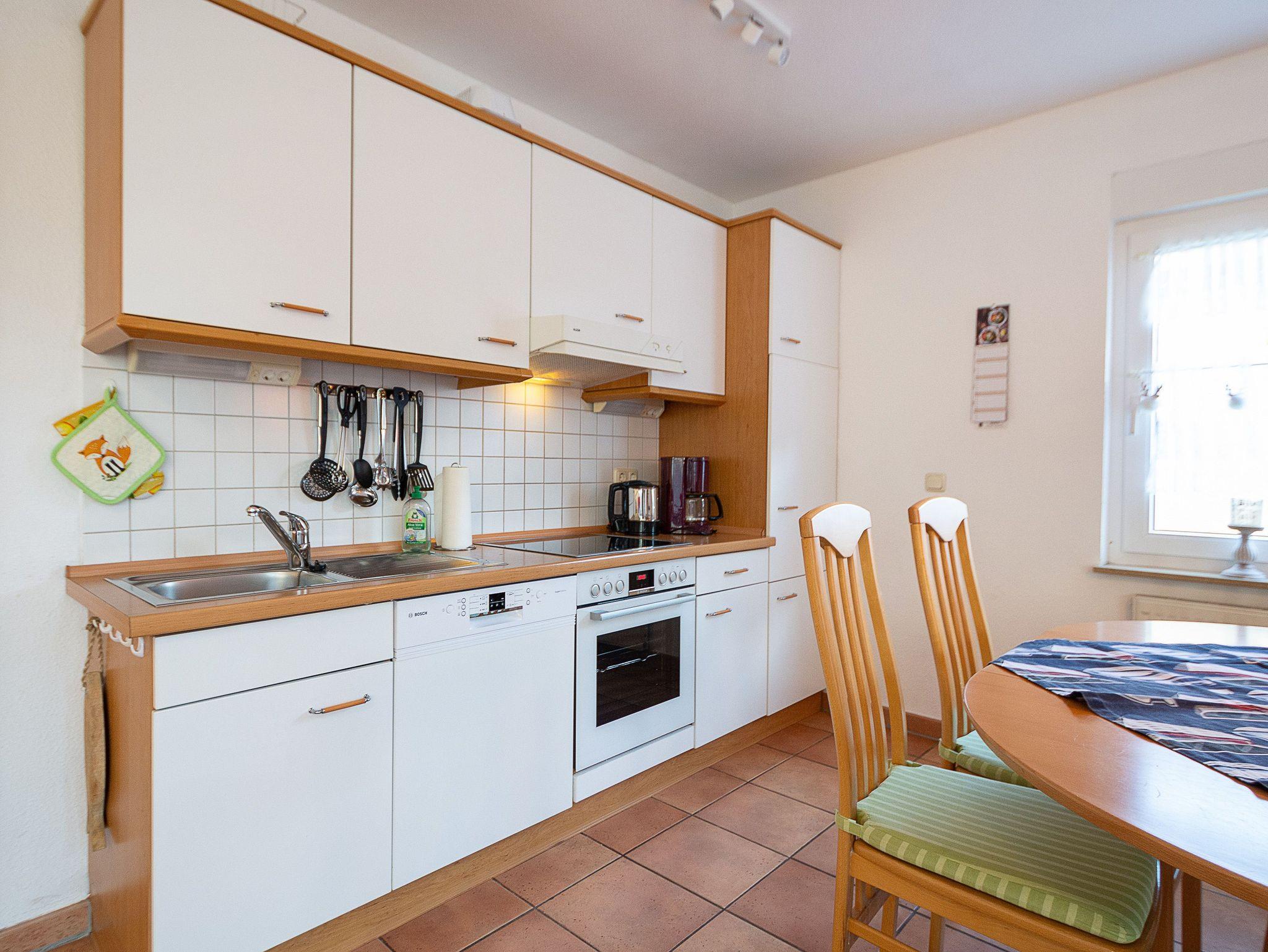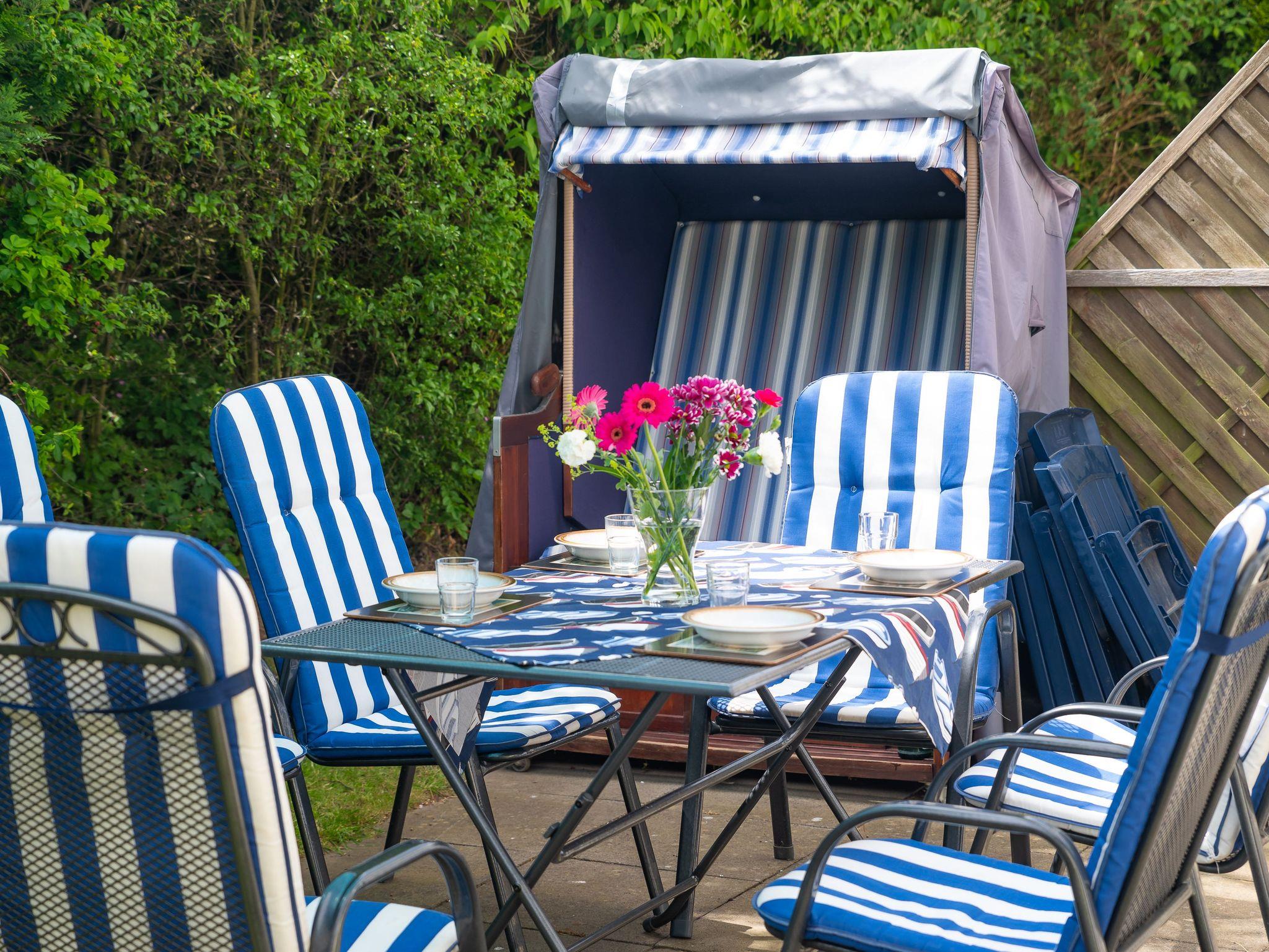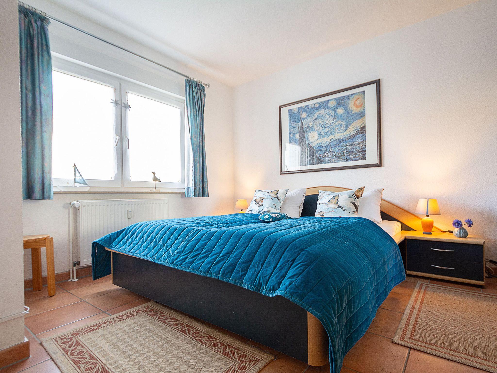 Sie wohnen in einer komfortablen 3-Raum-Ferienwohnung von ca. 59 qm Größe, die sich im Erdgeschoss eines Mehrfamilienhauses befindet. Das helle freundliche Wohnzimmer ist ausgestattet mit einer Sitzgruppe mit Schlafcouch, Radio und 50-Zoll-Smart-TV mit DAB+ und Bluetooth Schnittstelle sowie einem Esstisch und einer offenen Küchenzeile. Die Küche ist ausgestattet mit allen wichtigen Küchengeräten und -utensilien, die Sie für Ihr perfektes Dinner benötigen: 4-Zonen-Ceranfeld mit Backofen und Dunstabzug, Geschirrspüler, Kühlschrank mit Gefrierfach, Wasserkocher, Kaffeemaschine und Toaster sowie ausreichend Kochutensilien, Geschirr und Besteck sind vorhanden. Vom Wohnraum aus betreten Sie die Terrasse, die in Richtung Süden ausgerichtet ist. Hier können nach einem erlebnisreichen Tag am Strand Ihren Abend zu einem Gläschen Wein im Strandkorb oder auf der Sitzgruppe ausklingen lassen. Ein Schlafzimmer mit Doppelbett (180cm x 200cm) und Smart-TV, ein Schlafzimmer mit Französischem Bett (140cm x 200cm) sowie das Bad mit Dusche und WC vervollständigen das Gesamtbild dieser Wohnung.