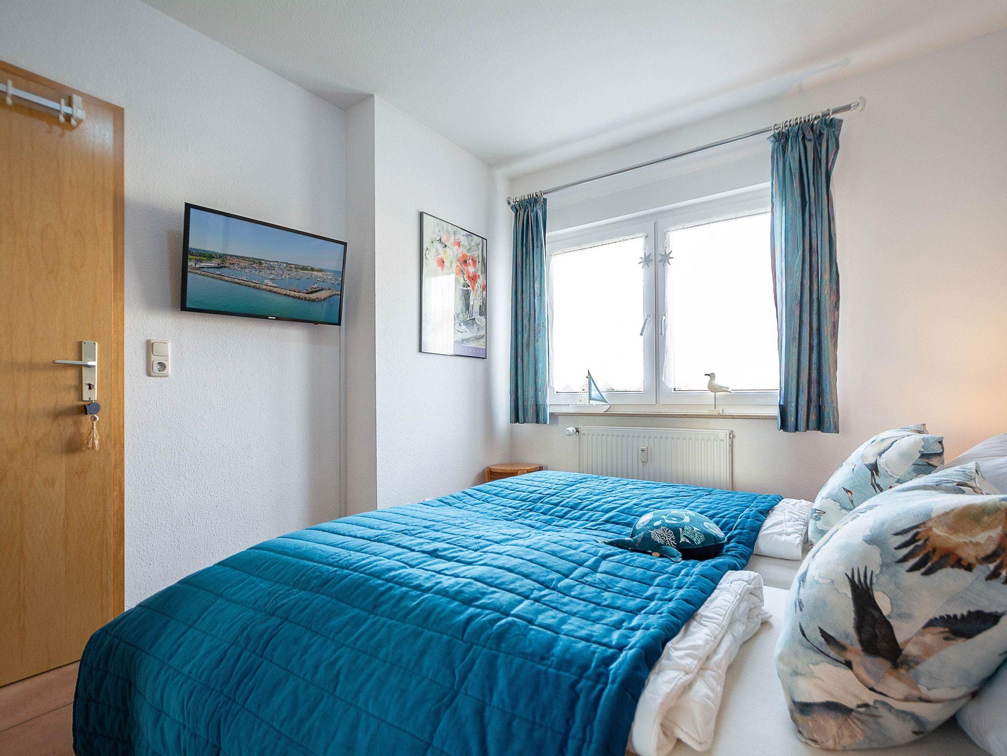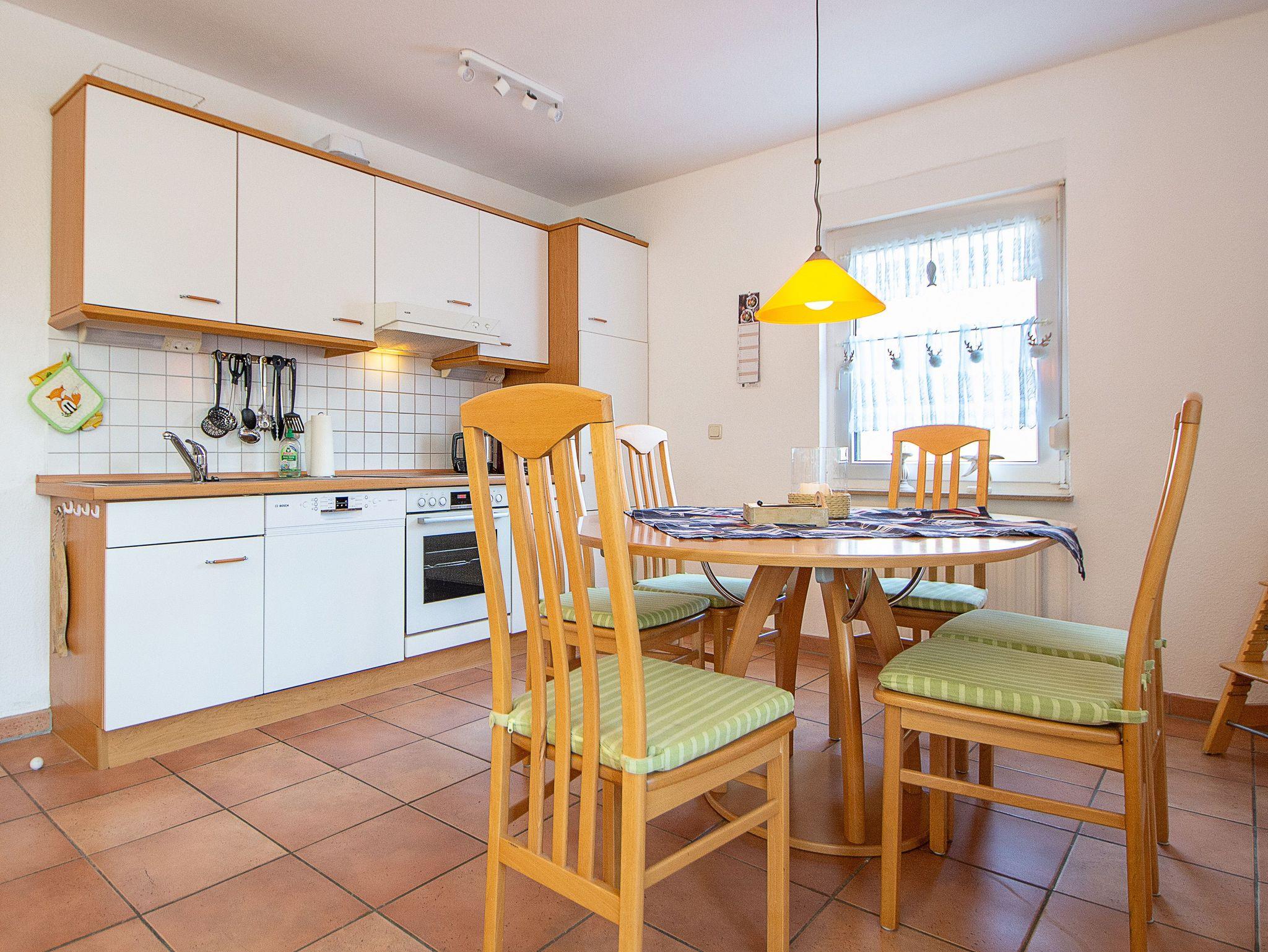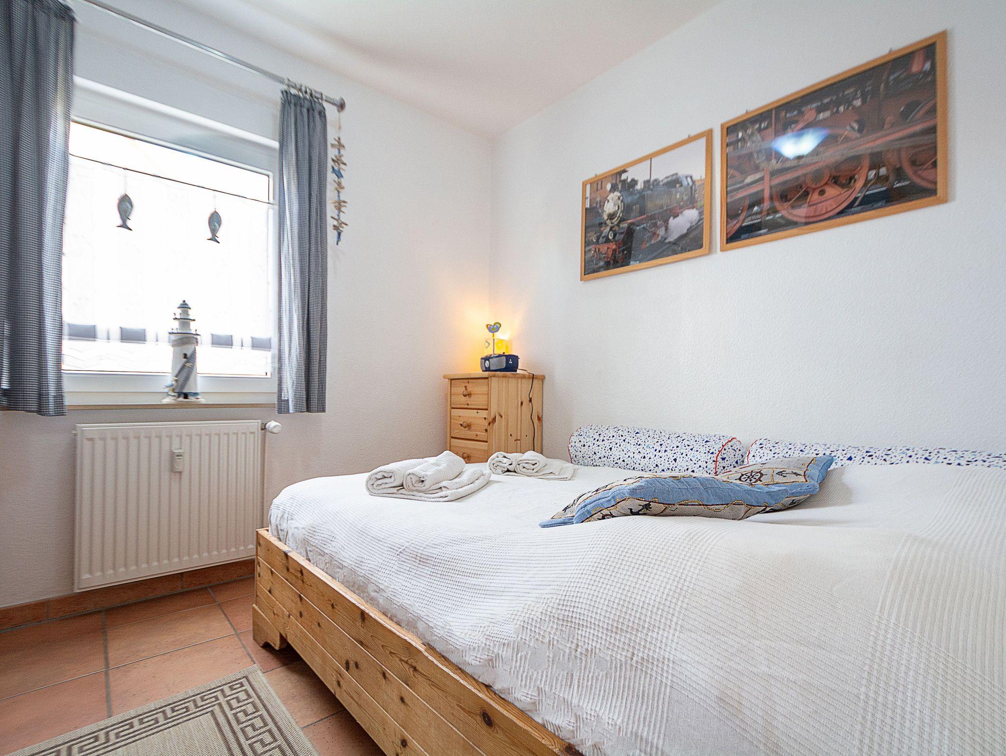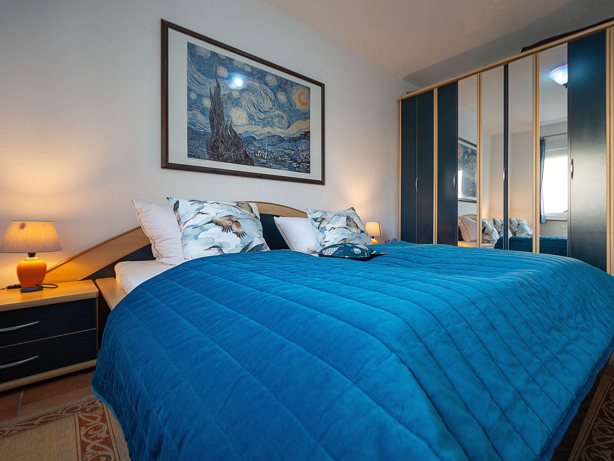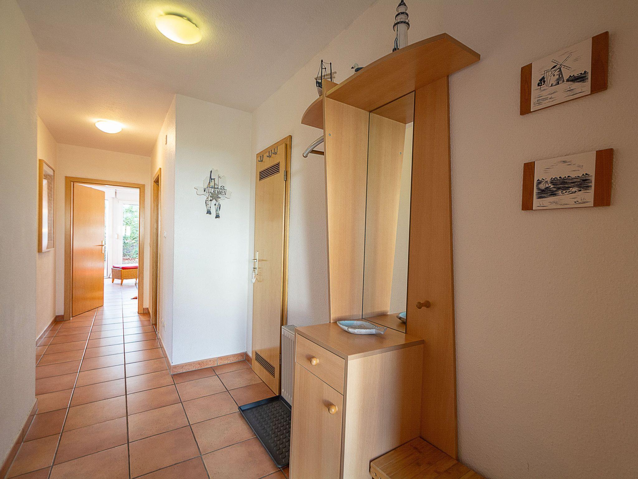 Sie wohnen in einer komfortablen 3-Raum-Ferienwohnung von ca. 59 qm Größe, die sich im Erdgeschoss eines Mehrfamilienhauses befindet. Das helle freundliche Wohnzimmer ist ausgestattet mit einer Sitzgruppe mit Schlafcouch, Radio und 50-Zoll-Smart-TV mit DAB+ und Bluetooth Schnittstelle sowie einem Esstisch und einer offenen Küchenzeile. Die Küche ist ausgestattet mit allen wichtigen Küchengeräten und -utensilien, die Sie für Ihr perfektes Dinner benötigen: 4-Zonen-Ceranfeld mit Backofen und Dunstabzug, Geschirrspüler, Kühlschrank mit Gefrierfach, Wasserkocher, Kaffeemaschine und Toaster sowie ausreichend Kochutensilien, Geschirr und Besteck sind vorhanden. Vom Wohnraum aus betreten Sie die Terrasse, die in Richtung Süden ausgerichtet ist. Hier können nach einem erlebnisreichen Tag am Strand Ihren Abend zu einem Gläschen Wein im Strandkorb oder auf der Sitzgruppe ausklingen lassen. Ein Schlafzimmer mit Doppelbett (180cm x 200cm) und Smart-TV, ein Schlafzimmer mit Französischem Bett (140cm x 200cm) sowie das Bad mit Dusche und WC vervollständigen das Gesamtbild dieser Wohnung.