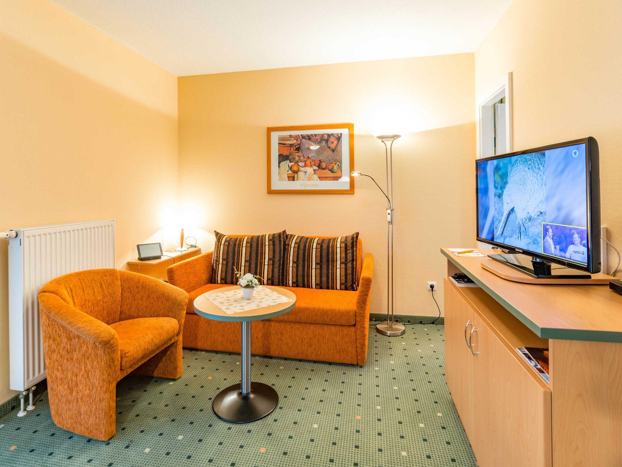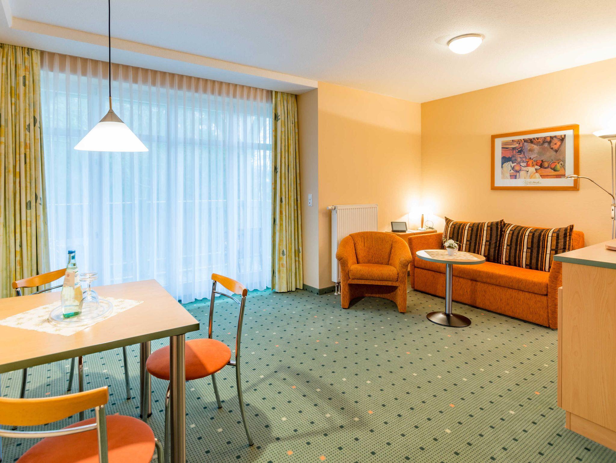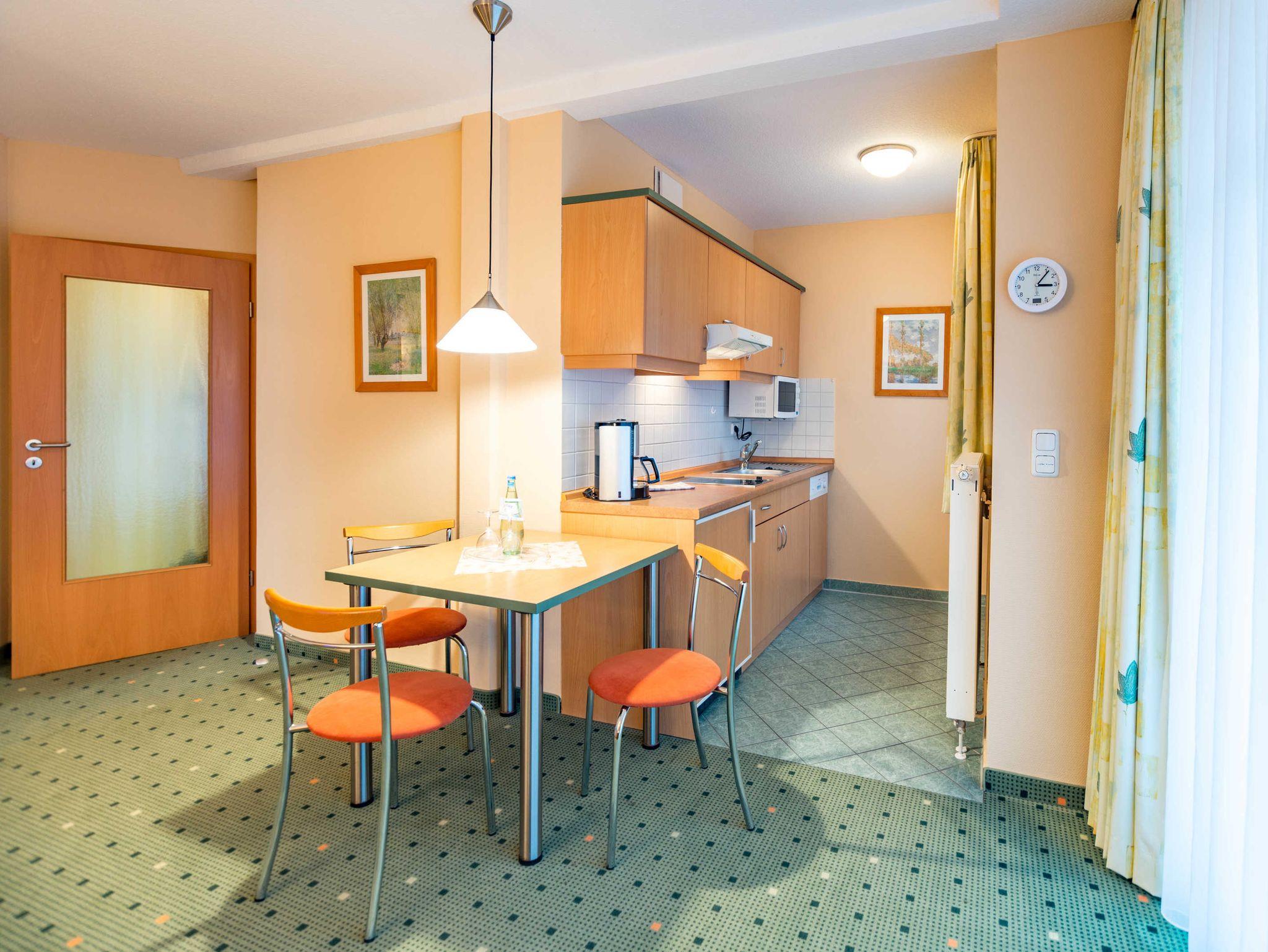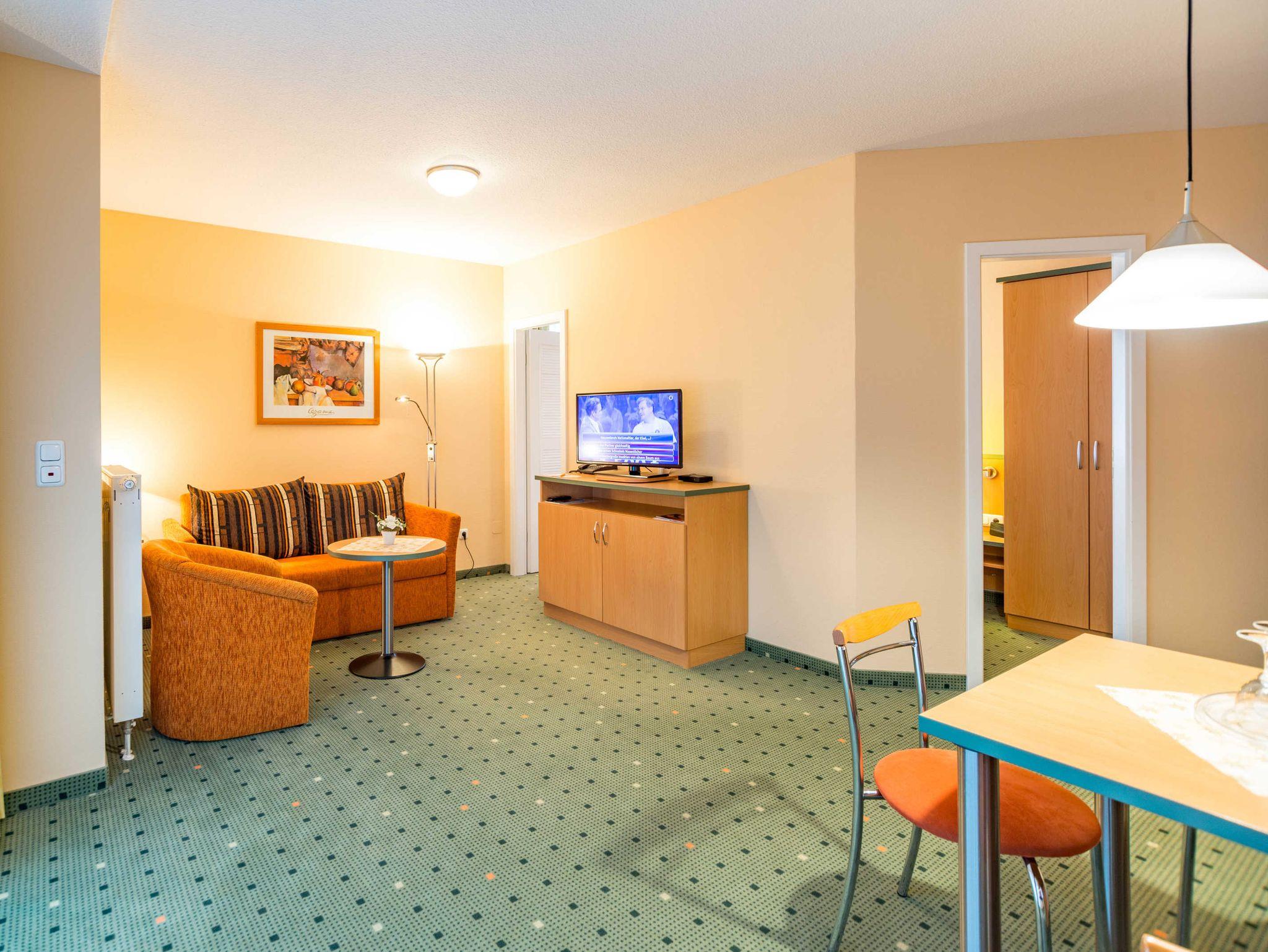 Das 2-Zimmer-Apartment mit Teppichboden befindet sich in der 1.Etage des Apartmenthauses Waldeck. Mit rund 40 m² Wohnfläche und einem Balkon zur Südseite, besteht das Apartment aus einem Wohnzimmer mit Schlafcouch und einer voll ausgestatteten Küchenzeile mit Geschirrspülmaschine, Kühlschrank, Mikrowelle, Zwei-Platten-Cerankochfeld, Kaffeemaschine, Wasserkocher und einem Toaster. Das Schlafzimmer verfügt über ein Doppelbett. Sowohl im Wohnzimmer als auch im Schlafzimmer befindet sich ein moderner Flachbildschirm. Im Badezimmer befindet sich eine Badewanne, ein Fön wird Ihnen zur Verfügung gestellt. Das Apartment ist für maximal 2 Erwachsene und insgesamt 3 Personen geeignet, auch Hunde sind gestattet.