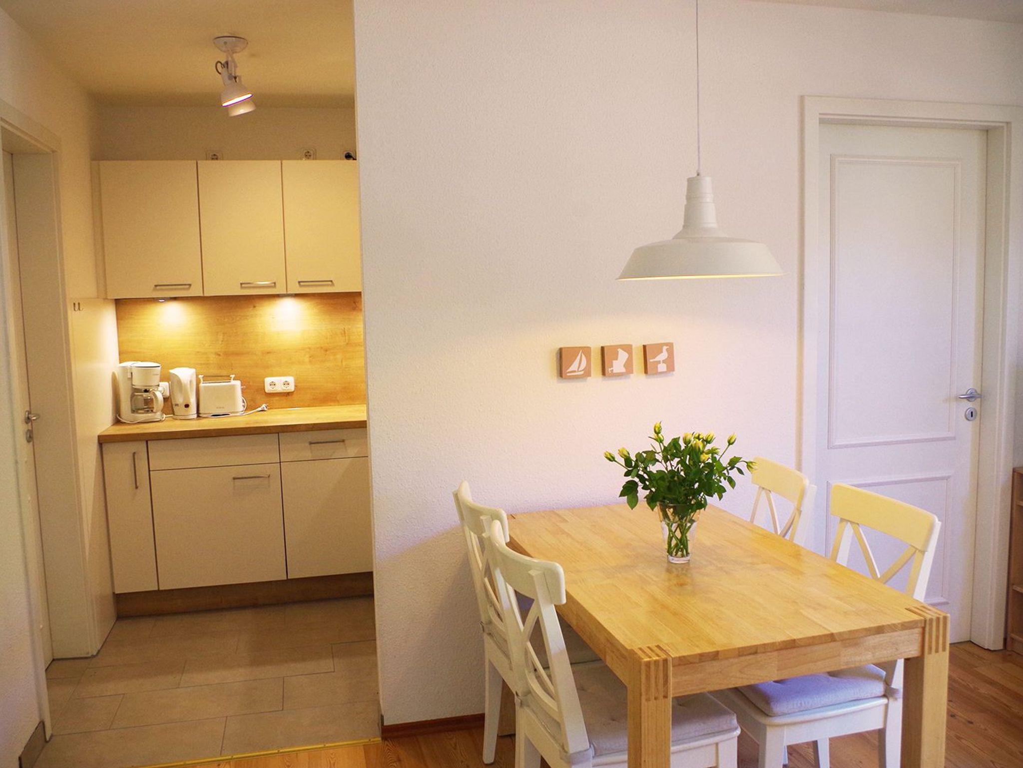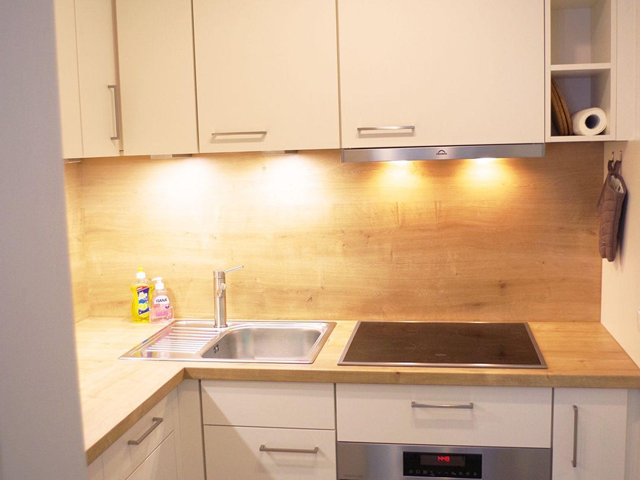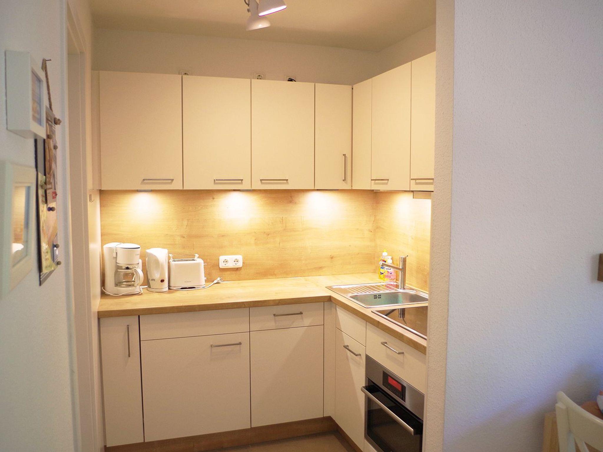 Die Einbauküche (mit Geschirrspüler, Mikrowelle, Wasserkocher, Toaster, Kaffeemaschine, Backofen und 4-Platten-Ceranfeld) ist - optisch getrennt - ebenfalls in den Wohnbereich integriert.