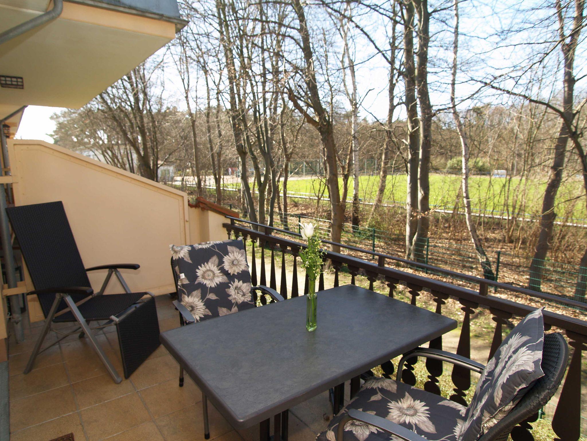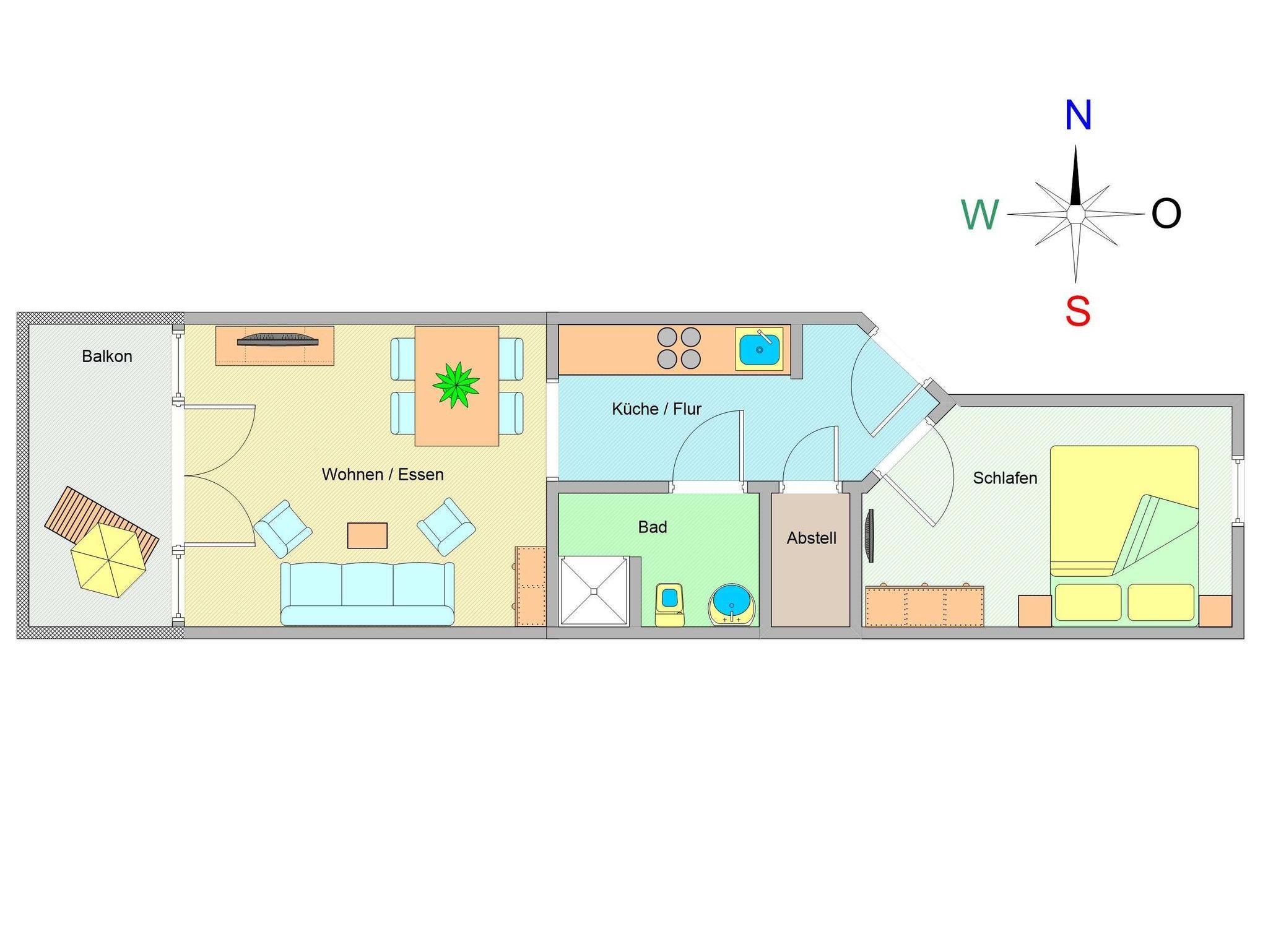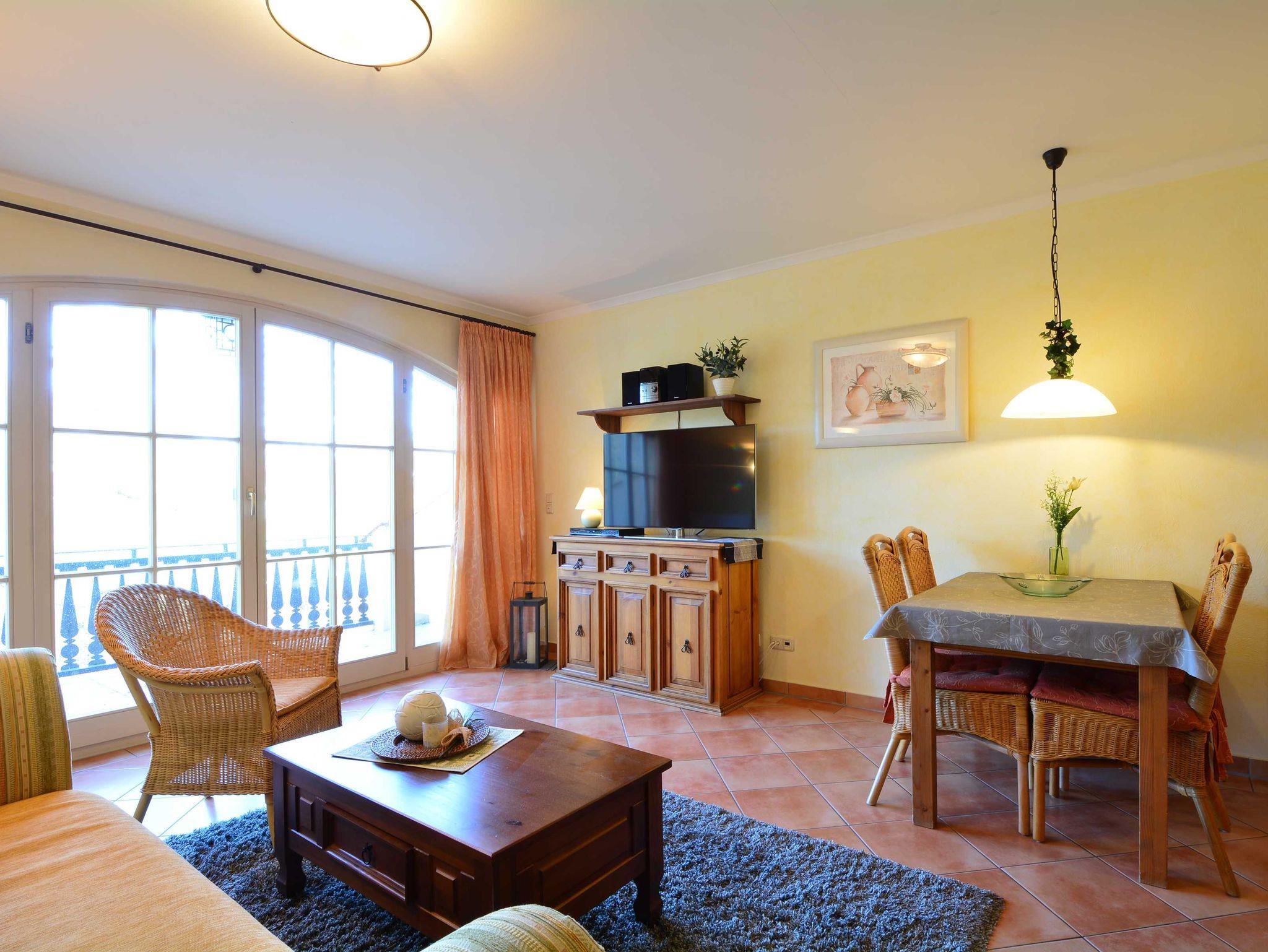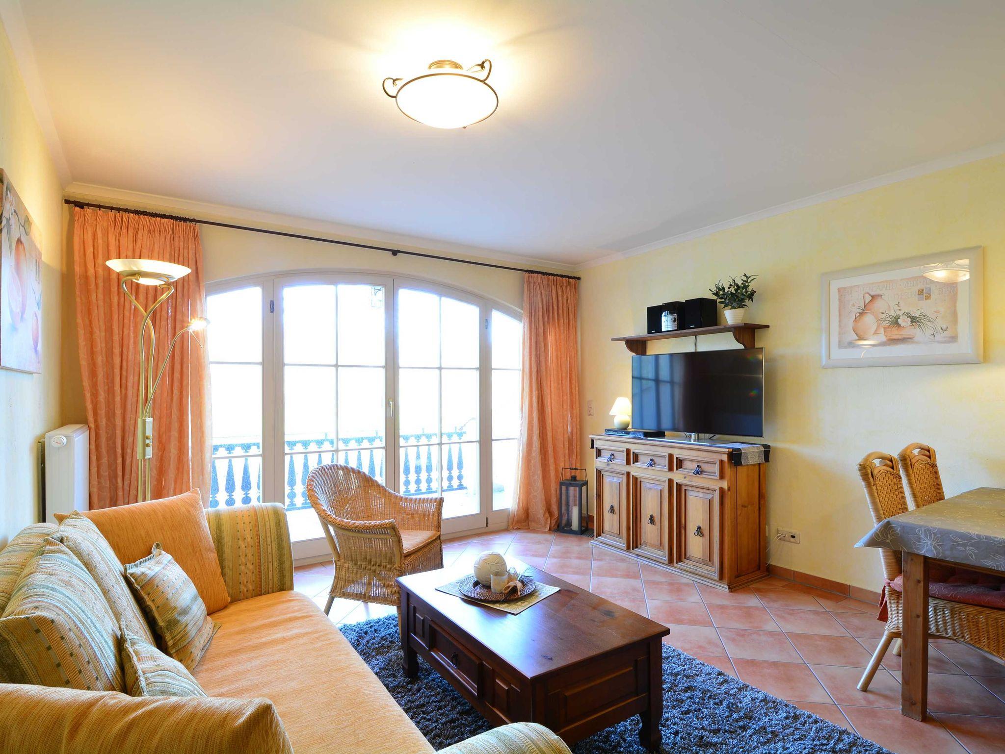 Herzlich willkommen in der Wohnung Nr. 34 in der Residenz Laguna. Die etwa 53 qm große 2-Raum-Ferienwohnung ist für 2 Personen optimal geeignet und befindet sich im Hinterhaus der Appartementanlage im 1. Obergeschoss. Es empfangen Sie eine offen gestaltete Küchenzeile und Essbereich sowie der mediterran gestaltete Wohnraum mit Zugang zum Westbalkon mit Blick auf den Kühlungsborner Stadtwald. Der Wohnraum ist ausgestattet mit einer Schlafcouch (für weitere 2 Personen), Flachbild-TV, Stereoanlage und einem Essplatz. Die Küchenzeile ist ausgestattet u.a. mit einer Mikrowelle, Geschirrspüler, Ceranfeld, Backofen, Kühlschrank mit Gefrierfach, Wasserkocher, Kaffeemaschine und Toaster. Das gemütliche Schlafzimmer mit einem großen Doppelbett, Kleiderschrank und 2. Flachbild-TV sowie das Bad mit Dusche und WC vervollständigen das Gesamtbild dieser Wohnung. Der gut organisierte Abstellraum beinhaltet viel Stauraum für Ihr Gepäck, Bügelbrett und Bügeleisen, Wäscheständer und Staubsauger.