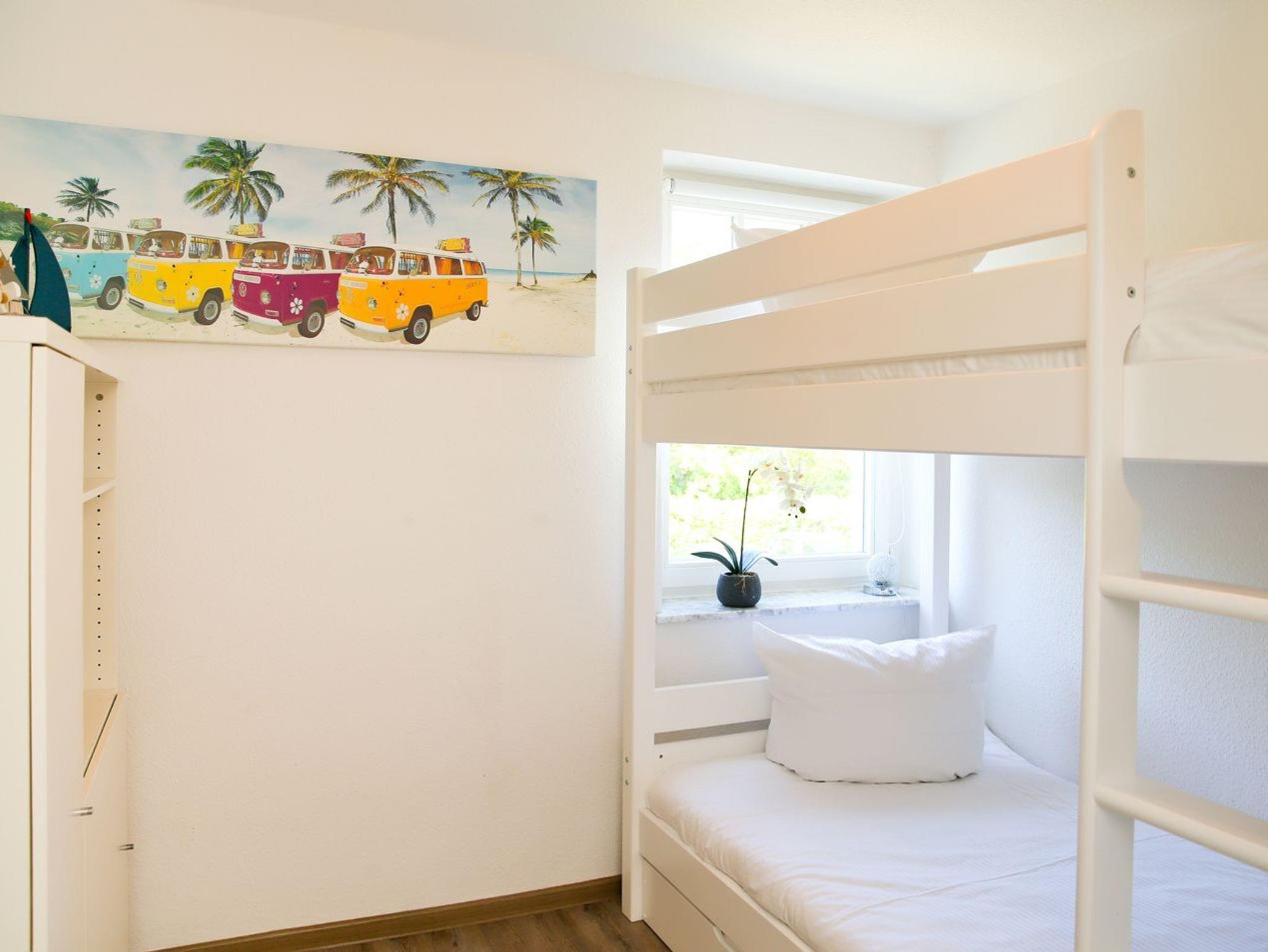 Ein Schlafzimmer ist mit einem Flachbildfernseher, Doppelbett und einem dreitürigen Kleiderschrank ausgestattet das zweite mit Etagenbett und Schrank für die ganz kleinen Gäste ist ein Babybett und Hochstuhl vorhanden.