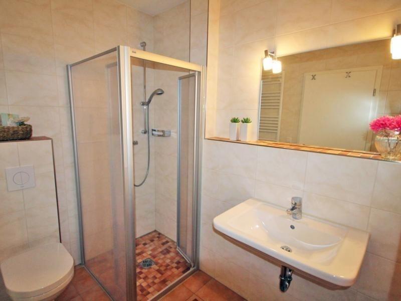 Das geflieste Badezimmer ist mit einer Dusche, Waschbecken und WC ausgestattet. Hier haben Sie genügend Platz zum Verstauen Ihrer Kosmetika.